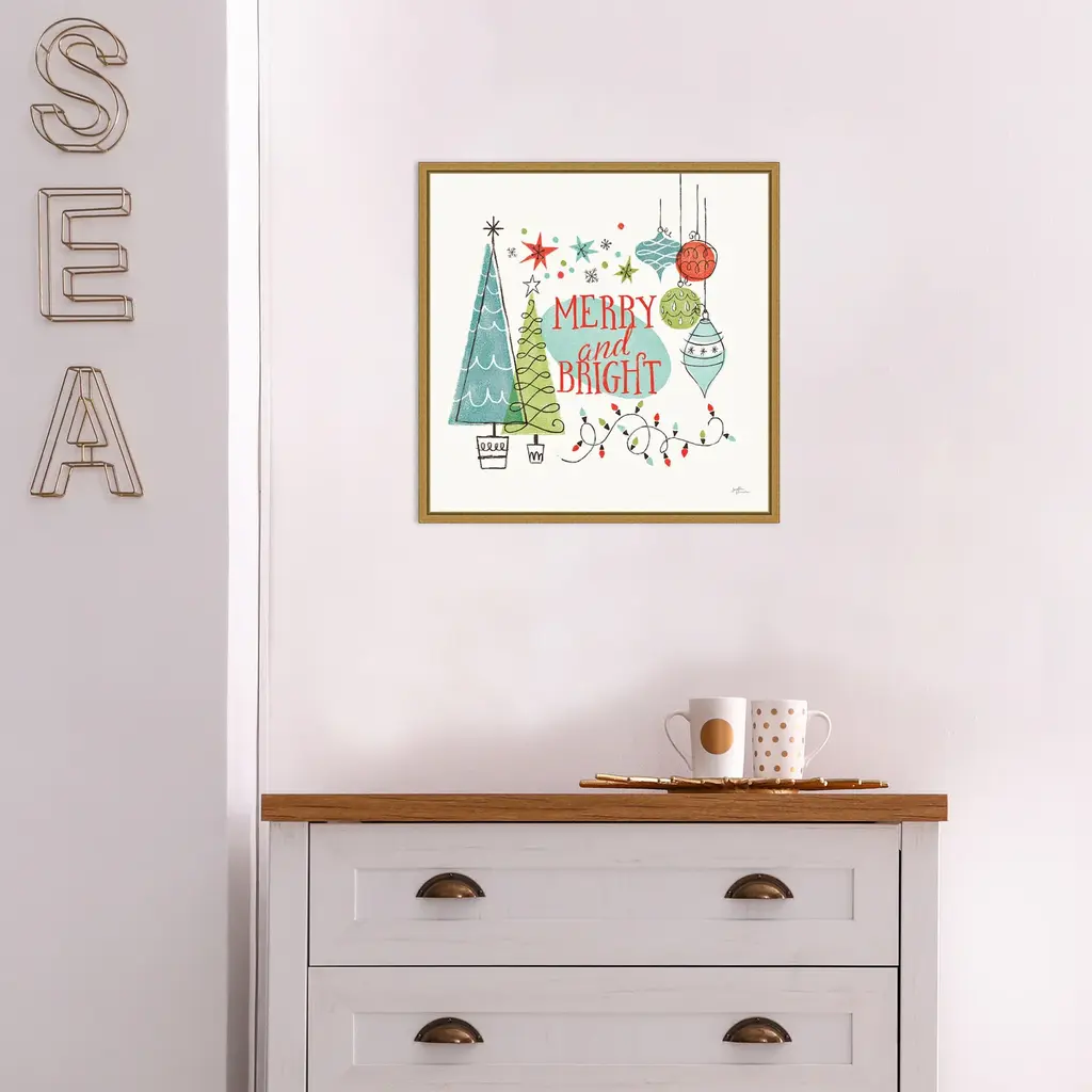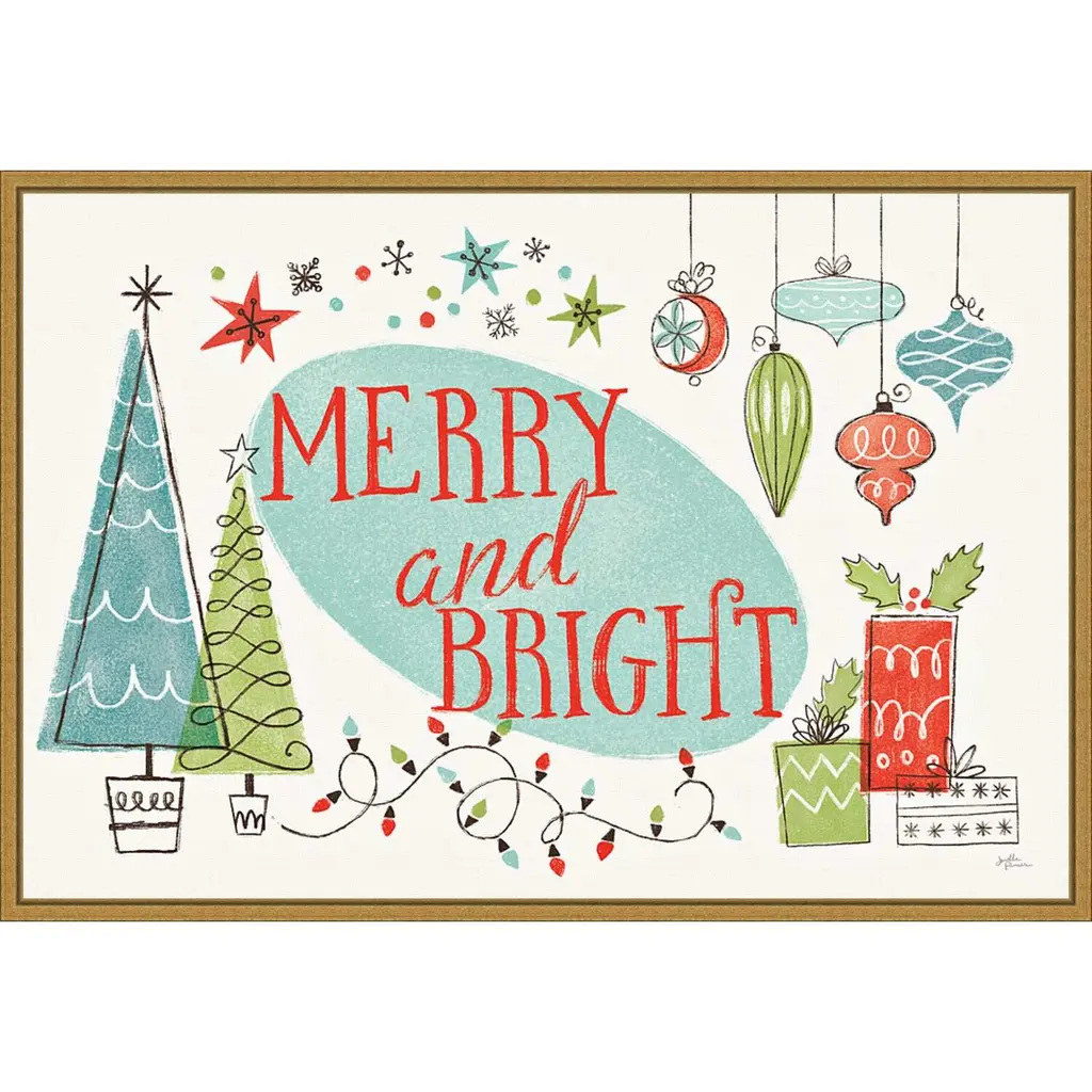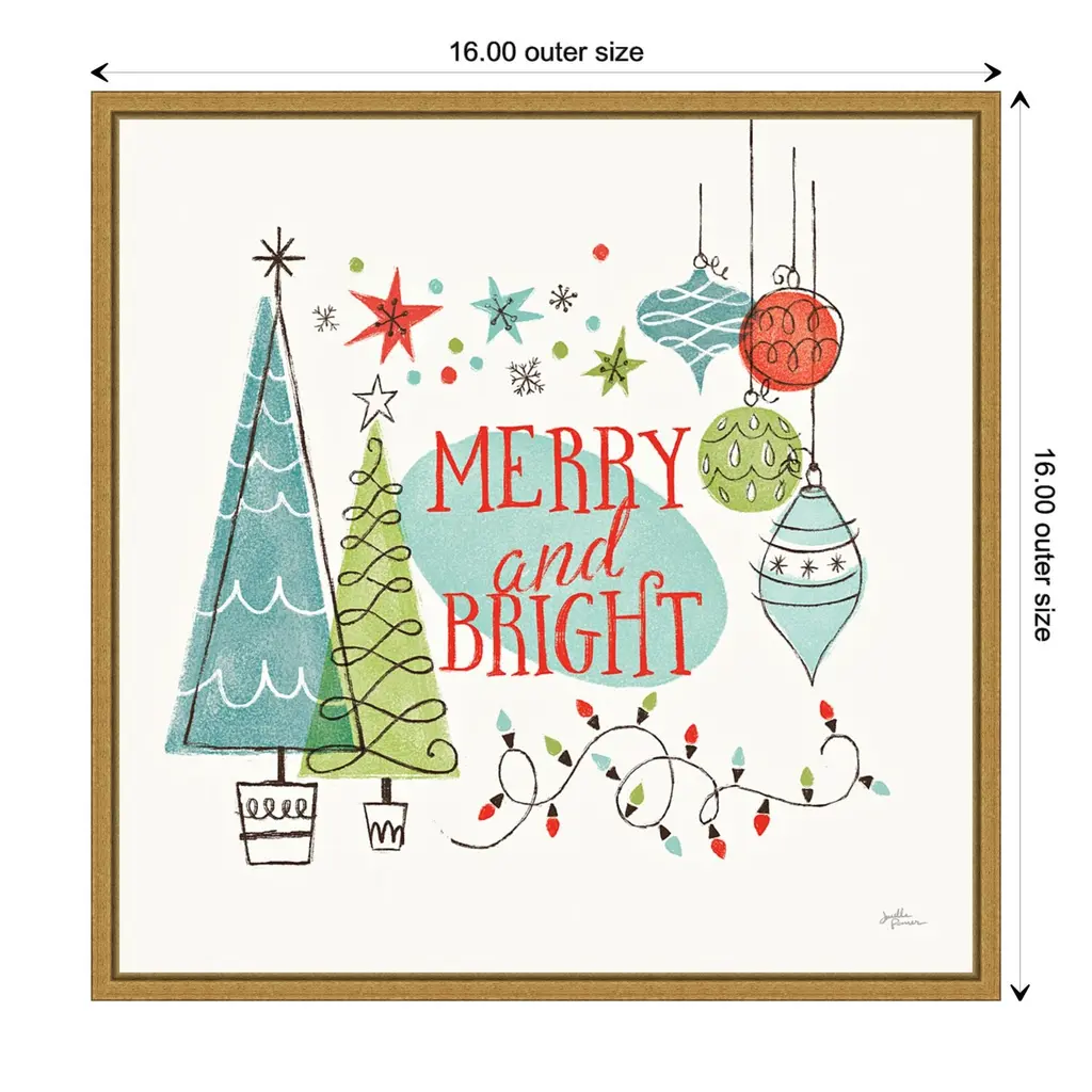 This vintage stylized painting offers mid-century, jazzy charm. Black line art of trees, gifts, stars, ornaments and lights are presented in a funky style with color blocking set on a light brown background. In the center, a turquoise oval features "MERRY AND BRIGHT" in red, stylish lettering for a Yuletide that is both merry and funky.Features:FLOAT FRAMED CANVAS ART: Canvas is framed in a floated style that showcases a narrow gap between the edge of the gallery wrapped canvas and the frame. The wrapped canvas appears as if it's "floating" on the frame. The overall look is clean, modern and upscale.QUALITY: Canvas is printed with high quality, fade-resistant inks and stretched to hide corner folds. Canvas is stretched across a solid surface to resist sagging.AUTHENTICITY: Canvas is printed and professionally framed in Madison, Wisconsin USA with authentically licensed artwork.EFFORTLESS HANGING: Ready to hangfor easy installation. The metal sawtooth hangers come attached on the inset back for easy wall display.CUSTOM PACKAGED: Canvas is custom packaged for protection in shipment to arrive without damage.Details:Artist: Janelle PennerTitle: Merry and Bright Christmas TreeProduct type: Framed Canvas BoxStyle: Modern ContemporaryFormat: landscapeSize: SmallSubject: VintageFrame: Sylvie Gold .5"