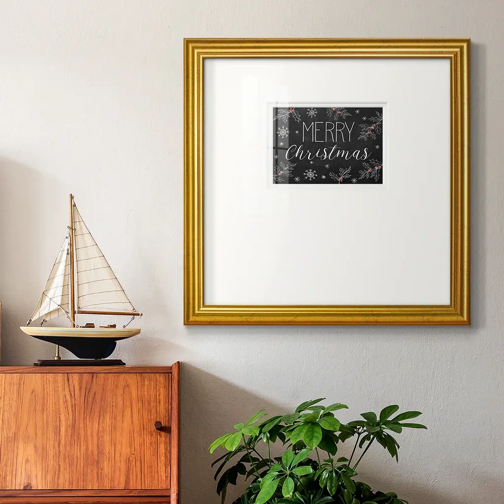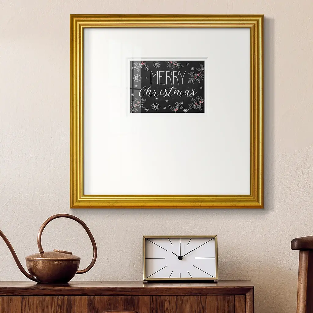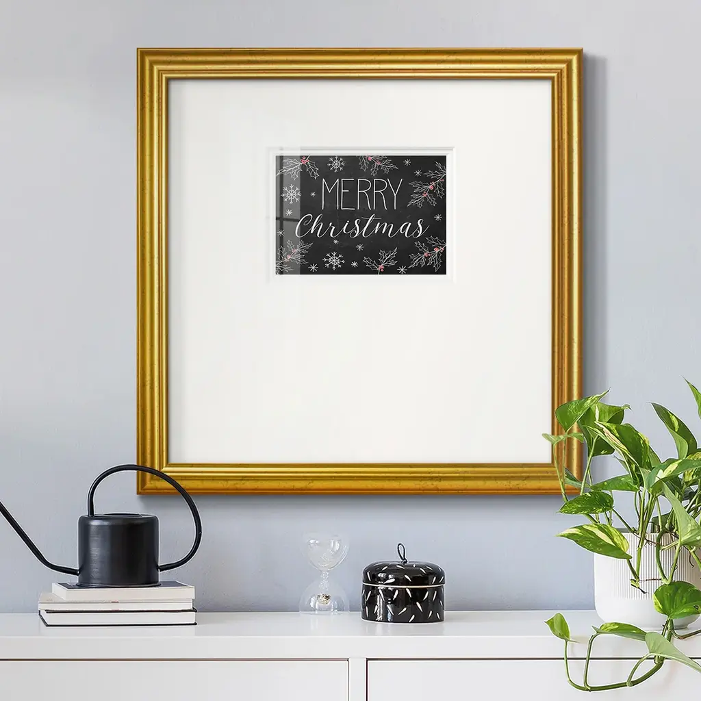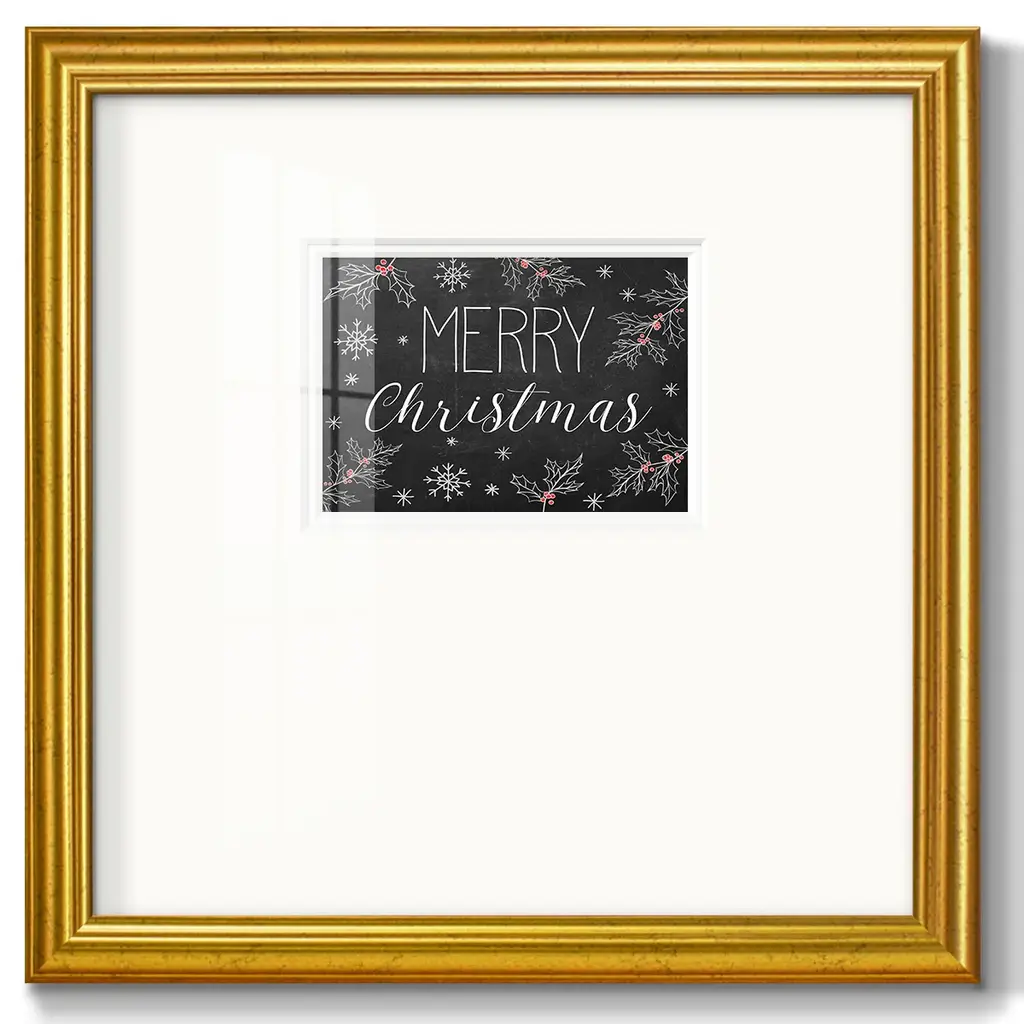 Merry Christmas ChalkboardPremium Framed Print A framed cold pressed paper print featuring superior double matting and quality frame. 2 SIZES AVAILABLE 16''X16''' - Overall Size 20''X20''' - Overall Size Each piece is made to order. Each piece comes with hanging hardware. Made in the USA Ready to Hang Giclee Paper Print Plexiglass Beveled Matt Board Double Matte Board