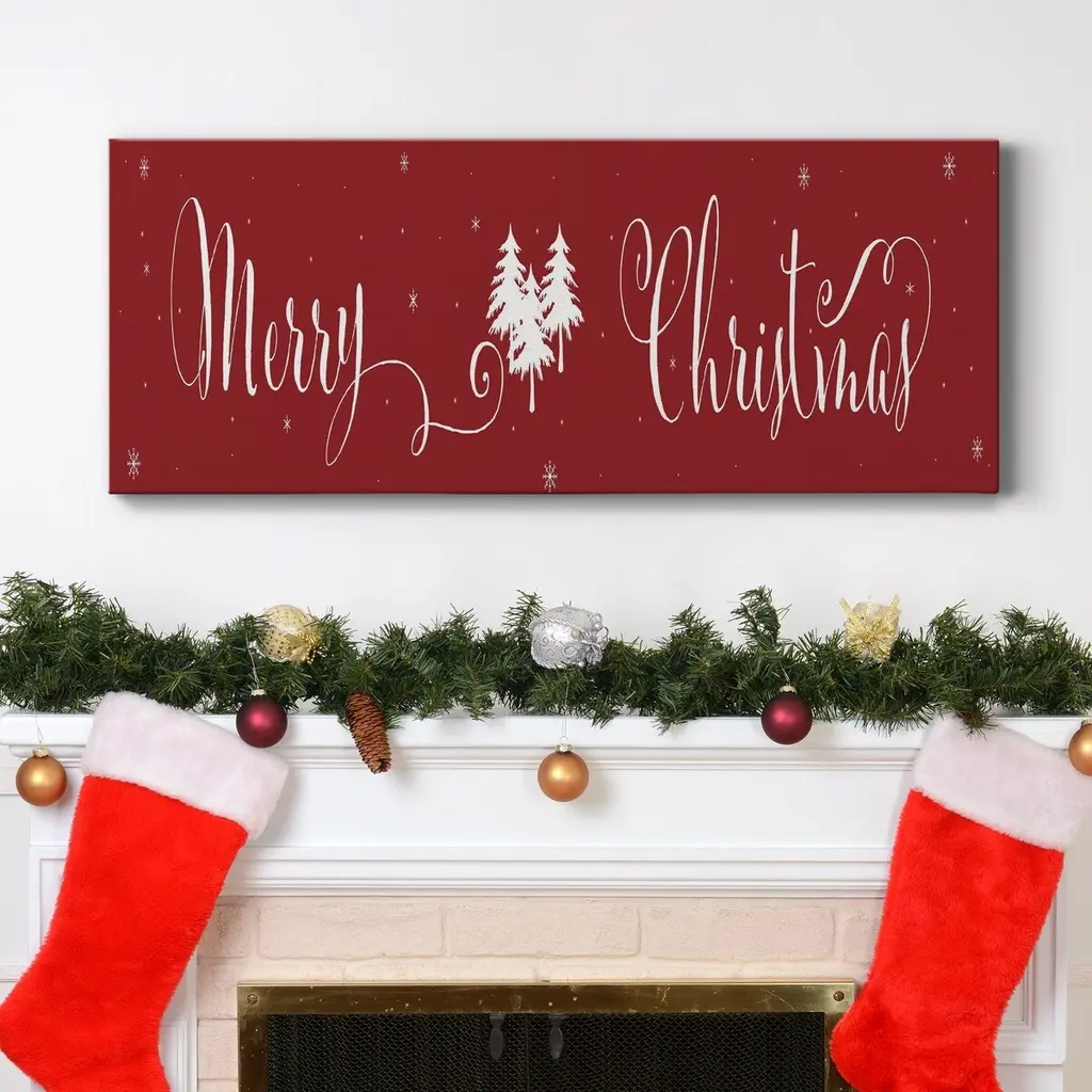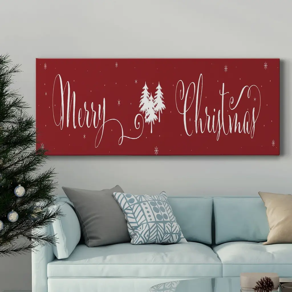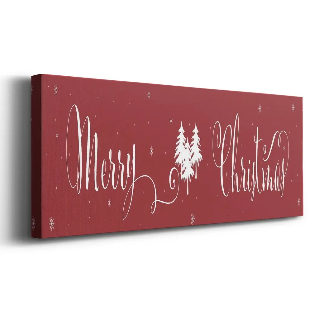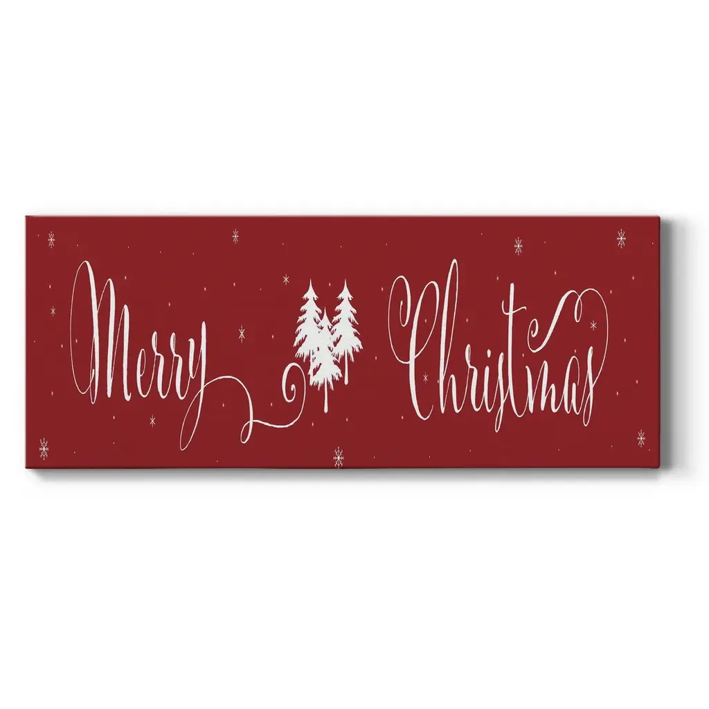 Merry Christmas Premium Gallery Wrapped Canvas - Ready to Hang A premium hand stretched gallery wrapped canvas print created to last. Featuring a beveled solid wood stretcher bar. 3 SIZES AVAILABLE 8'' X 20'' - Overall Size 12'' X 30'' - Overall Size 20'' X 50'' - Overall Size Each piece is made to order. Built to Last Each piece comes ready to hang Solid wood stretcher Fade and Water resistant Made domestically
