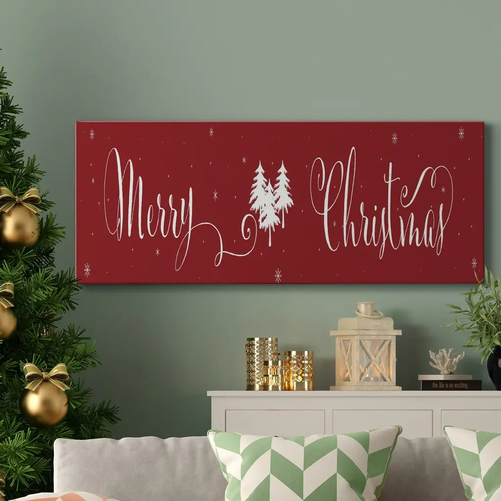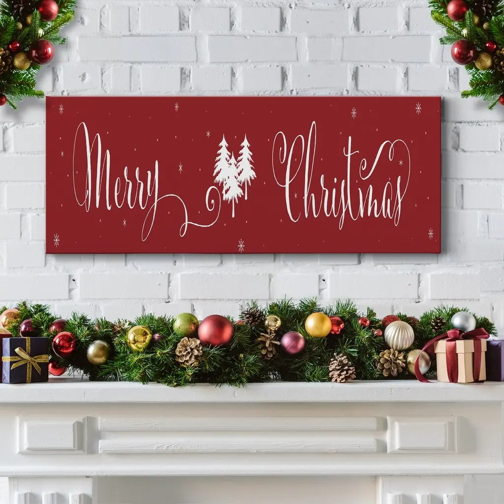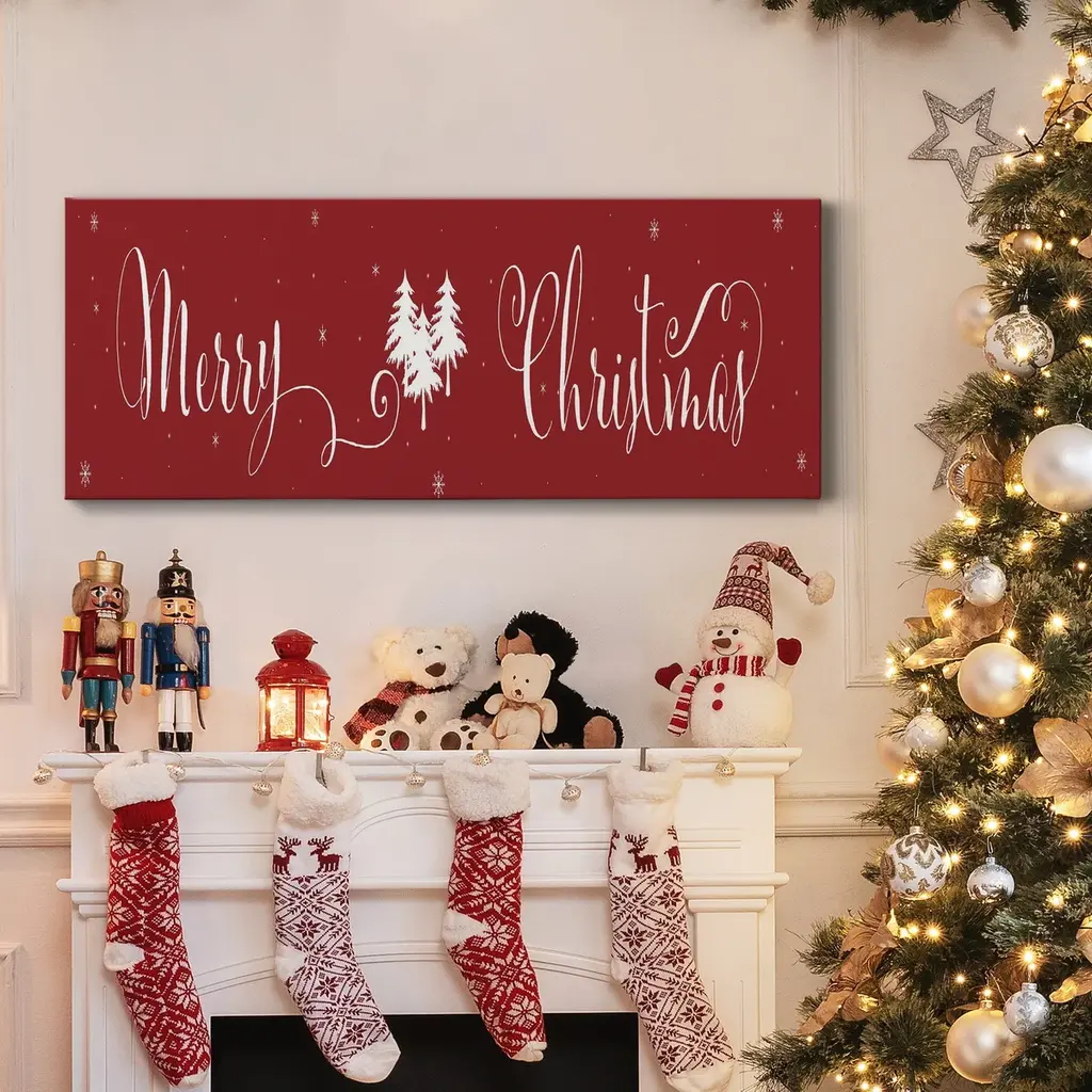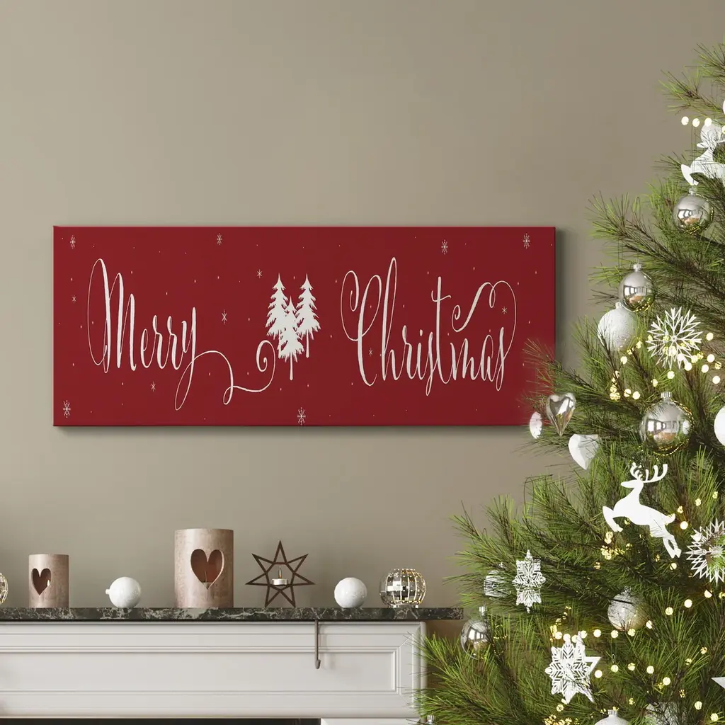 Merry Christmas Premium Gallery Wrapped Canvas - Ready to Hang A premium hand stretched gallery wrapped canvas print created to last. Featuring a beveled solid wood stretcher bar. 3 SIZES AVAILABLE 8'' X 20'' - Overall Size 12'' X 30'' - Overall Size 20'' X 50'' - Overall Size Each piece is made to order. Built to Last Each piece comes ready to hang Solid wood stretcher Fade and Water resistant Made domestically