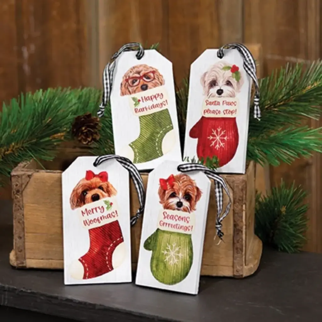 Specifications:Description:The Merry Woofmas Tag Ornaments are an assortment of four decorative wooden cutout ornaments with a painted white finish. The ornaments each feature a red or green stocking or mitten, along with dog artwork and a Christmas message. One reads “Happy Barkidays!”, another reads “Merry Woofmas!”, a third reads “Seasons Grrreetings!”, and the fourth reads “Santa Paws please stop!”. The ornaments each include a black and white plaid ribbon hanger, to use for display on a Christmas tree, perfect for adding to any dog-lover's home during the holidays!