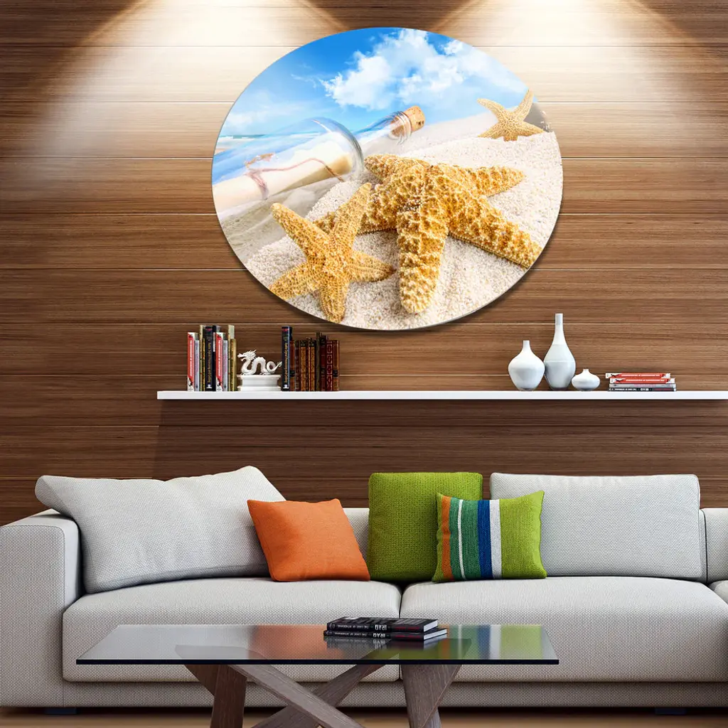 Message In Bottle Buried In Sand, Seashore Disc Metal Wall Art, 11"