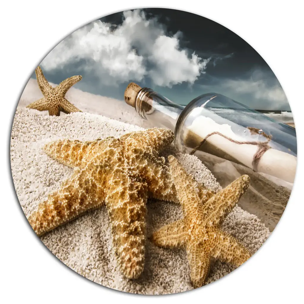 Bring Contemporary Abstraction to your home with this large Circle Metal wall art. This Message in Bottle Buried in Sand Metal Artwork makes it the focal point of any room or office. - White Gloss Coating ensures colors are extra vibrant with light reflection.- Aluminum grade Sheet Metal with 1 inch mounting frame on the back giving the illusion that the artwork is floating on the wall..- Mounting Brackets are included along with instructions.- High Quality Digital images are created directly into a glossy aluminum panel producing a stunning and captivating print into the glossy finish of the metal.- Water, Fire and Scratch resistant HD Aluminum panels.- Looks better than any photo paper and guaranteed to last at least 20 years- Easy to clean with a microfiber cloth. Colors are far superior to regular Canvas Art. - Easy to Hang