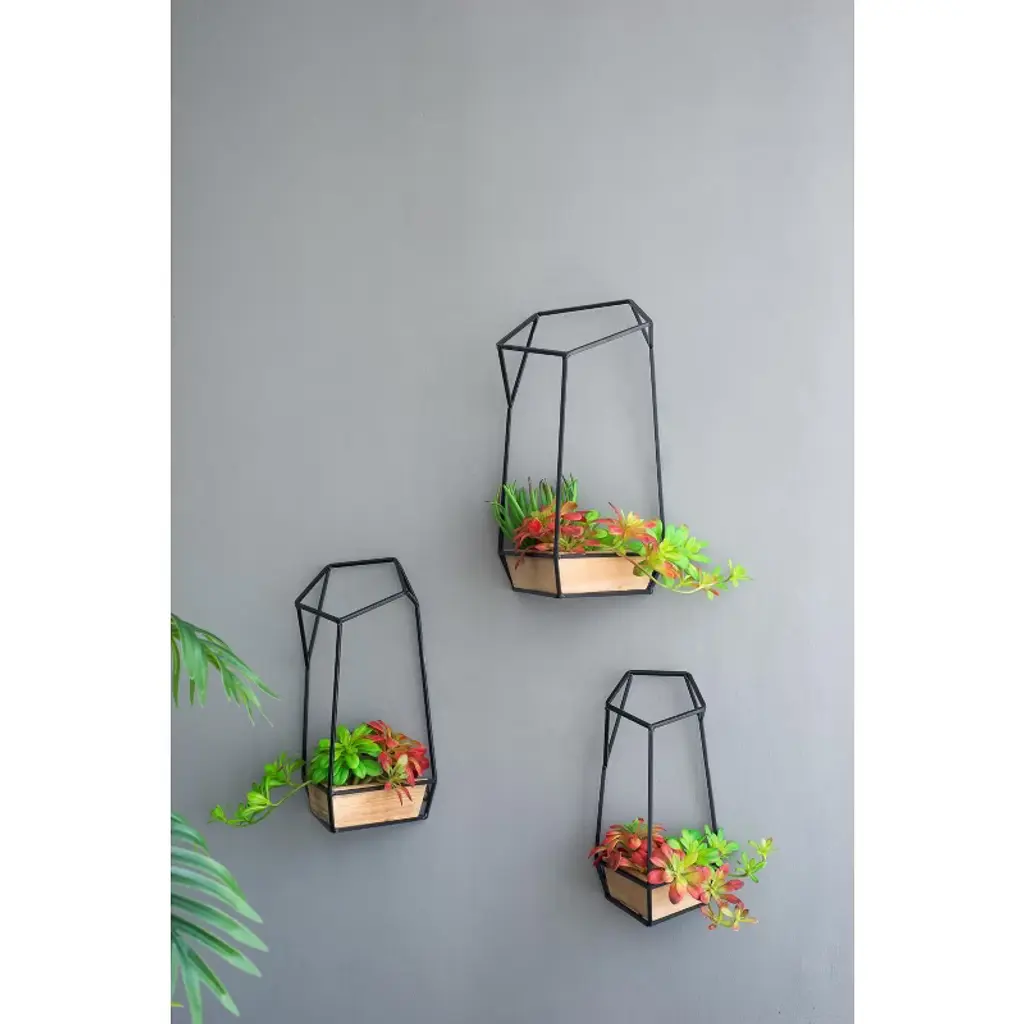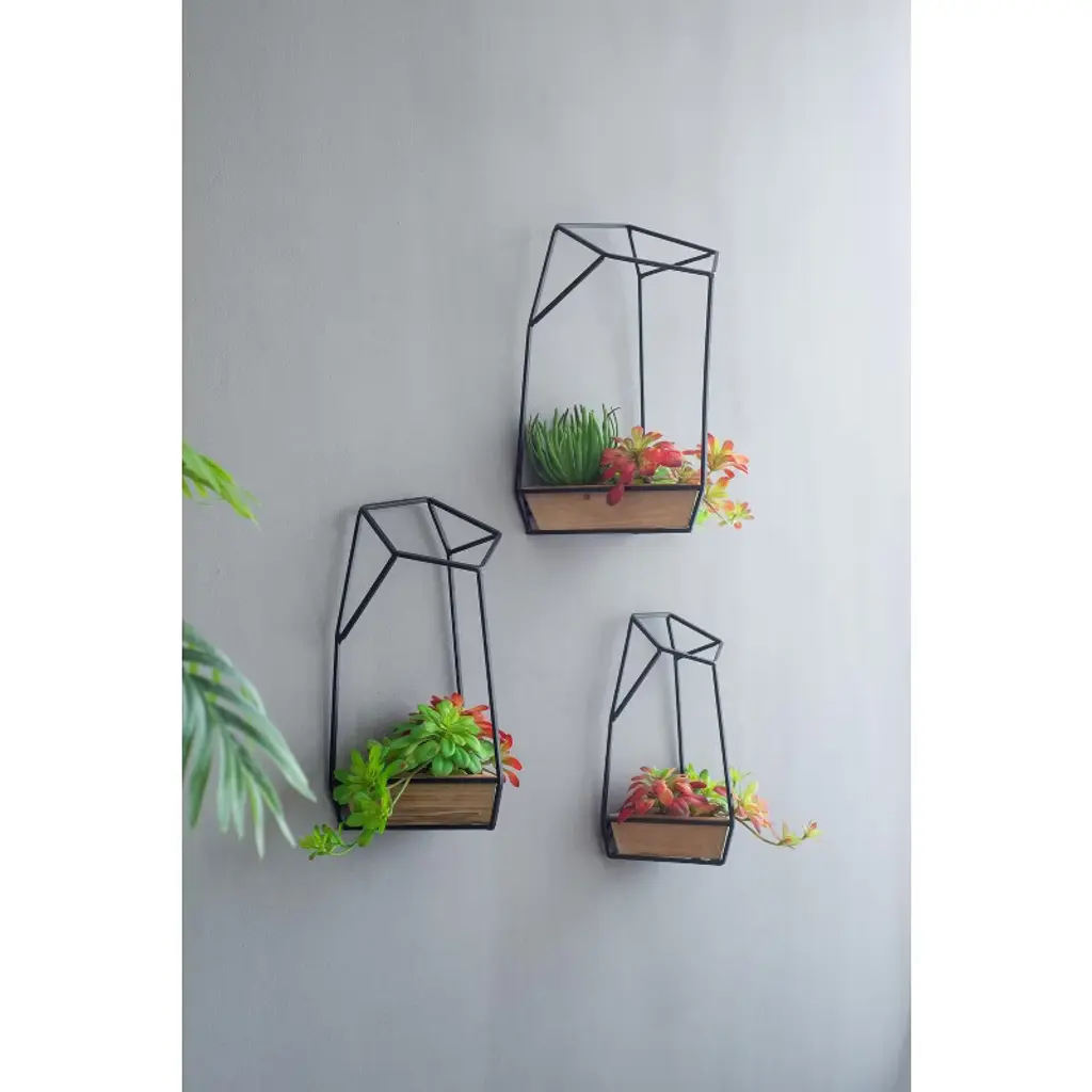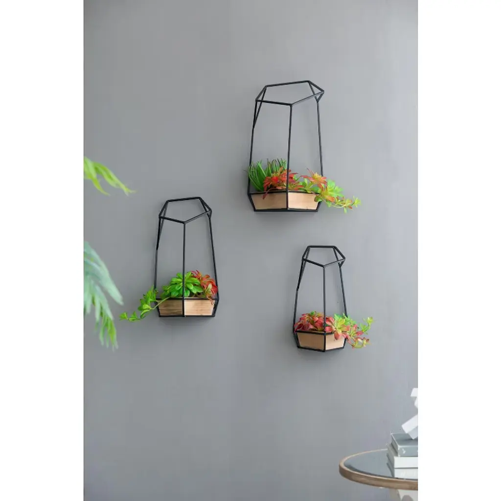 Showcase your favorite succulents and small plants in modern style with this striking set of three geometric wall planters. Each planter features a natural fir wood container nestled within an angular black frame, creating a bold architectural accent for your walls. The contrast between warm wood and industrial metal adds visual interest while seamlessly complementing a wide range of interior aesthetics—from minimalist and Scandinavian to boho and contemporary. Lightweight and easy to hang, these planters create a dynamic vertical garden display that's perfect for living rooms, entryways, kitchens, or offices.