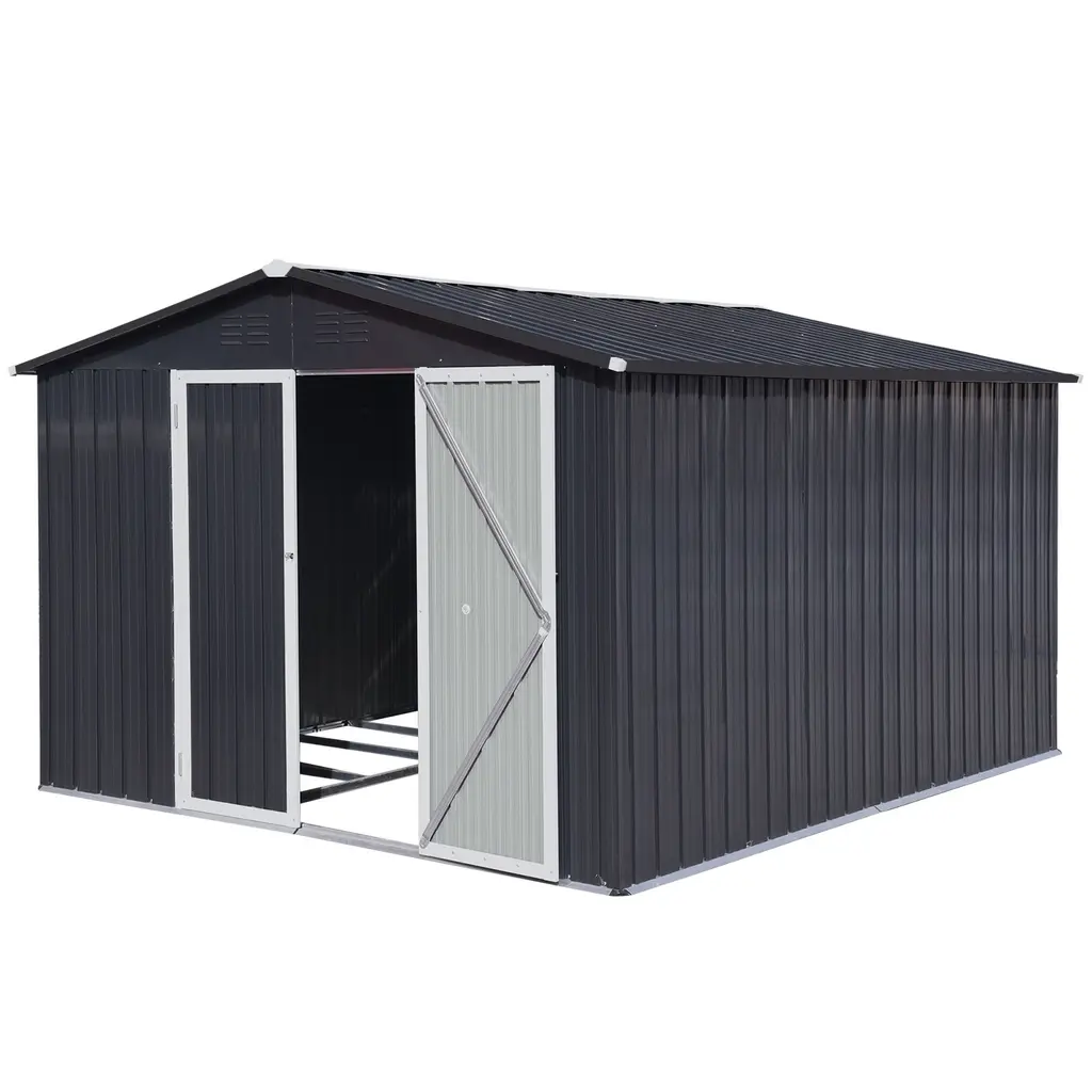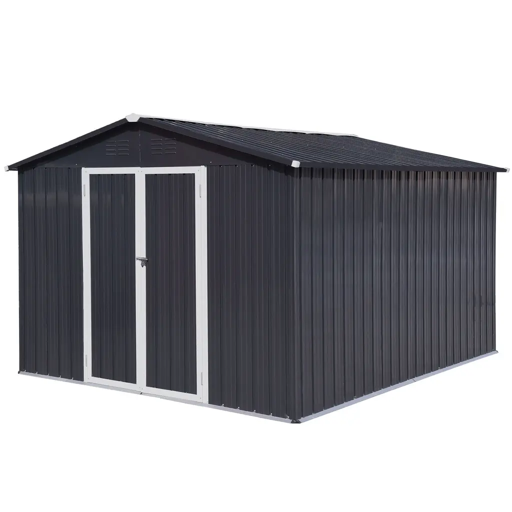 Features:This 10ft x 8ft garden storage shed is the ideal storage solution for small gardens or areas with limited space. It has the perfect size for storing bicycles, lawnmowers, barbeques and garden tools. As with all our steel sheds, this compact unit is constructed from galvanized steel sheets and sui generis aluminum frames.Featuring a pent roof, this 10ft x 8ft storage shed provides impressive storage room for garden tools, equipment, and materials.Unlike typical sheds with plastic vents, this shed comes with two integrated punched vents which will not deteriorate against sunlight.Nothing irks a garden hobbyist more than the sight of a collapsed shed. Luckily, this shed utilizes sui generis aluminum frames which greatly increase the overall sturdiness. On top of that, the galvanized steel panels, coated with eco-friendly painting, can endure harsh weather for at least 10 years.A hinged door offers more customization opportunities than a sliding door does. A heavy-duty complimentary padlock grants extra safety.The uniquely designed aluminum frames provide not only extra sturdiness but also a smooth assembly process. No experience is needed to finish the shed.