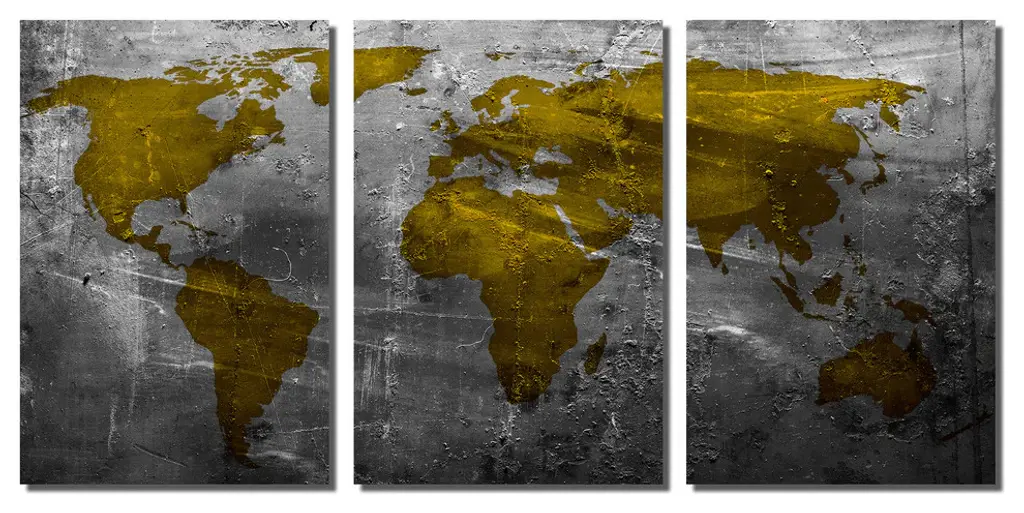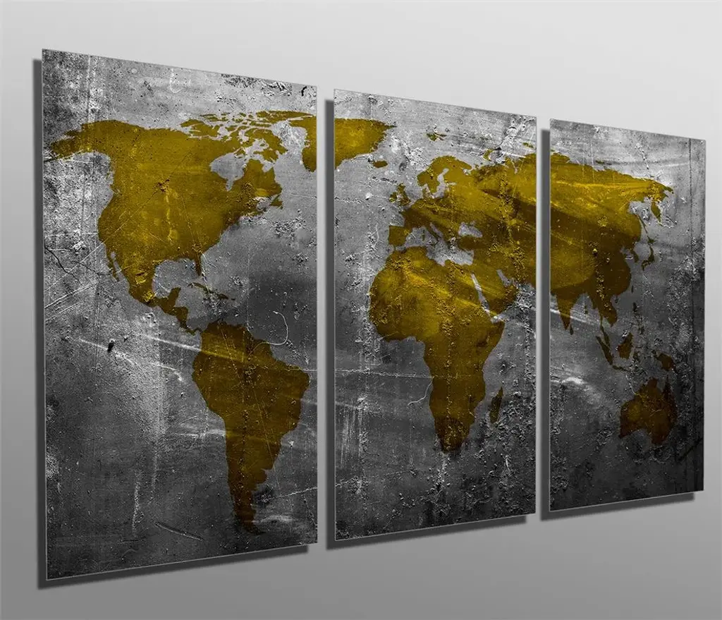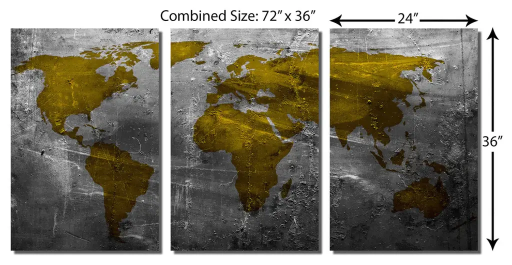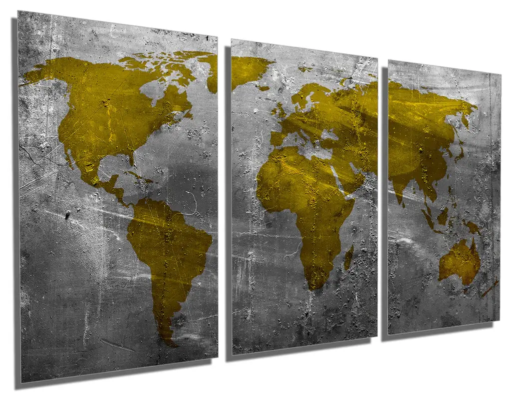 72"œ x 36"œ total size. Ready To Hang! (3 pieces - 24"œ x 36"œ each). 3 Panel Split (Triptych) Abstract art World Map Metal Print ft. shades of metallic gold/yellow-green and gray colors. Modern metal wall art for home or office wall decor & interior design. Printed on Luxurious, HD aluminum glossy metal panels. Multi Panel. HD aluminum panels. Metal print wall art. Includes Shadow Wall Mount on the back.• Aluminum Metal Wall Art• Made in USA• Ready to hang - No assembly required• Shadow mount hardware on the back• 0.045"œ thick HD Aluminum Panels• Scratch resistant, glossy finish• Superb color clarity, luxurious prints• Epson printing process• For indoor or moisture rich environment use• Easy to clean. Gently wipe with microfiber cloth.
