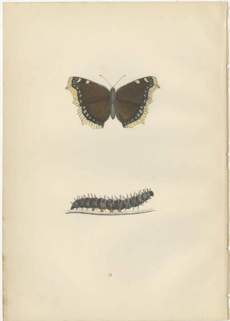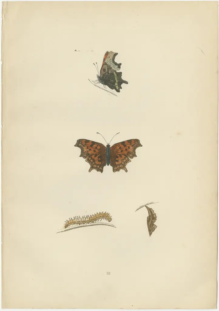The butterflies depicted in these plates are indeed some of the more notable British species, each with distinct characteristics that make them interesting:1. Camberwell Beauty (Nymphalis antiopa): This is a large butterfly characterized by its velvety dark brown wings with a creamy-yellow border and a series of blue spots near the edge. It's interesting because it's a rare migrant in Britain, and its appearances can cause quite a stir among butterfly enthusiasts. It's named after the London district of Camberwell where it was first spotted in Britain. Its rarity and sporadic appearances make it a much-coveted sight.2. Comma (Polygonia c-album): The Comma is easily recognizable by its ragged wing edges, designed to mimic a withered leaf, providing it with camouflage. The underside of its wings is a dark brown color, enhancing its leaf-like disguise when its wings are closed. The upper side, however, shows a rich orange and brown pattern with dark spots and markings. Another distinctive feature is the small white 'C' mark on the underside of the hindwing, which gives the butterfly its name. This butterfly has had a successful history of expanding its range, particularly over the last century.3. Albin's Hampstead Eye (Pseudophilotes vicrama): This small butterfly, also known as the Baton Blue, is notable for its bright blue and black spotted wings. The males are more vibrant than the females, which tend to be brown with orange spots. This species is interesting due to its very localized distribution; it can be found in specific habitats like chalk grassland where its larval food plant, the horseshoe vetch, grows.The charm of these butterflies is enhanced by the fact that these plates are hand-colored illustrations from an era where such detailed work was the primary method of scientifically documenting species. The craftsmanship involved in creating these plates, along with the unique characteristics of each butterfly, contributes to their historical and aesthetic value.