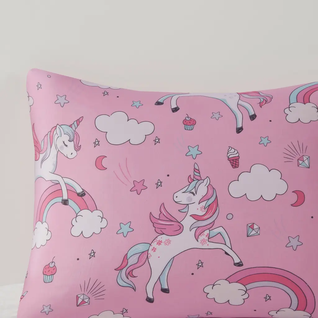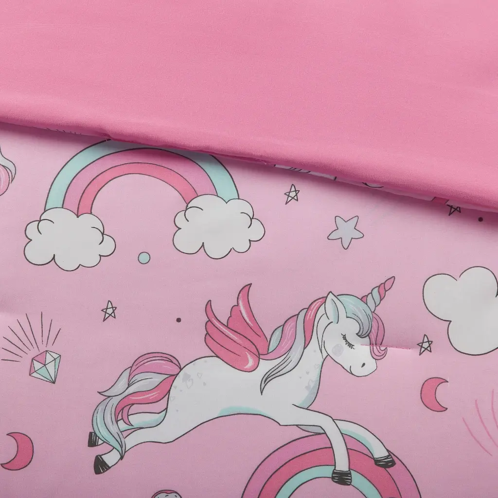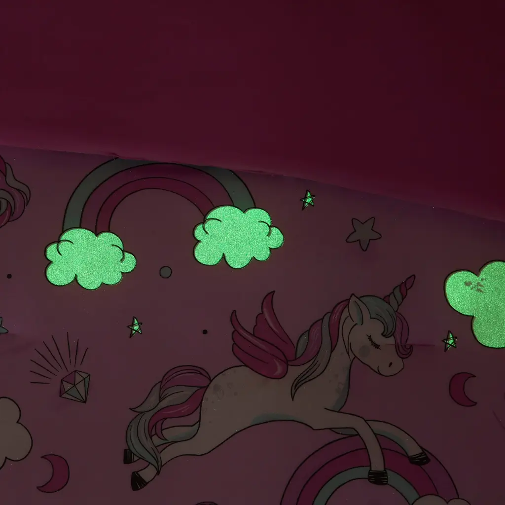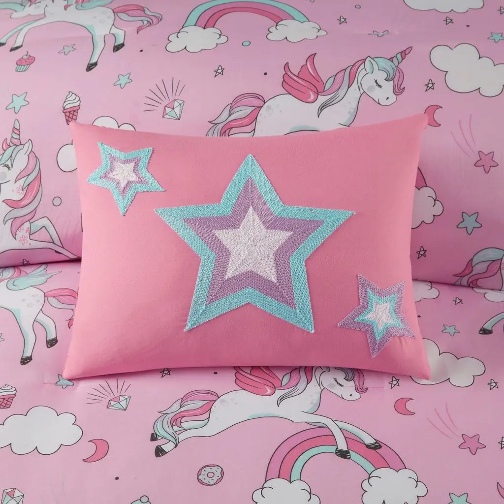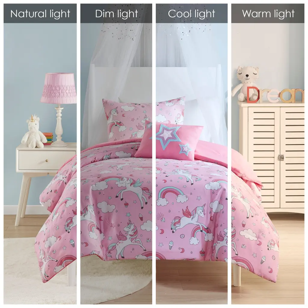 Bring the fantasy and magic to your child's bedtime with Mi Zone Kids Kirstie Unicorn GLOW IN THE DARK comforter set! The ultra-soft comforter and 2 coordinating matching shams (1 sham for TWIN size) featuring colorful and adorable unicorn and rainbow print which will becomes alive by glowing in the dark and an adorable decorative pillow completes the design. It's made from premium quality microfiber offering soft hand feel, yet color fast and durable for years to come. Available in 2 sizes, Twin and Full/Queen sizes. And for your convenience it's machine washable. Items in the set may come in a rolled or compressed packaging.Features:Twin Dimensions:Full/Queen Dimensions: