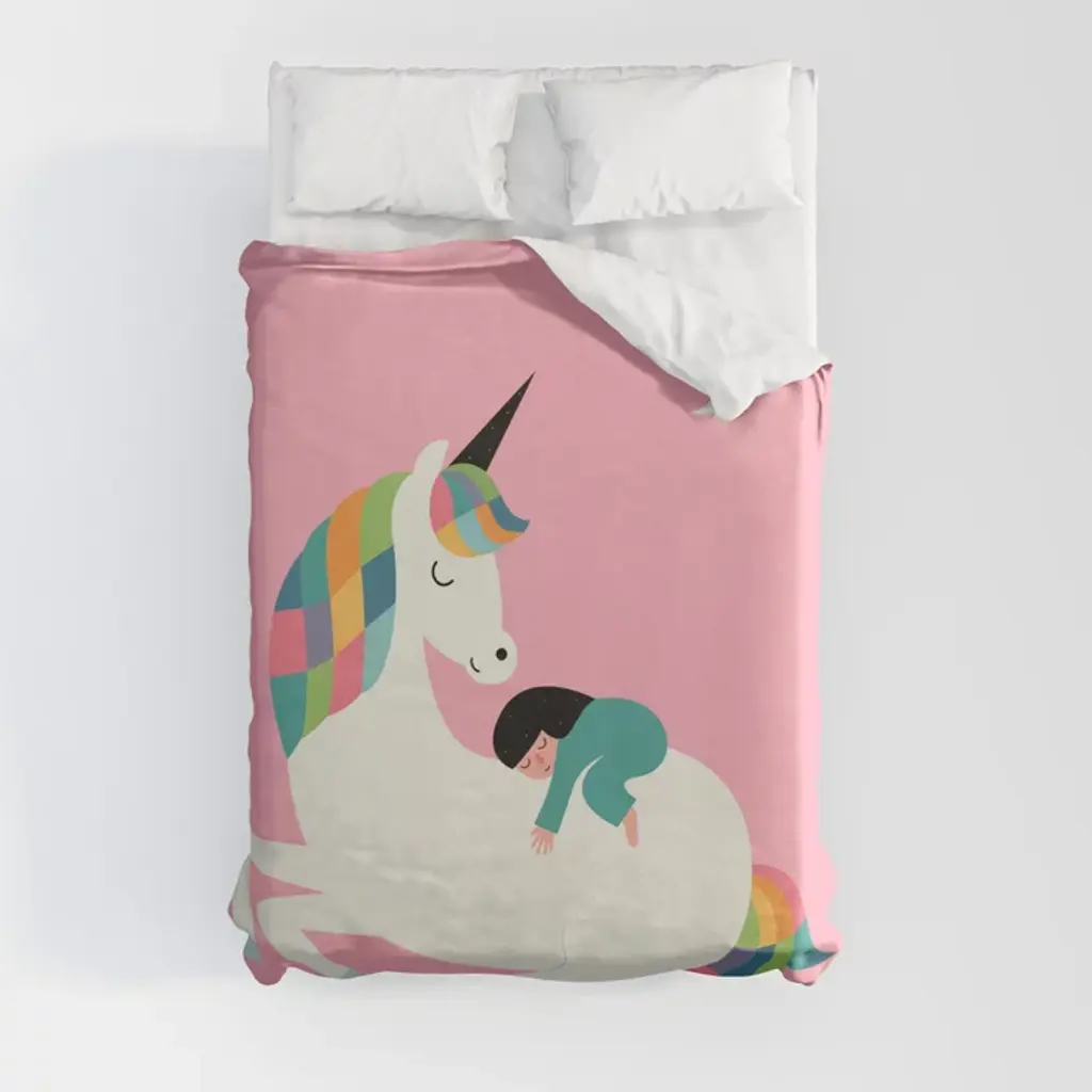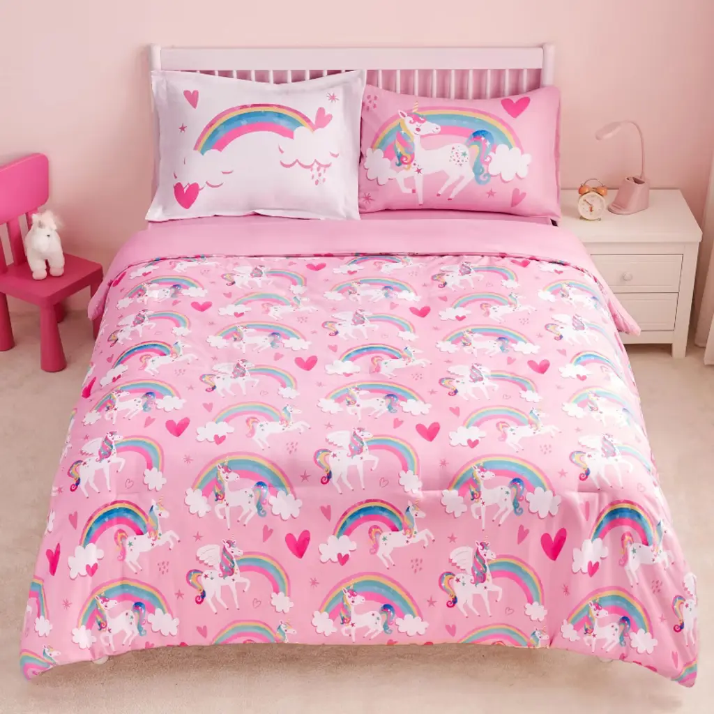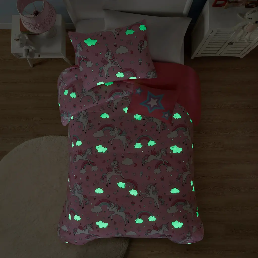 Bring the fantasy and magic to your child's bedtime with Mi Zone Kids Kirstie Unicorn GLOW IN THE DARK comforter set! The ultra-soft comforter and 2 coordinating matching shams (1 sham for TWIN size) featuring colorful and adorable unicorn and rainbow print which will becomes alive by glowing in the dark and an adorable decorative pillow completes the design. It's made from premium quality microfiber offering soft hand feel, yet color fast and durable for years to come. Available in 2 sizes, Twin and Full/Queen sizes. And for your convenience it's machine washable. Items in the set may come in a rolled or compressed packaging.Features:Twin Dimensions:Full/Queen Dimensions: