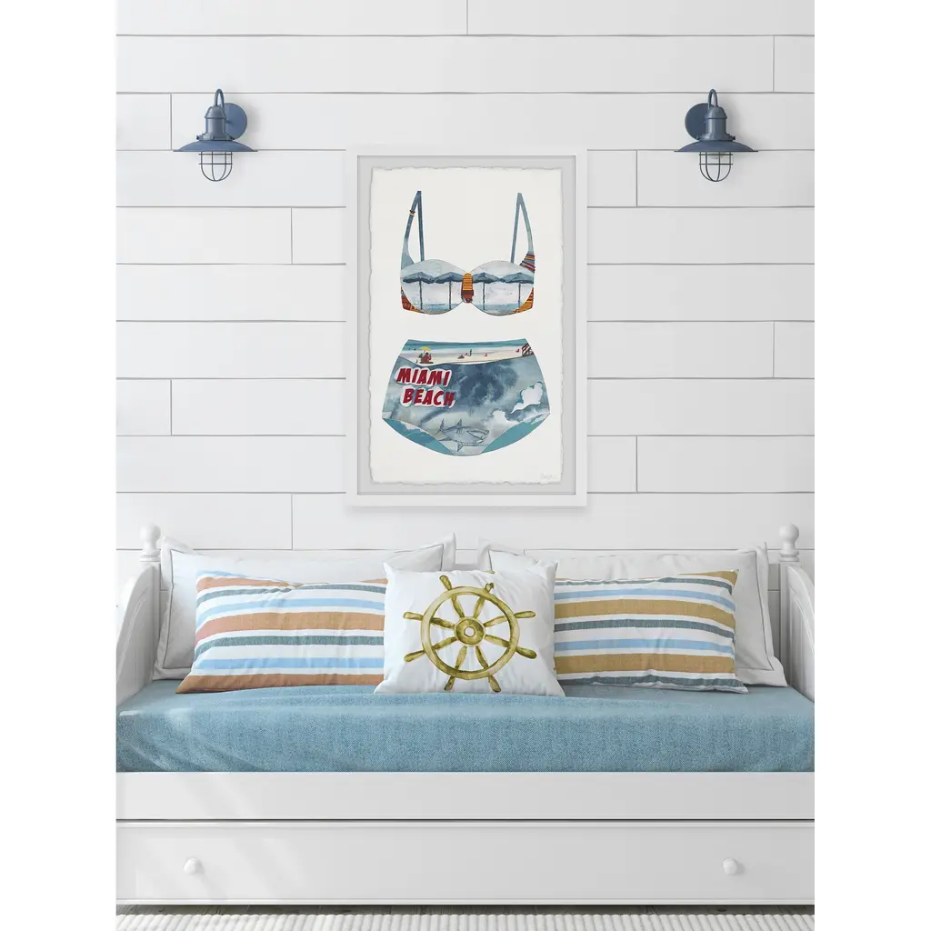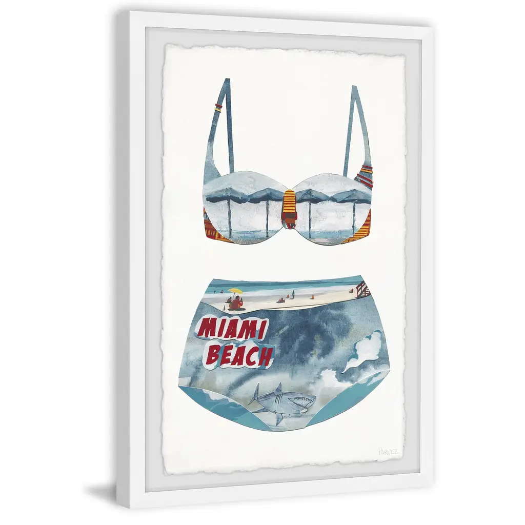 Perfect for beach homes and vacation spots, this print features a blue bikini with Miami Beach on it. Proudly printed in the USA, this piece is printed on high quality archive paper and professionally hand-framed. With wall-mounting hooks included, this artful accent is ready to hang up as soon as it reaches your front door. • Top quality Giclee print on high resolution Archive Paper • Hand cut deckled edges • High quality durable non-warping frame • Finished under shatter resistant plexiglass • Arrives ready to hang • Includes a certificate of authenticity • Printed in the USA • Artist signature on the front