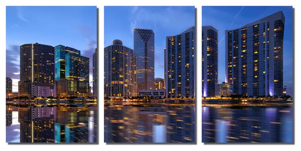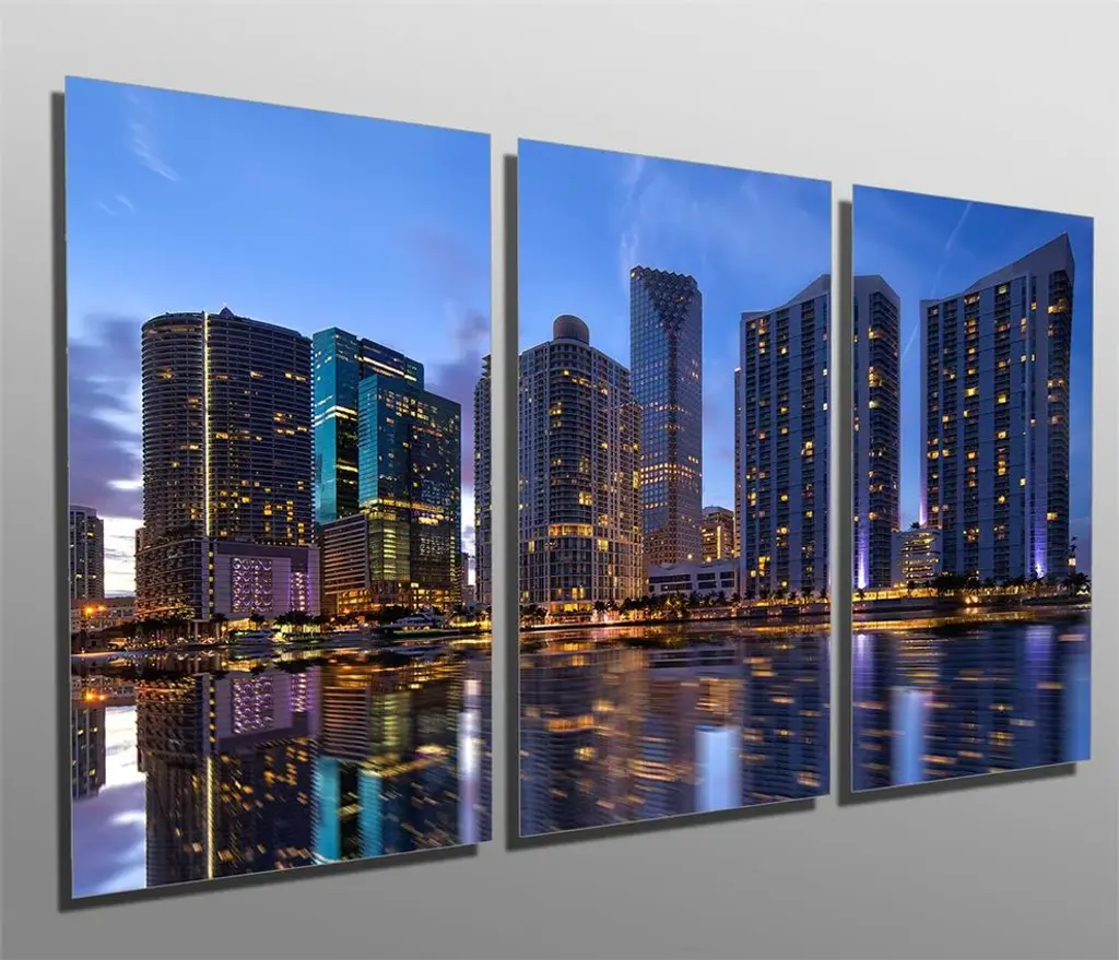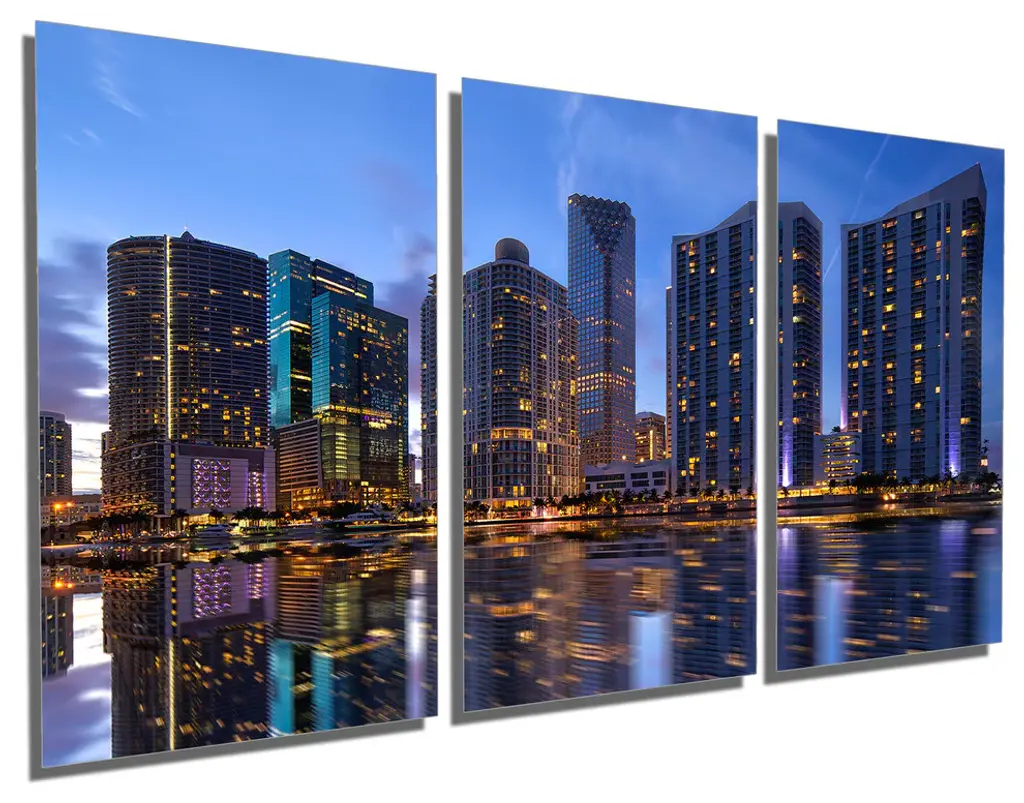 60"œ x 30"œ total size. Ready To Hang! (3 pieces - 20"œ x 30"œ each). 3 Panel Split (Triptych) Metal Print ft. Miami, Florida oceanfront skyline. Modern metal wall art for home or office wall decor & interior design. Printed on Luxurious, HD aluminum glossy metal panels. Multi panel art.. HD aluminum panels. Metal print wall art. Includes Shadow Wall Mount on the back.• Aluminum Metal Wall Art• Made in USA• Ready to hang - No assembly required• Shadow mount hardware on the back• 0.045"œ thick HD Aluminum Panels• Scratch resistant, glossy finish• Superb color clarity, luxurious prints• Epson printing process• For indoor or moisture rich environment use• Easy to clean. Gently wipe with microfiber cloth.