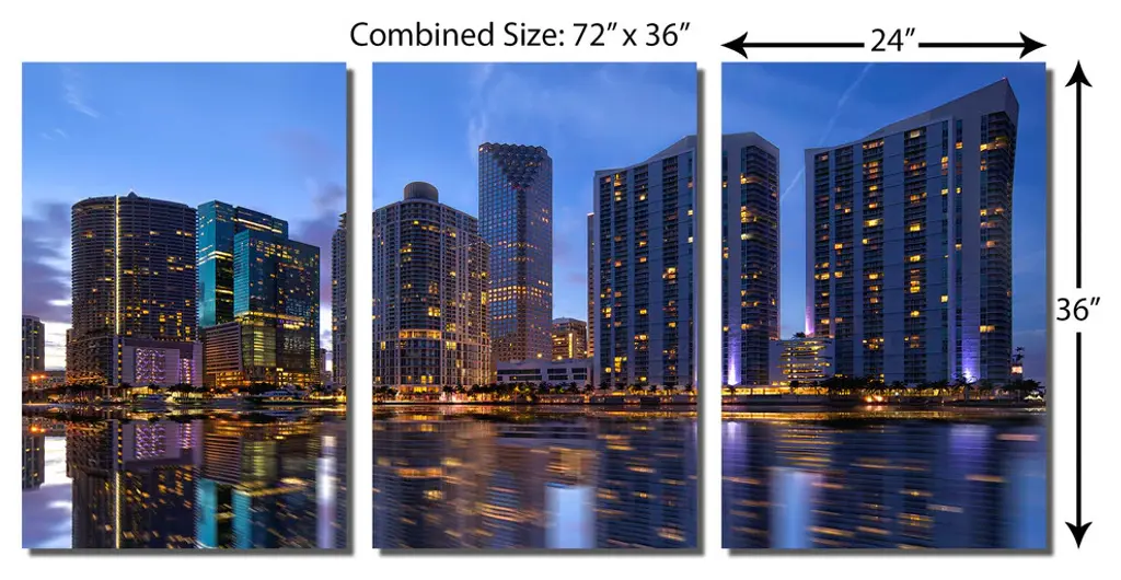 72"œ x 36"œ total size. Ready To Hang! (3 pieces - 24"œ x 36"œ each). 3 Panel Split (Triptych) Metal Print ft. Miami, Florida oceanfront skyline. Modern metal wall art for home or office wall decor & interior design. Printed on Luxurious, HD aluminum glossy metal panels. Multi panel art.. HD aluminum panels. Metal print wall art. Includes Shadow Wall Mount on the back.• Aluminum Metal Wall Art• Made in USA• Ready to hang - No assembly required• Shadow mount hardware on the back• 0.045"œ thick HD Aluminum Panels• Scratch resistant, glossy finish• Superb color clarity, luxurious prints• Epson printing process• For indoor or moisture rich environment use• Easy to clean. Gently wipe with microfiber cloth.