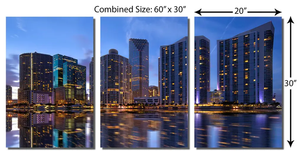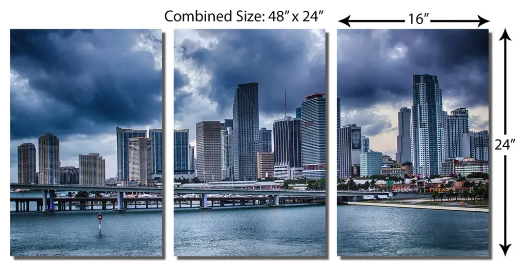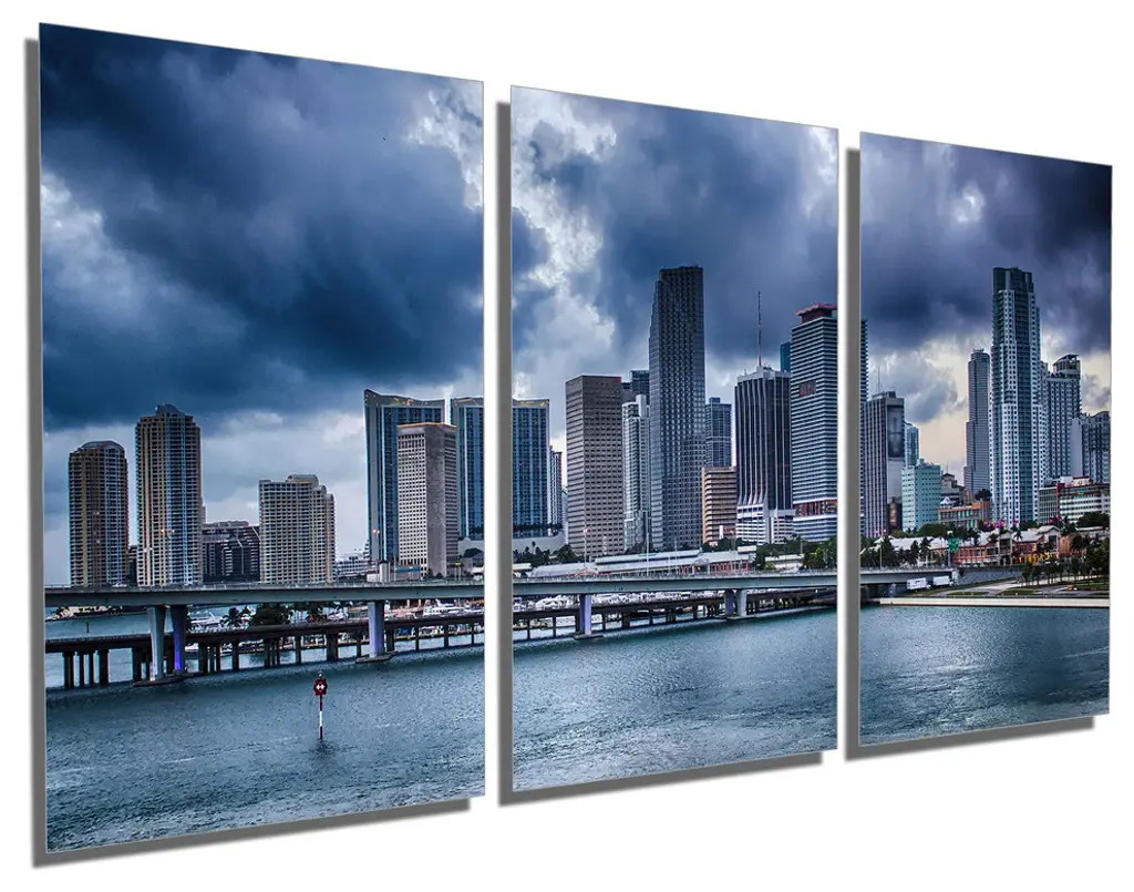 48"œ x 24"œ total size. Ready To Hang! (3 pieces - 16"œ x 24"œ each). 3 Panel Split (Triptych) Metal Print ft. Miami Oceanfront Skyline. Modern metal wall art for home or office wall decor & interior design. Printed on Luxurious, HD aluminum glossy metal panels. Multi panel art.. HD aluminum panels. Metal print wall art. Includes Shadow Wall Mount on the back.• Aluminum Metal Wall Art• Made in USA• Ready to hang - No assembly required• Shadow mount hardware on the back• 0.045"œ thick HD Aluminum Panels• Scratch resistant, glossy finish• Superb color clarity, luxurious prints• Epson printing process• For indoor or moisture rich environment use• Easy to clean. Gently wipe with microfiber cloth.