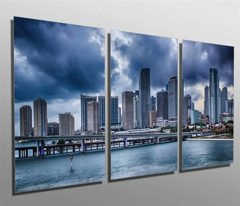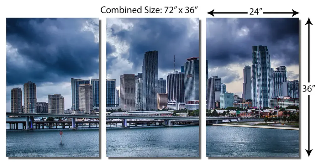 72"œ x 36"œ total size. Ready To Hang! (3 pieces - 24"œ x 36"œ each). 3 Panel Split (Triptych) Metal Print ft. Miami Oceanfront Skyline. Modern metal wall art for home or office wall decor & interior design. Printed on Luxurious, HD aluminum glossy metal panels. Multi panel art.. HD aluminum panels. Metal print wall art. Includes Shadow Wall Mount on the back.• Aluminum Metal Wall Art• Made in USA• Ready to hang - No assembly required• Shadow mount hardware on the back• 0.045"œ thick HD Aluminum Panels• Scratch resistant, glossy finish• Superb color clarity, luxurious prints• Epson printing process• For indoor or moisture rich environment use• Easy to clean. Gently wipe with microfiber cloth.