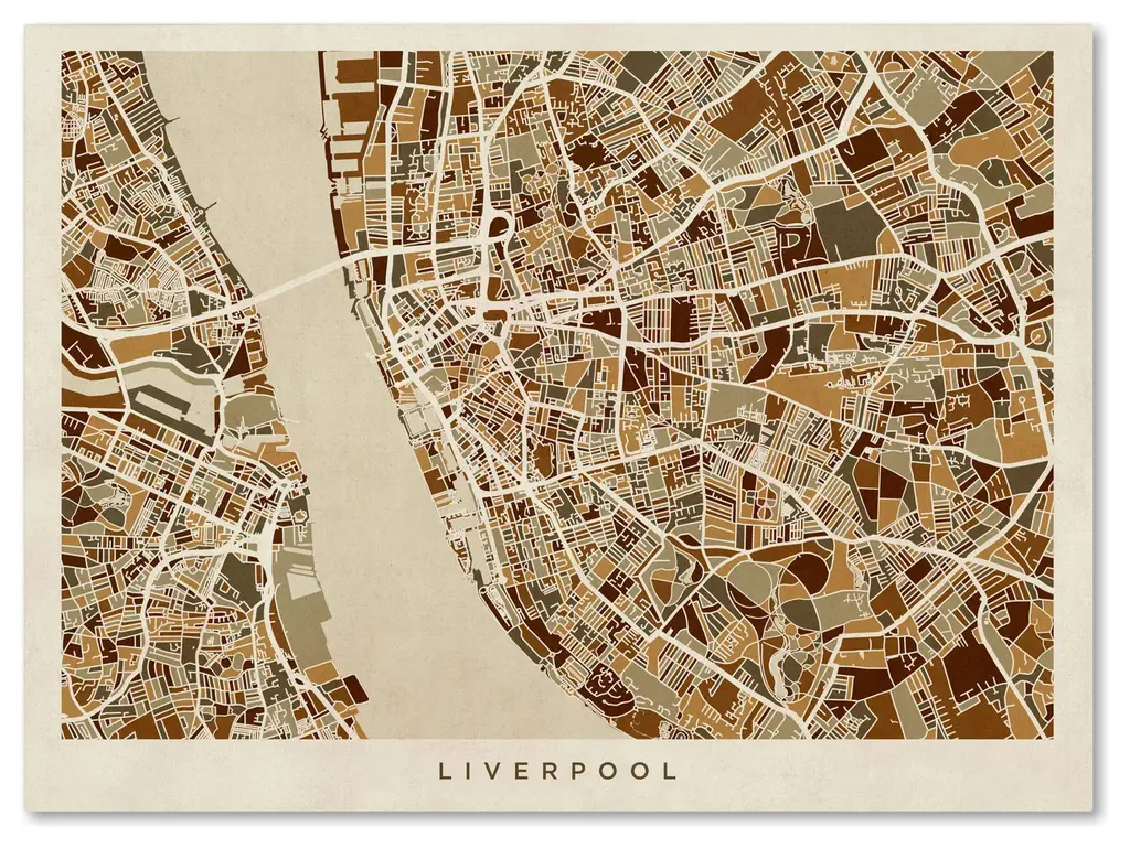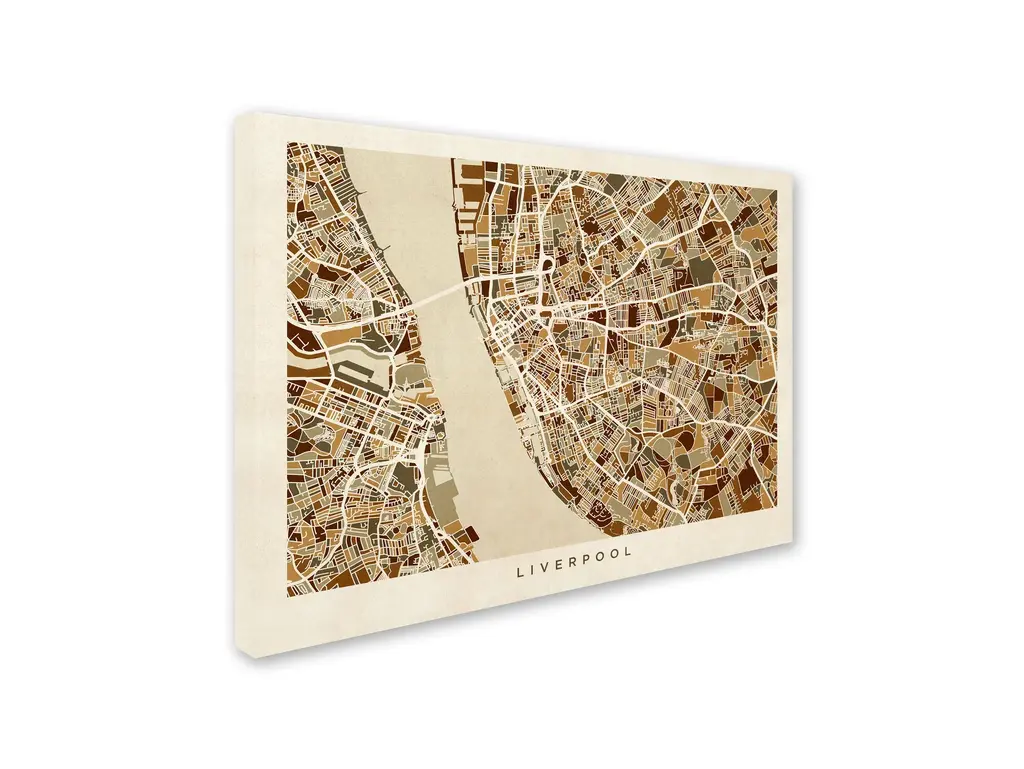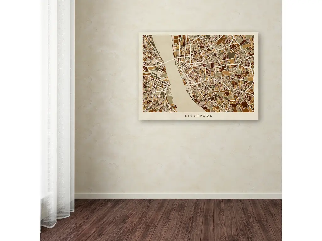 Artist: Michael TompsettSubject: MapsStyle: ContemporaryProduct Type: Gallery-Wrapped Canvas ArtMade in USAThis ready to hang, gallery-wrapped art piece features a map of the streets of Liverpool.Art and design were always Michael's favorite subjects at school. He was fortunate to land a job as a graphic designer at one of London's most prestigious publishing companies. After 12 years Michael Tompsett made the decision to pursue a full-time career creating his own work. The freedom and time to be able to focus solely on his own projects has been a wonderful experience. Although Michael likes to experiment with different styles and subjects, his main focus is on map art. He enjoys looking for unique and interesting ways to depict something which is very familiar. Maps are visual representations of the world we live in, a world which is incredibly diverse. Apart from maps, Tompsett creates urban landmark and cityscape designs.Giclee (jee-clay) is an advanced printmaking process for creating high quality fine art reproductions. The attainable excellence that Giclee printmaking affords makes the reproduction virtually indistinguishable from the original piece. The result is wide acceptance of Giclee by galleries, museums, and private collectors. Gallery wrap is a method of stretching an artist's canvas so that the canvas wraps around the sides and is secured a hidden, wooden frame. This method of stretching and preparing a canvas allows for a frameless presentation of the finished painting.