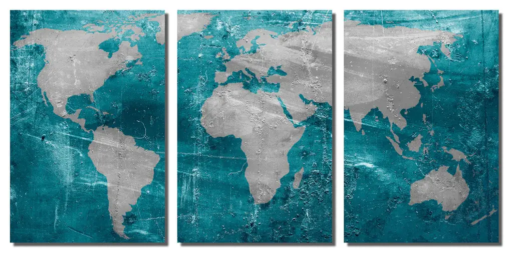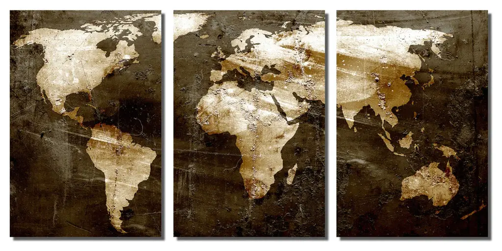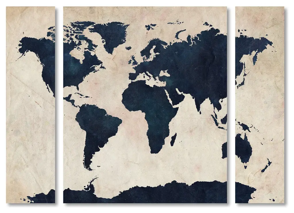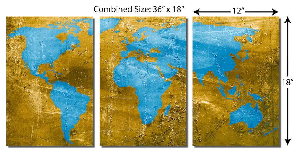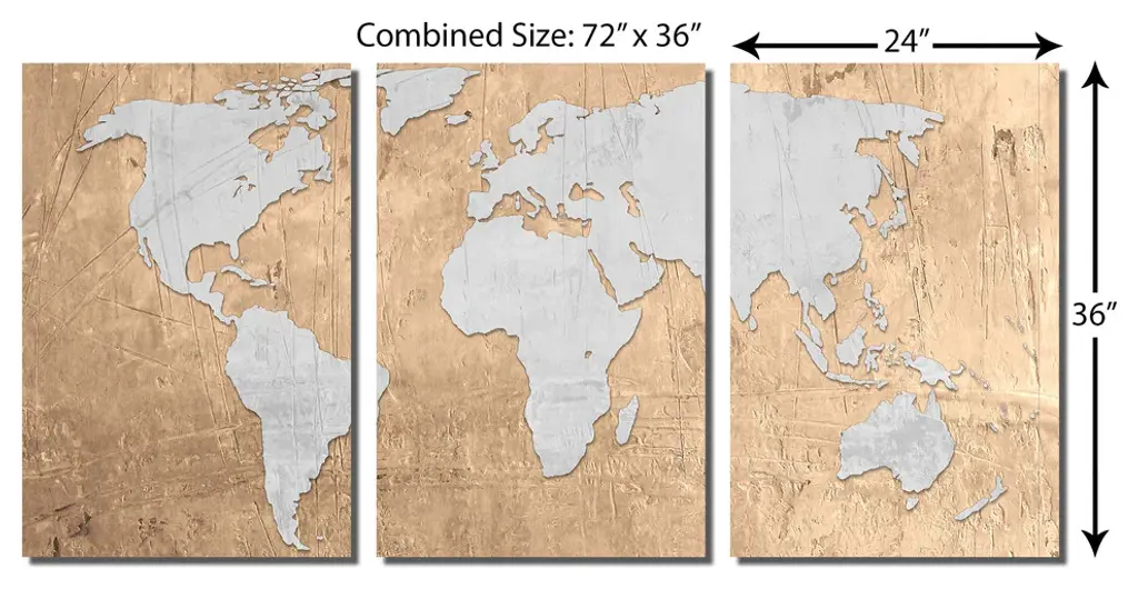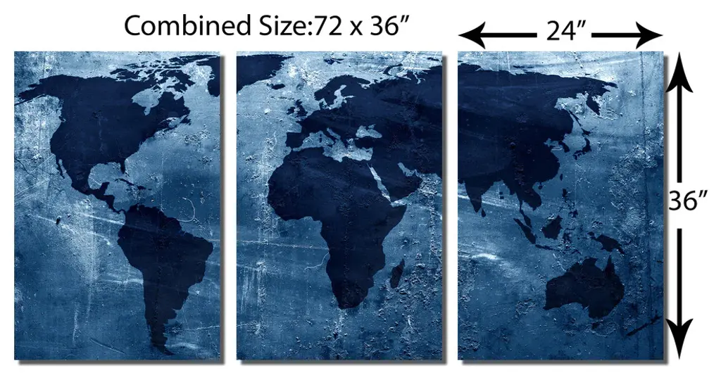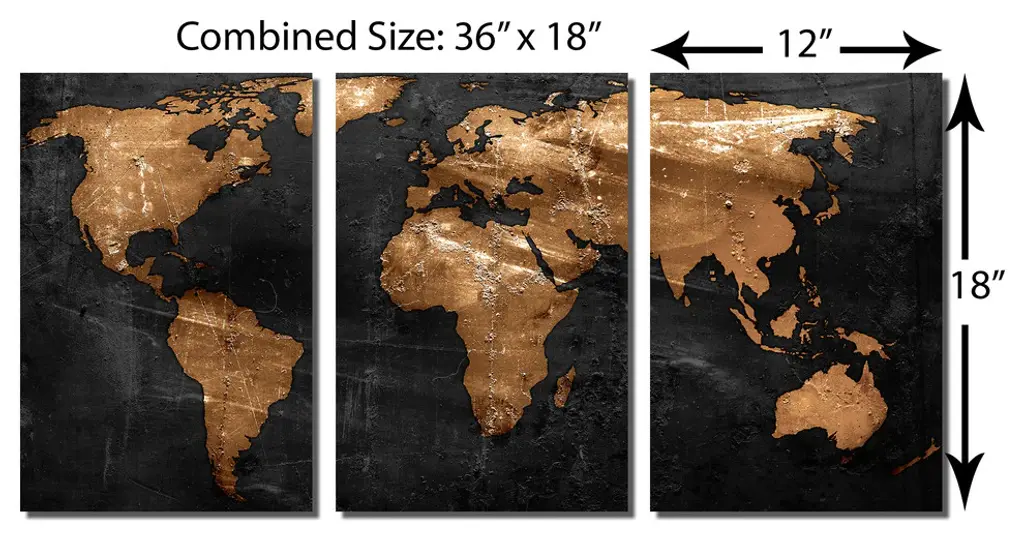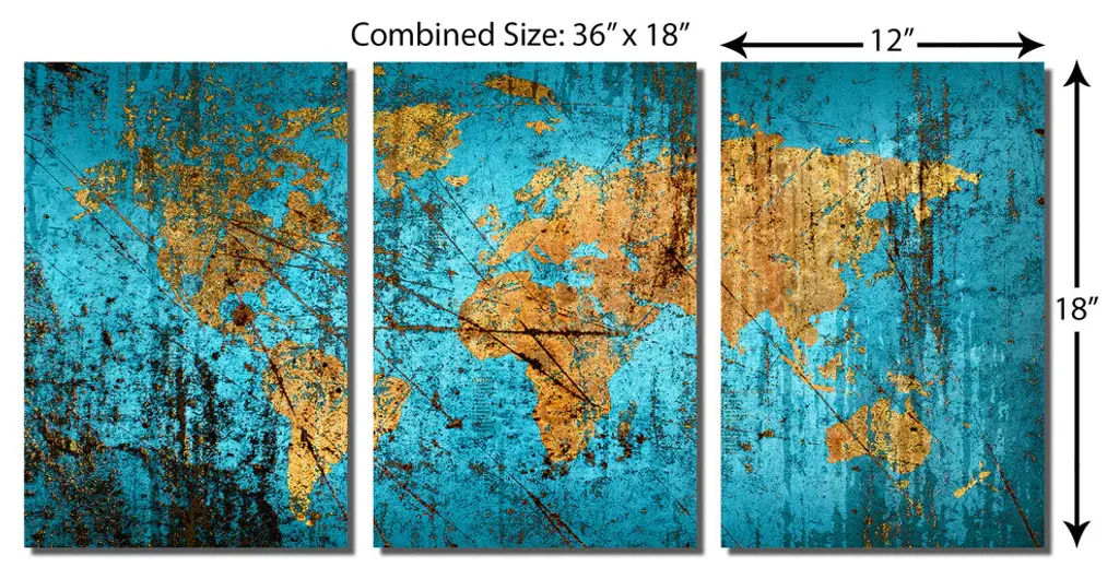 Artist: Michael TompsettSubject: MapsStyle: ContemporaryProduct Type: Multi Panel Canvas Art SetPanel Dimensions: 8" x 30", 25" x 30", 8" x 30"Overall Dimensions: 30" x 41"Made in USAThis ready to hang, gallery-wrapped multi panel canvas art set features a world map.Art and design were always Michael's favorite subjects at school. He was fortunate to land a job as a graphic designer at one of London's most prestigious publishing companies. After 12 years Michael Tompsett made the decision to pursue a full-time career creating his own work. The freedom and time to be able to focus solely on his own projects has been a wonderful experience. Although Michael likes to experiment with different styles and subjects, hi main focus is on map art. He enjoys looking for unique and interesting ways to depict something which is very familiar. Maps are visual representations of the world we live in, a world which is incredibly diverse. Apart from maps, Tompsett creates urban landmark and cityscape designs.Giclee (jee-clay) is an advanced printmaking process for creating high quality fine art reproductions. The attainable excellence that Giclee printmaking affords makes the reproduction virtually indistinguishable from the original piece. The result is wide acceptance of Giclee by galleries, museums, and private collectors. Gallery wrap is a method of stretching an artist's canvas so that the canvas wraps around the sides and is secured a hidden, wooden frame. This method of stretching and preparing a canvas allows for a frameless presentation of the finished painting.