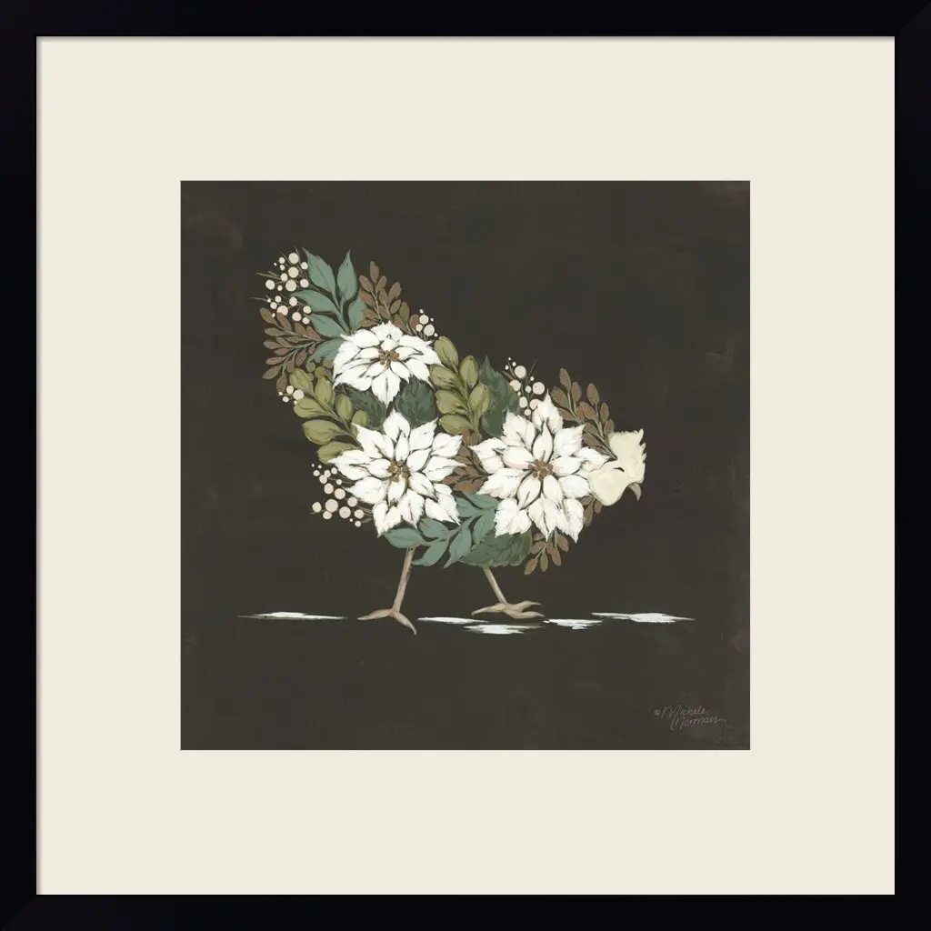Floral Winter Hen by Michele Norman is a high quality piece of framed artwork. The finished size of this piece is 19" X 19". It has a Petite Black with Flat Front frame, is single matted and finished with high quality Acrylic Plexiglass. 100% Satisfaction Guaranteed.