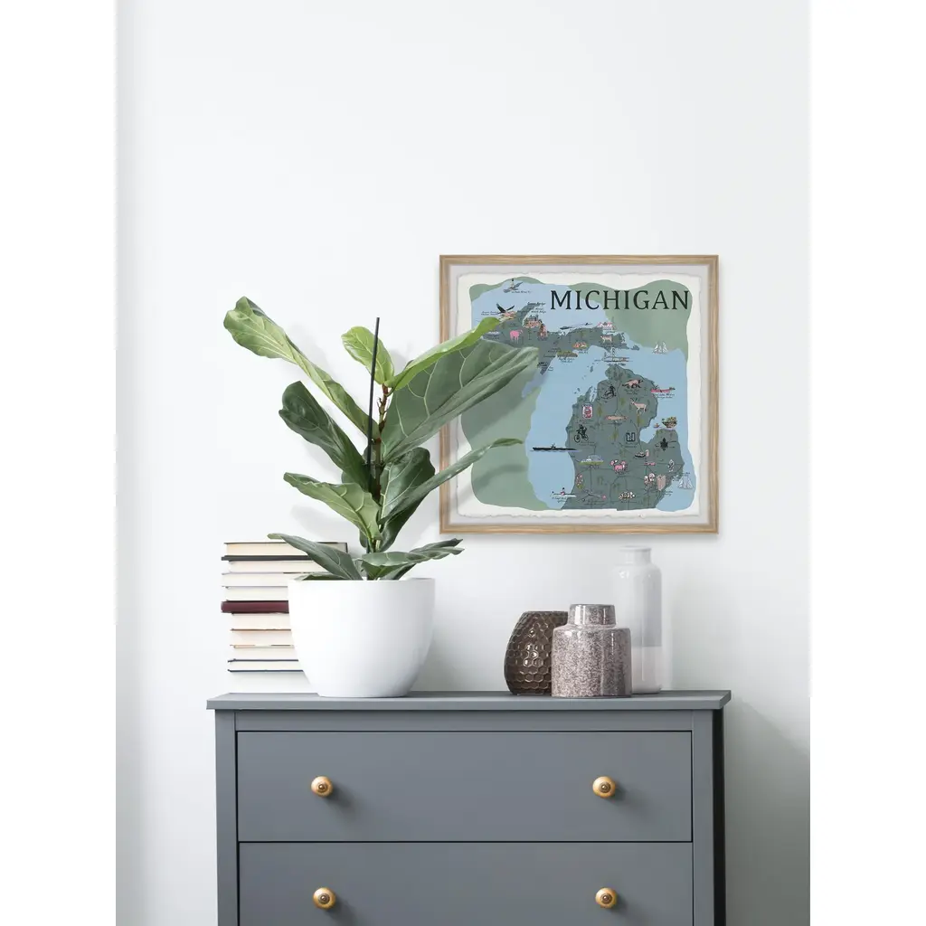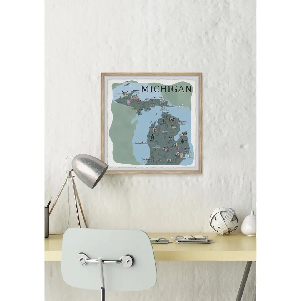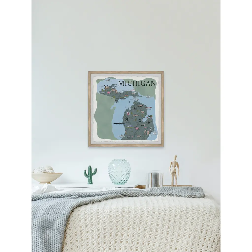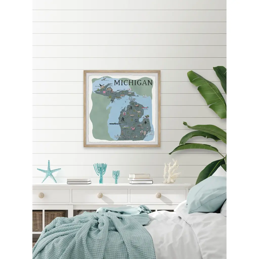 This print features an image-filled map of Michigan, where each symbol represents one of the state's most popular spots. Proudly printed in the USA, this piece is printed on high quality archive paper and professionally hand-framed. With wall-mounting hooks included, this artful accent is ready to hang up as soon as it reaches your front door.Top quality Gicle print on high resolution Archive PaperHand cut deckled edgesHigh quality durable non-warping frameFinished under shatter resistant plexiglassArrives ready to hangIncludes a certificate of authenticityPrinted in the USA