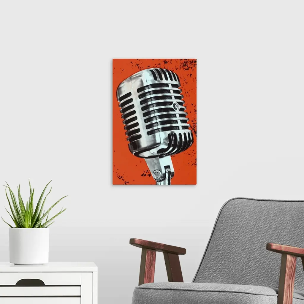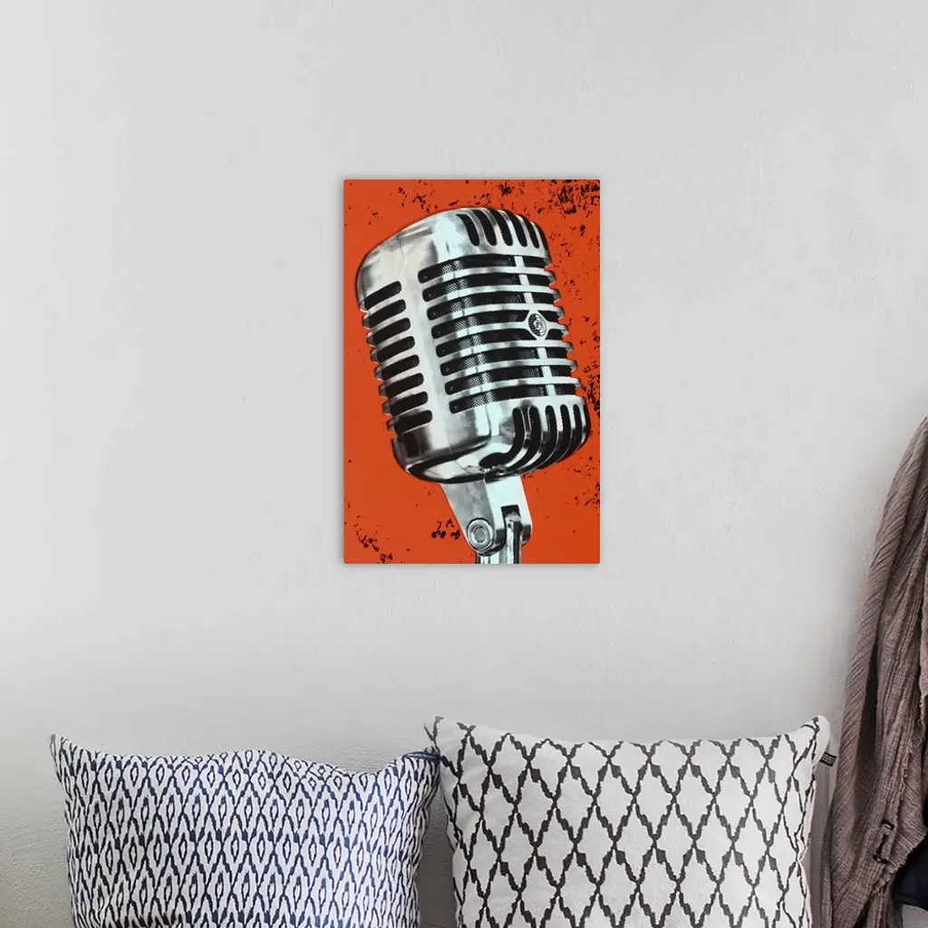 Contemporary pop art style artwork of a microphone against a dark orange background.