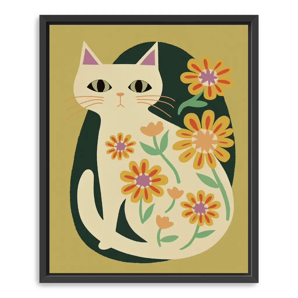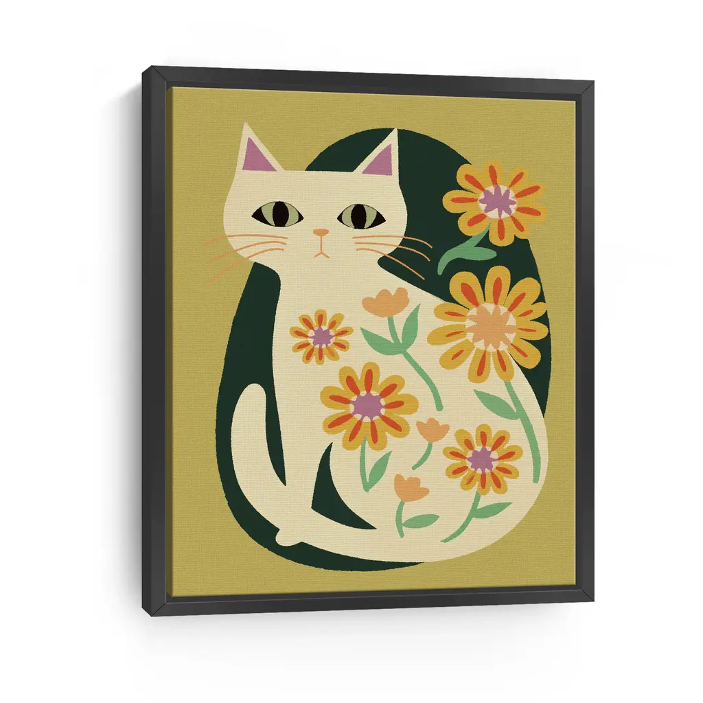 Add a touch of charm to your space with this playful canvas art featuring a white cat adorned in vibrant orange and yellow blooms. The bold contrast of deep green and mustard yellow creates a cozy, vintage-inspired vibe that cat lovers will adore. Our Gallery Wrap Canvas Prints are proudly assembled with high quality materials in California, USA. Each piece is printed on a thick, archival grade canvas using Giclee technology. It is then hand-stretched by our experienced artisans over solid wood bars, which will not warp over time. The final product is a piece personally crafted for you to confidently display on your wall. Care and Assembly: Ensure that the location of your piece has little to no exposure to heat, sunlight, and moisture. Wipe clean, only if needed. Each piece includes hanging hardware to hang on your wall vertically.