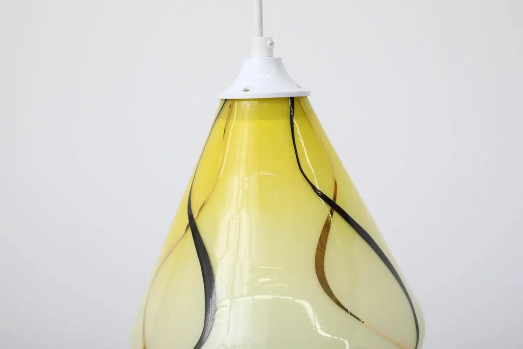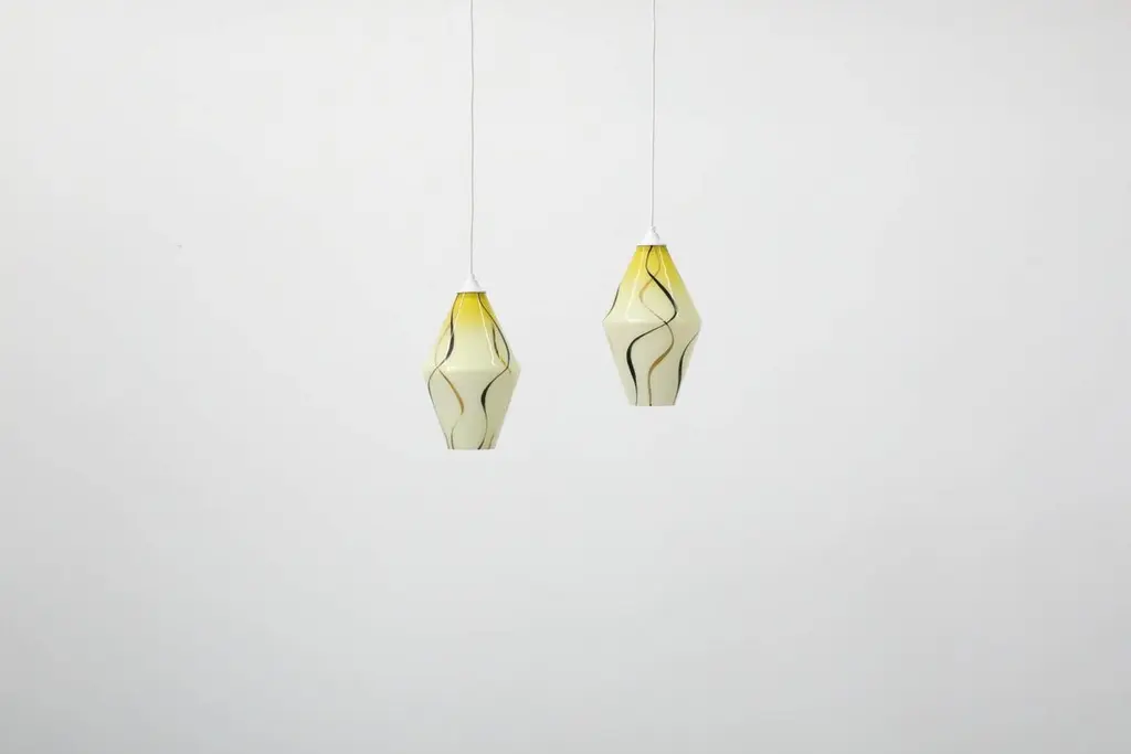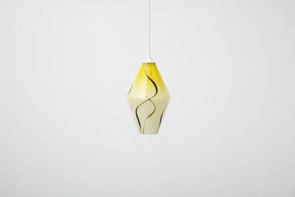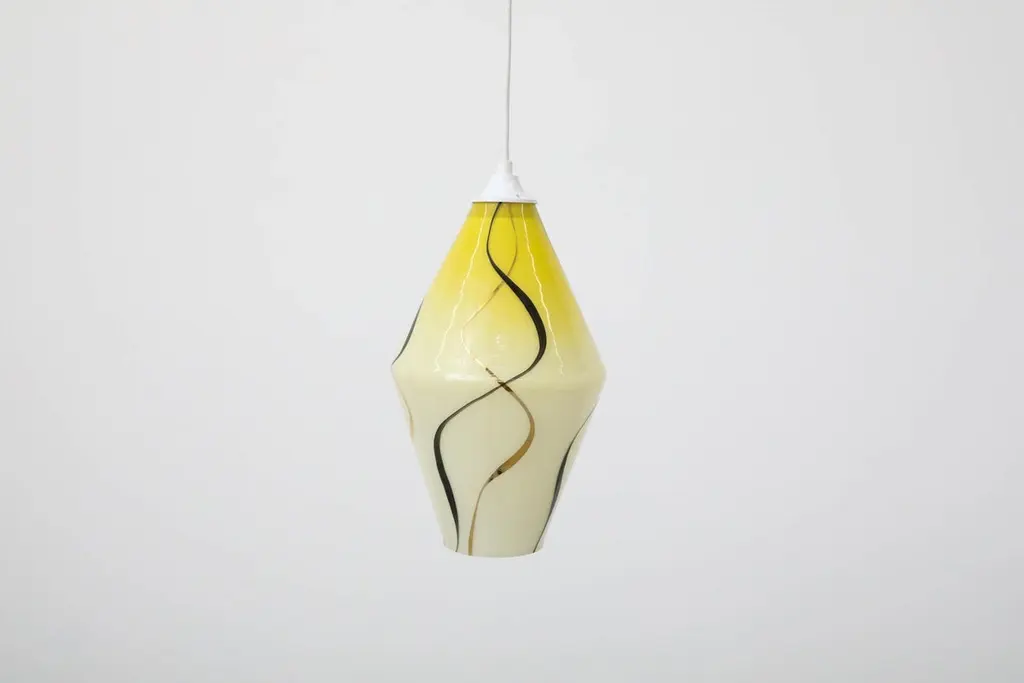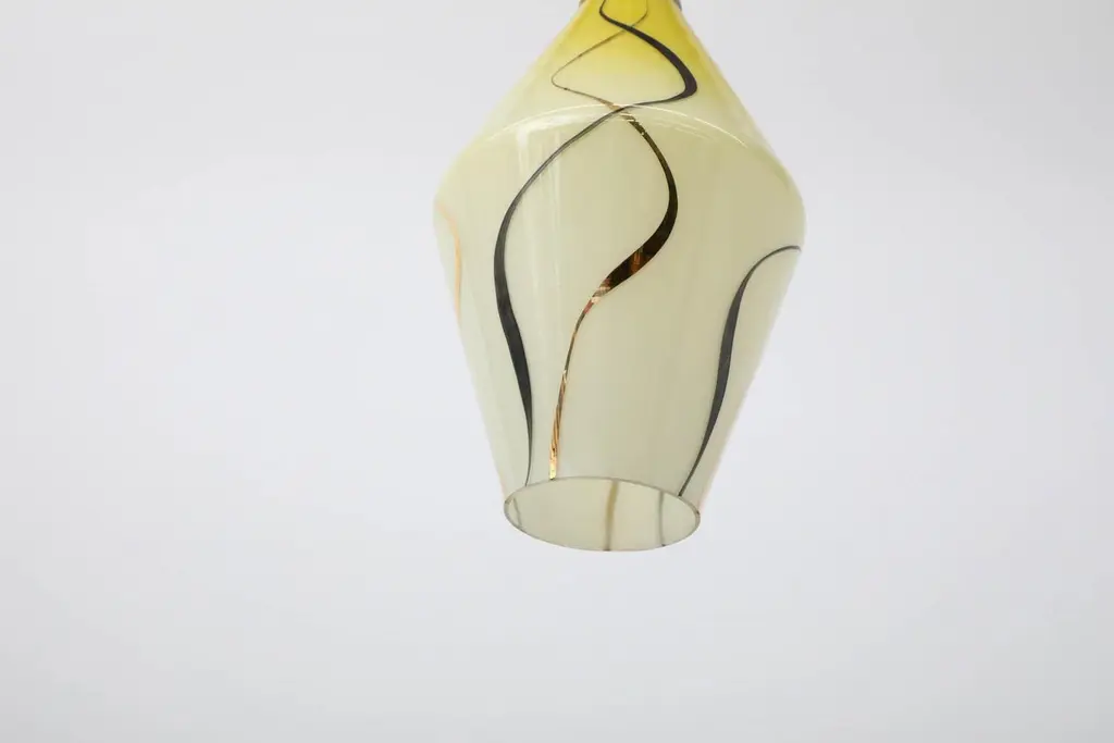 Mid-Century diamond shaped glass ceiling pendants with printed design. The glass is a variegated yellow to white with black and gold metallic swirls. In original condition with wear consistent with age and use. 2 available, sold individually.