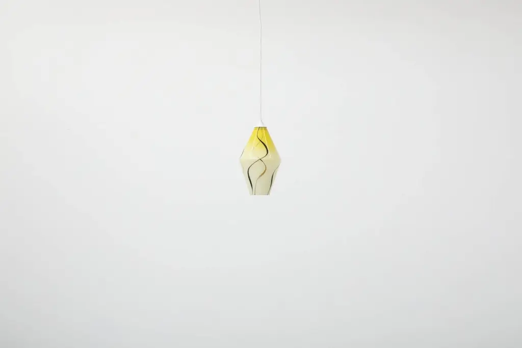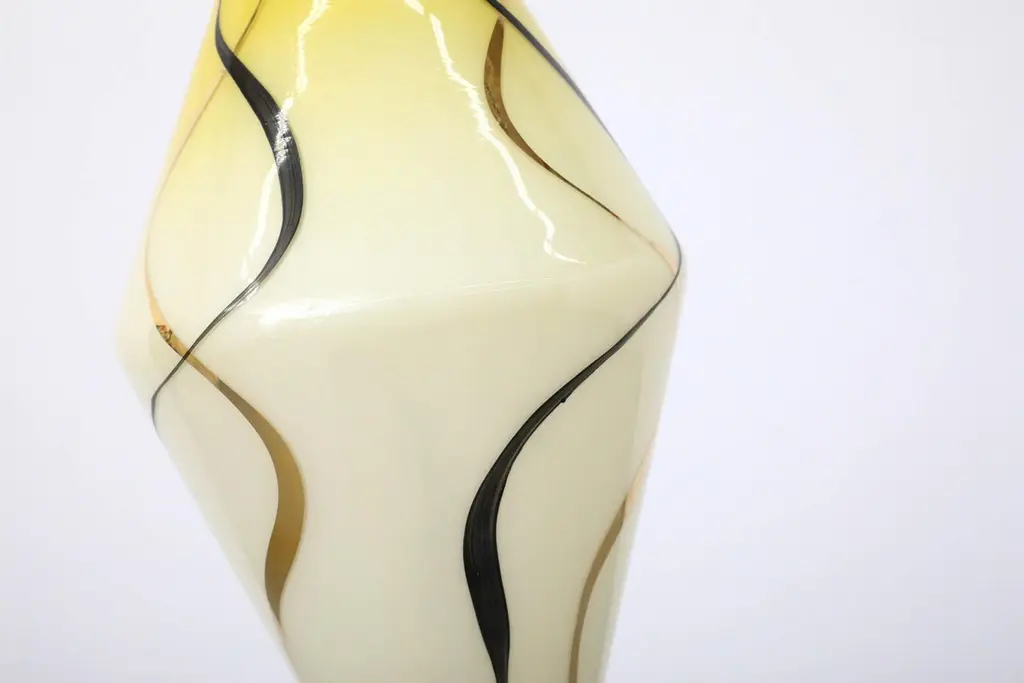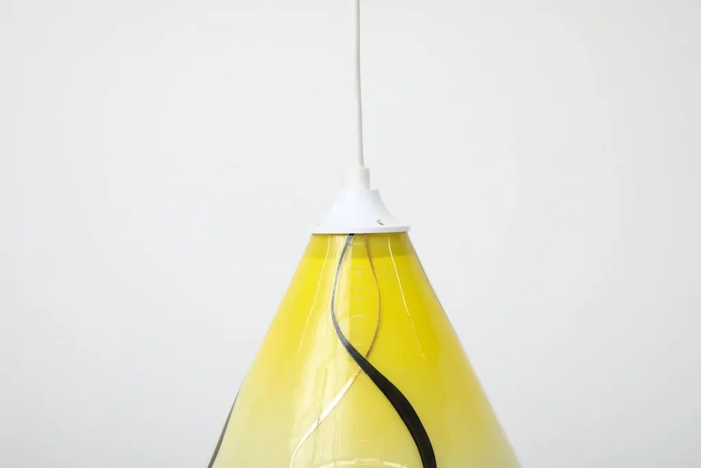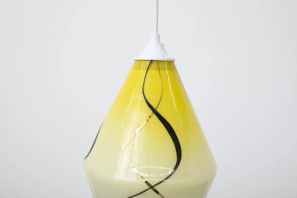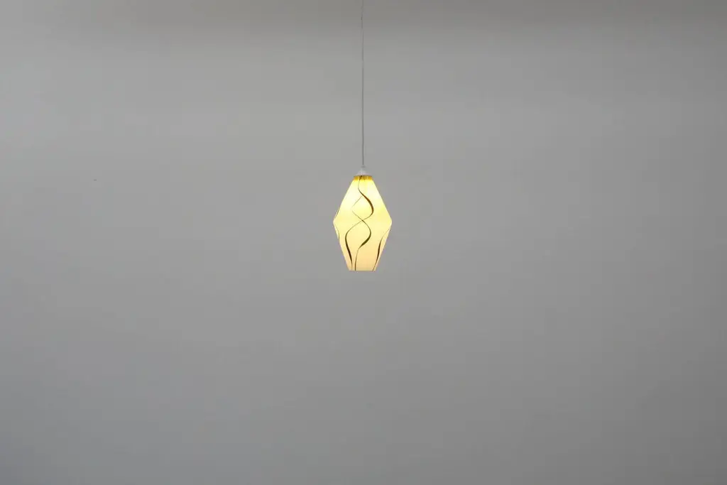 Mid-Century diamond shaped glass ceiling pendants with printed design. The glass is a variegated yellow to white with black and gold metallic swirls. In original condition with wear consistent with age and use. 2 available, sold individually.