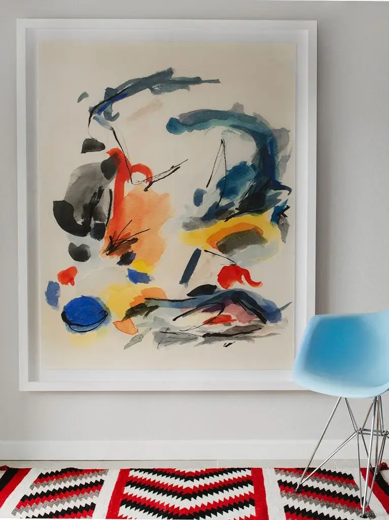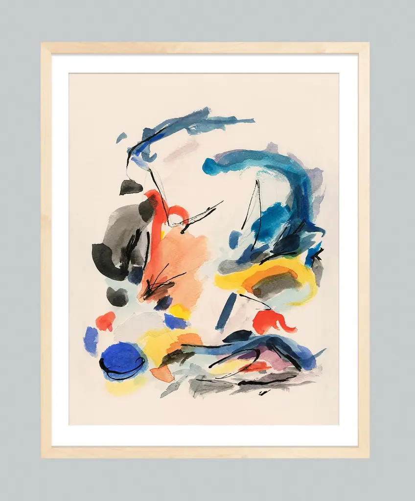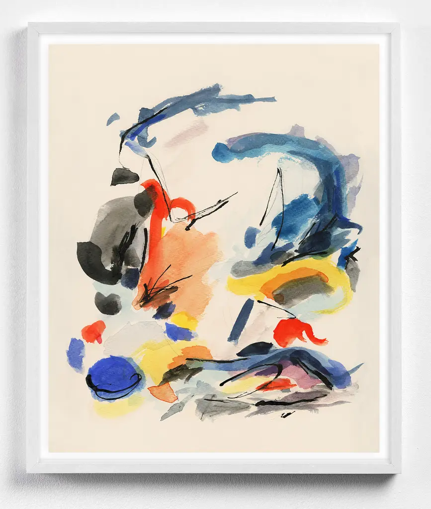 Based on an original watercolor in the Blue Notes series, "Blue Notes No. 2" makes reference both to the energy of Mid-Century Abstraction as well as Chinese and Japanese calligraphy and brush painting. Bold primary colors mingle with greys, salmon pinks, and watery blues for a dynamic yet calming piece. Please see our other listings for the framed version. Printed on 100% Cotton Archival watercolor paper on a top-of-the-line 12-ink Giclée printer. Unframed prints are shipped in a heavyweight mailing tube. Please note: We ship out within 3 days. Chairish transit times are not accurate.