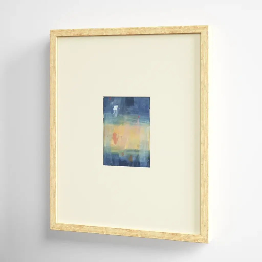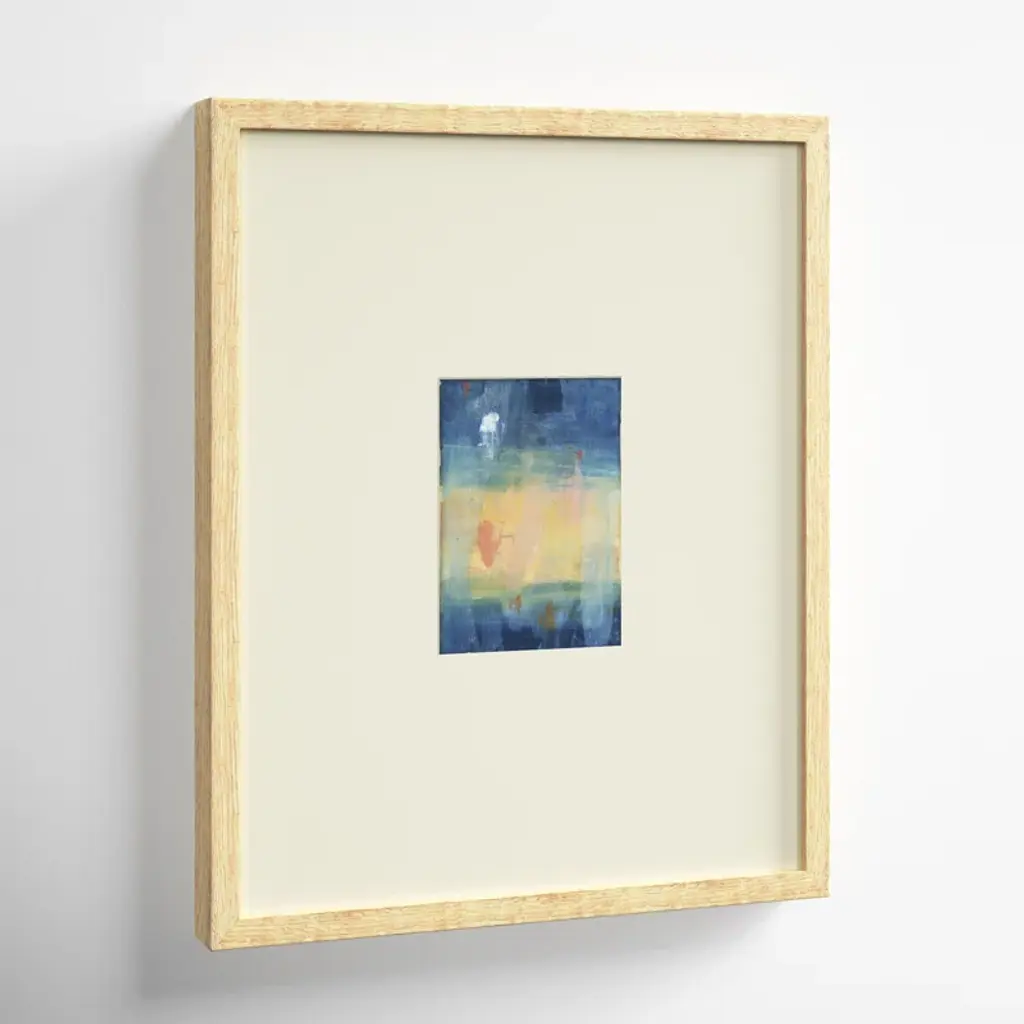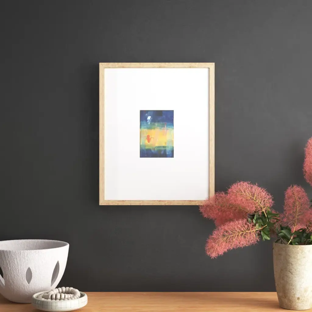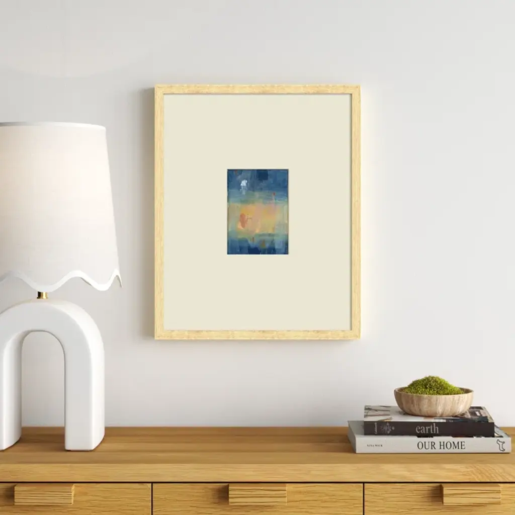This graphic art print may look simple, but it makes a bold statement with its understated elegance. This USA-made painting print is giclee printed on archival paper for a museum-worthy look you'll love to show off. We love the rich hues of beige, orange, and blue and the abstract rendering that almost reminds us of a starry night sky. This print comes mounted in an artisan handcrafted wood molding that's imported from Europe, so it's ready to hang as soon as it arrives.