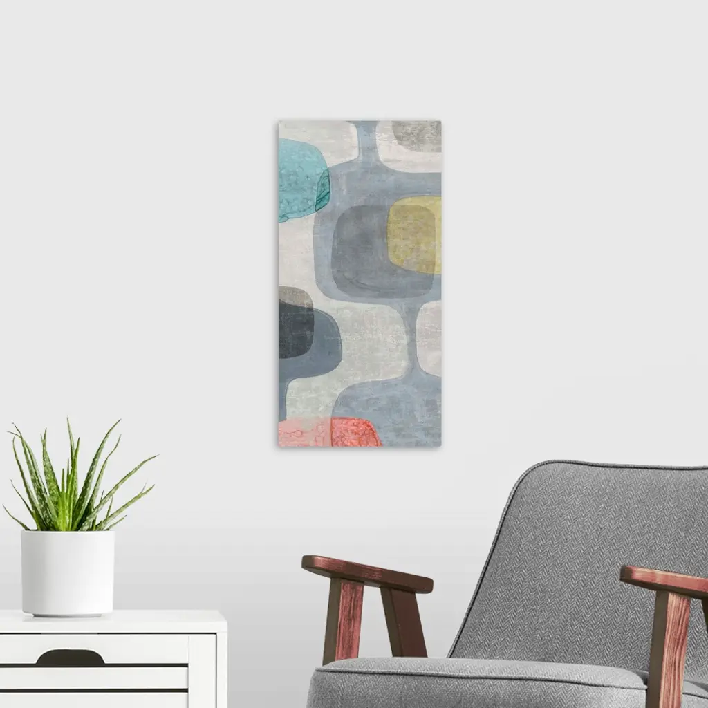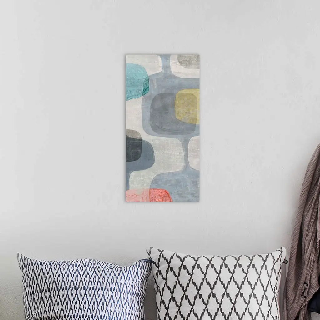 Abstract panel painting with retro design in blue, gray, yellow, and red hues.