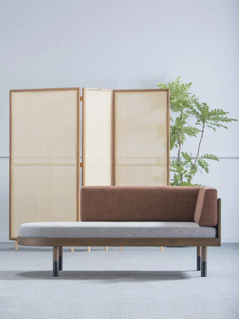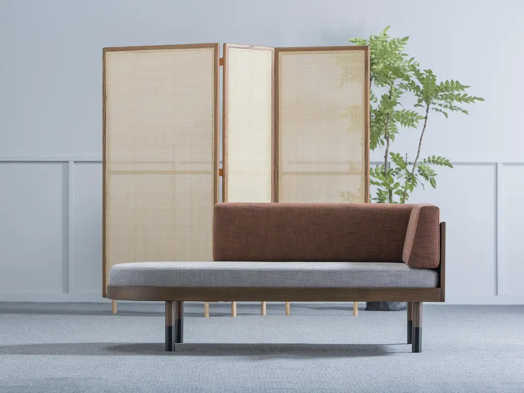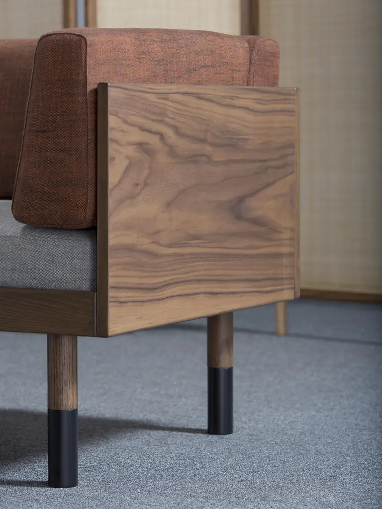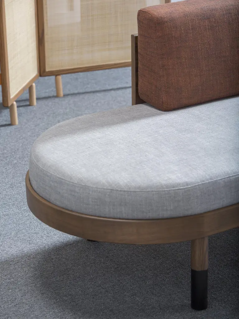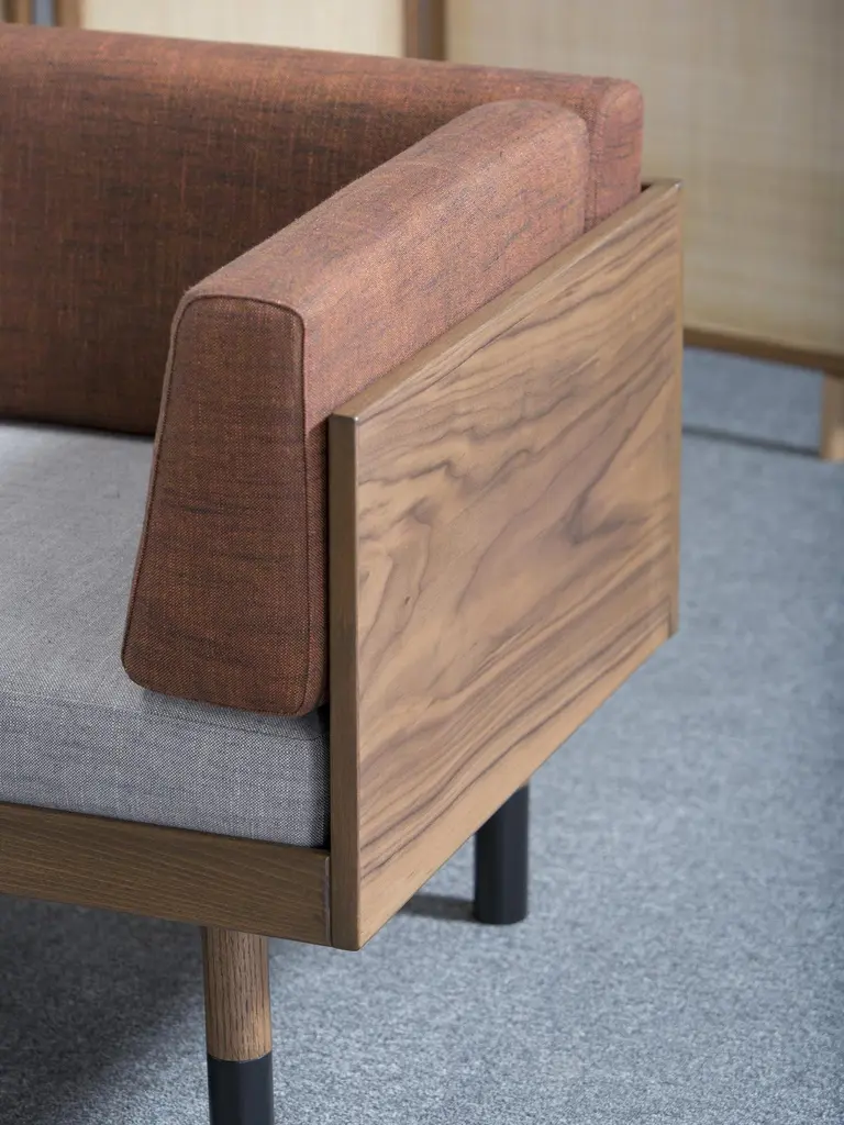 Mid Corner Sofa by Kann DesignDimensions: D 70 x W 170 x H 74 cm.Materials: Solid wood, steel, wood veneer, HR foam, fabric upholstery - seating: Sahco Ellis 4- back: Sahco Ellis 18 (70% viscose, 30 % linen).Available in other fabrics.Designed by Meghedi Simonian, the Mid Corner sofa plays on the contrast between the walnut backrest, decorated with two cushions at a reclining angle, and the rounded shape of the seat which helps structure the space.The choice of colour combines two opposite shades: grey and brick red extend and accentuate the horizontality of the seat’s lines.Founded in 2010, Kann Design is a furniture-making brand that brings together the know-how of the Kanaan workshop and the talents of independent designers. Kann’s adventure is above all a family story: what distinguishes it from the rest is the skilled work of the craftsmen of Kanaan, a collective founded in 1958 in Beit Chabab, Lebanon, by the father of Houssam, the founder of Kann Design, himself a cabinetmaker.Since its creation, the studio has shown and gained great skills in cabinetmaking, painting, tapestry, and welding, and since 2017, thanks to Houssam’s brother, Samer Kanaan, the workshops have been modernized and expanded to accommodate Kann’s ever-more ambitious projects, particularly customized orders for specific projects carried out in collaboration with architects.