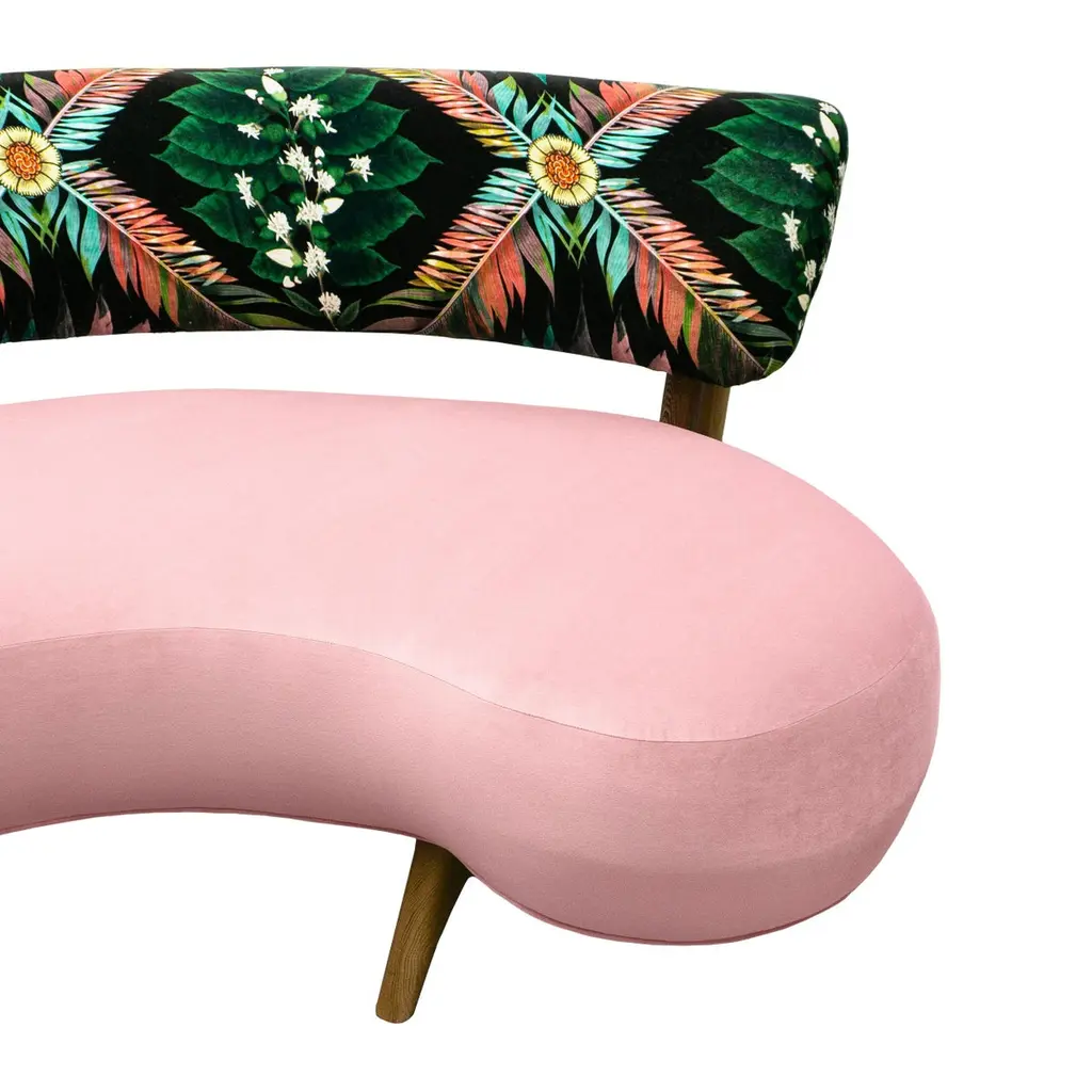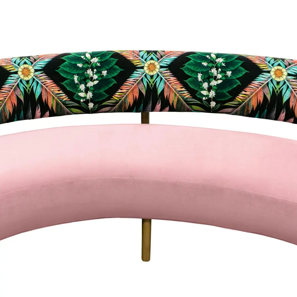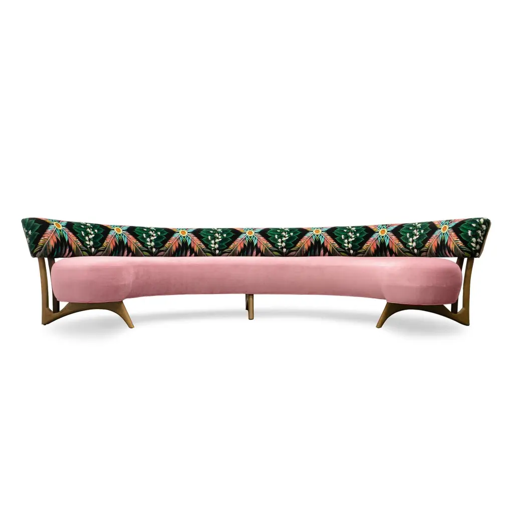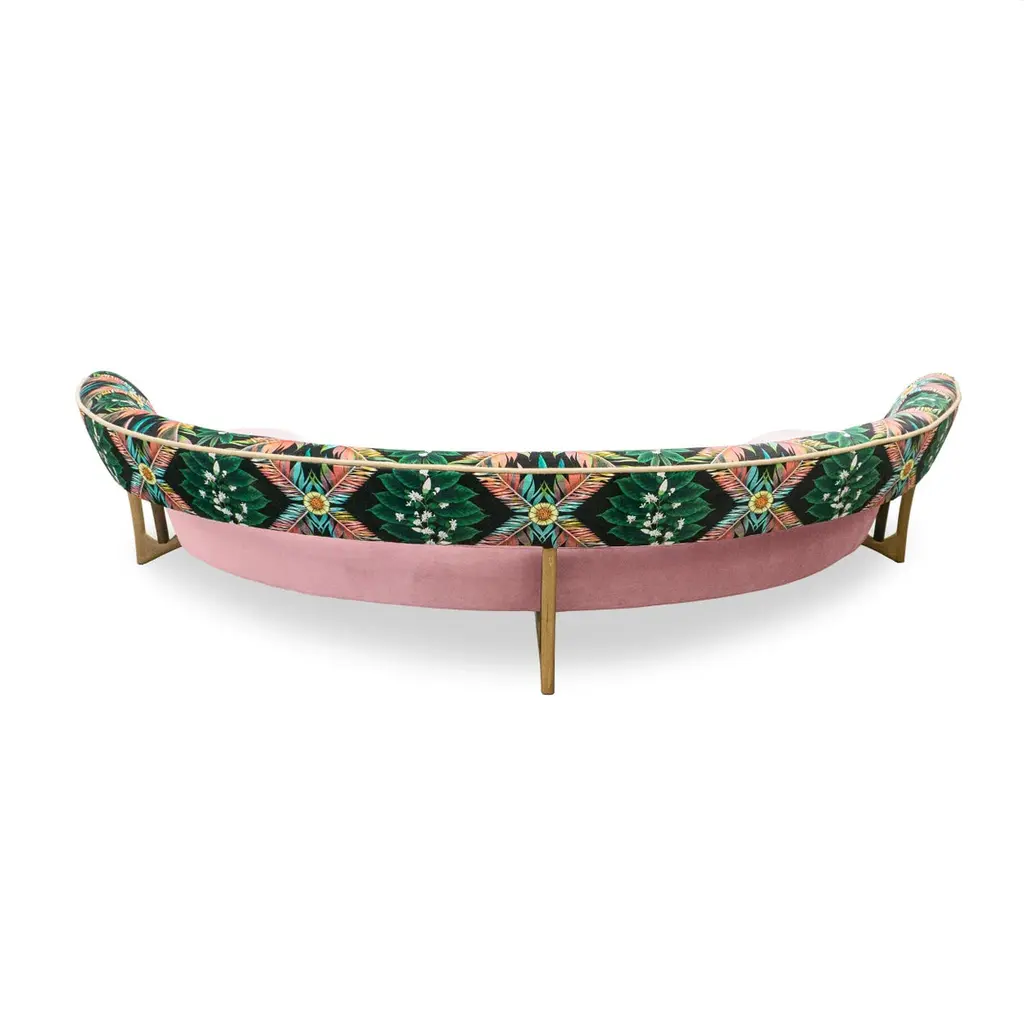 This midcentury floating curved sofa features a soft decorative printed velvet from Christian Lacroix on the back, a rich pile velvet weave in blossom pink on the seat, burlap welting on the back edges and morado accented stained white oak curved legs.Interior/upholstered frame is solid hard maple. It has a tight seat and back cushion design. Seat cushion is made with a feather wrapped cushion supported by 8-way hand tied springs.Measures: Overall: 137”W x 29”D x 31”HDepth with curve: 70”Inside: 137”W x 21”D x 14”HSeat Height: 18"Price As Shown: $13,650 eachCOM Price: $11,270 eachCustomization may change the price.How We Work:Made to order by Connecticut-based furniture design and manufacturing company The Tailored Home. Submit your customization desires by 1stdibs messenger for a quote. After orders are placed our workshop manager creates a visual work order for your approval for quality assurance.We accept inspiration photos of pieces you like.2021 - Made to Order.9-10 weeks.