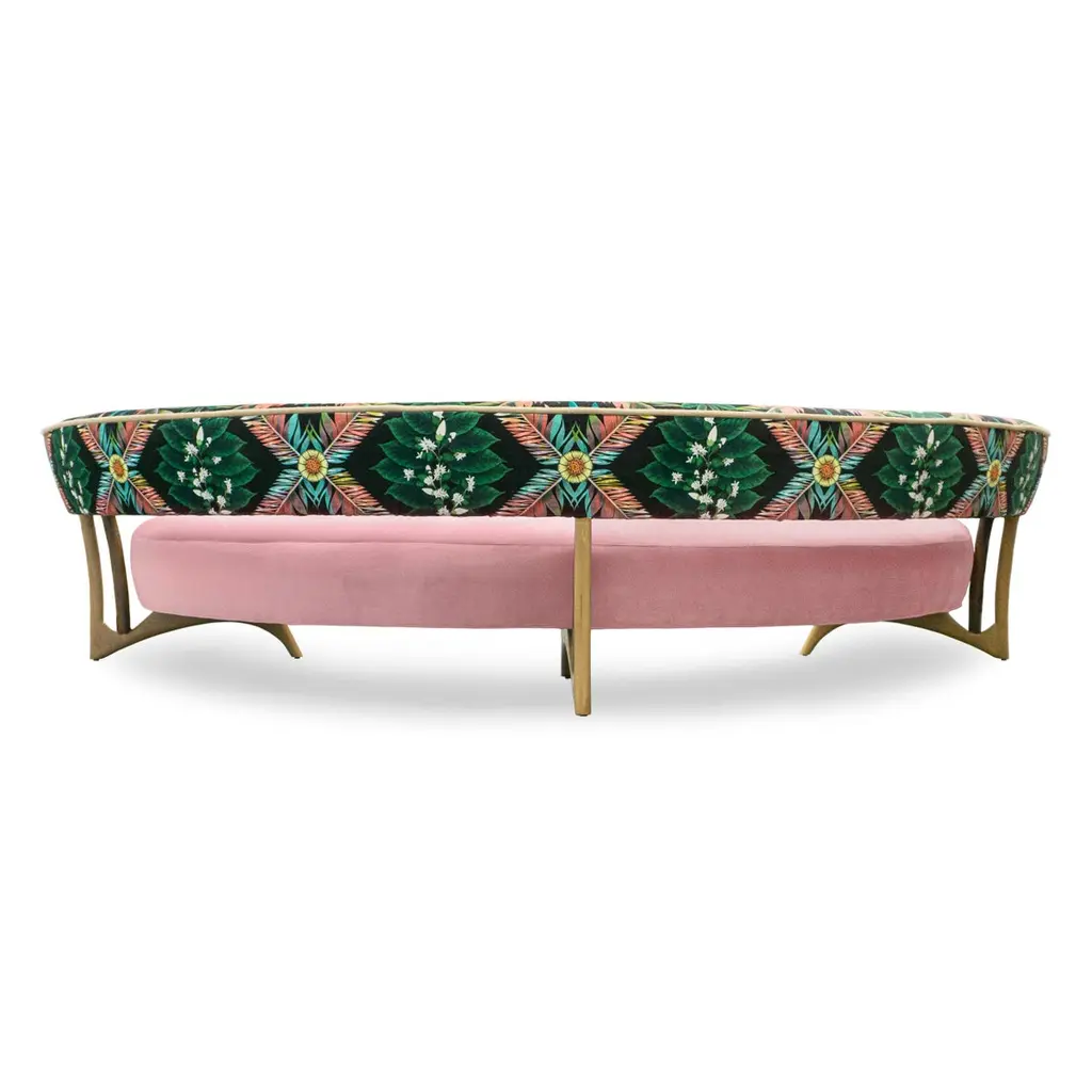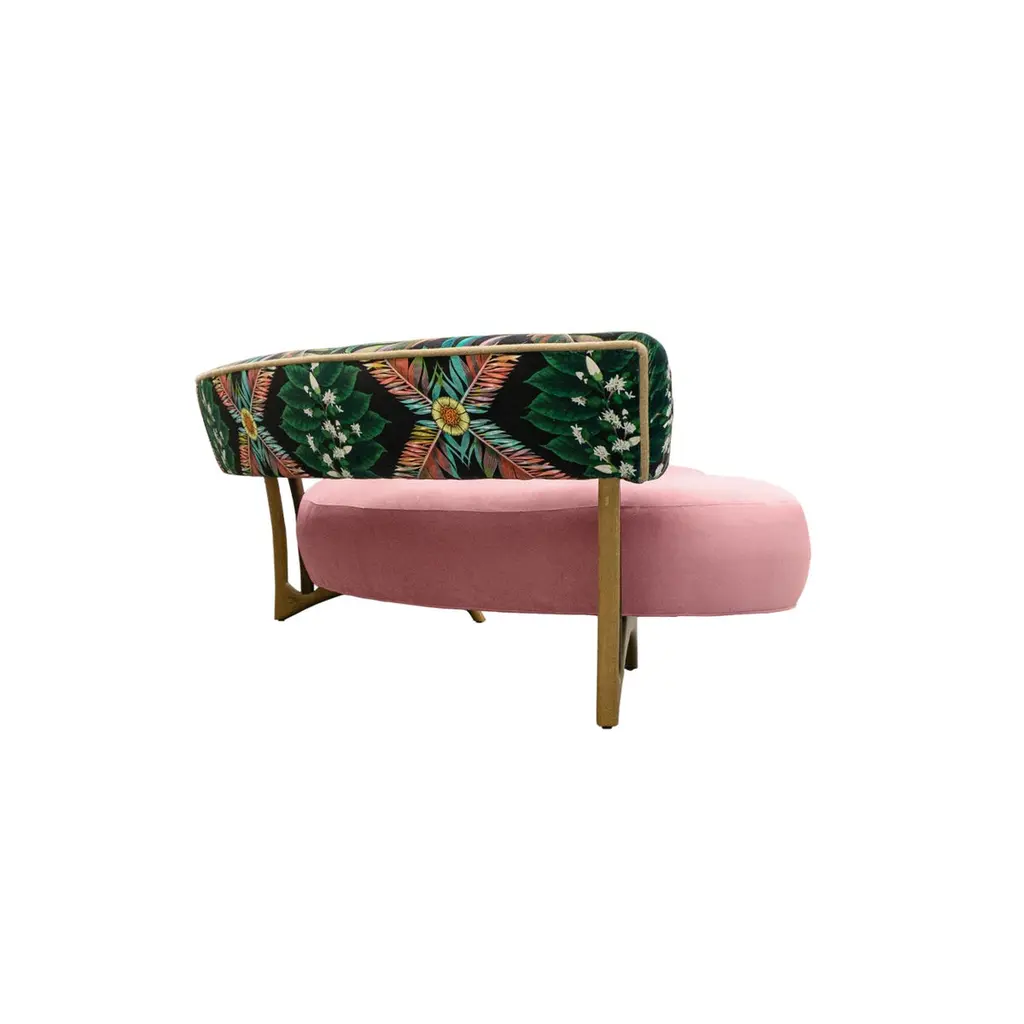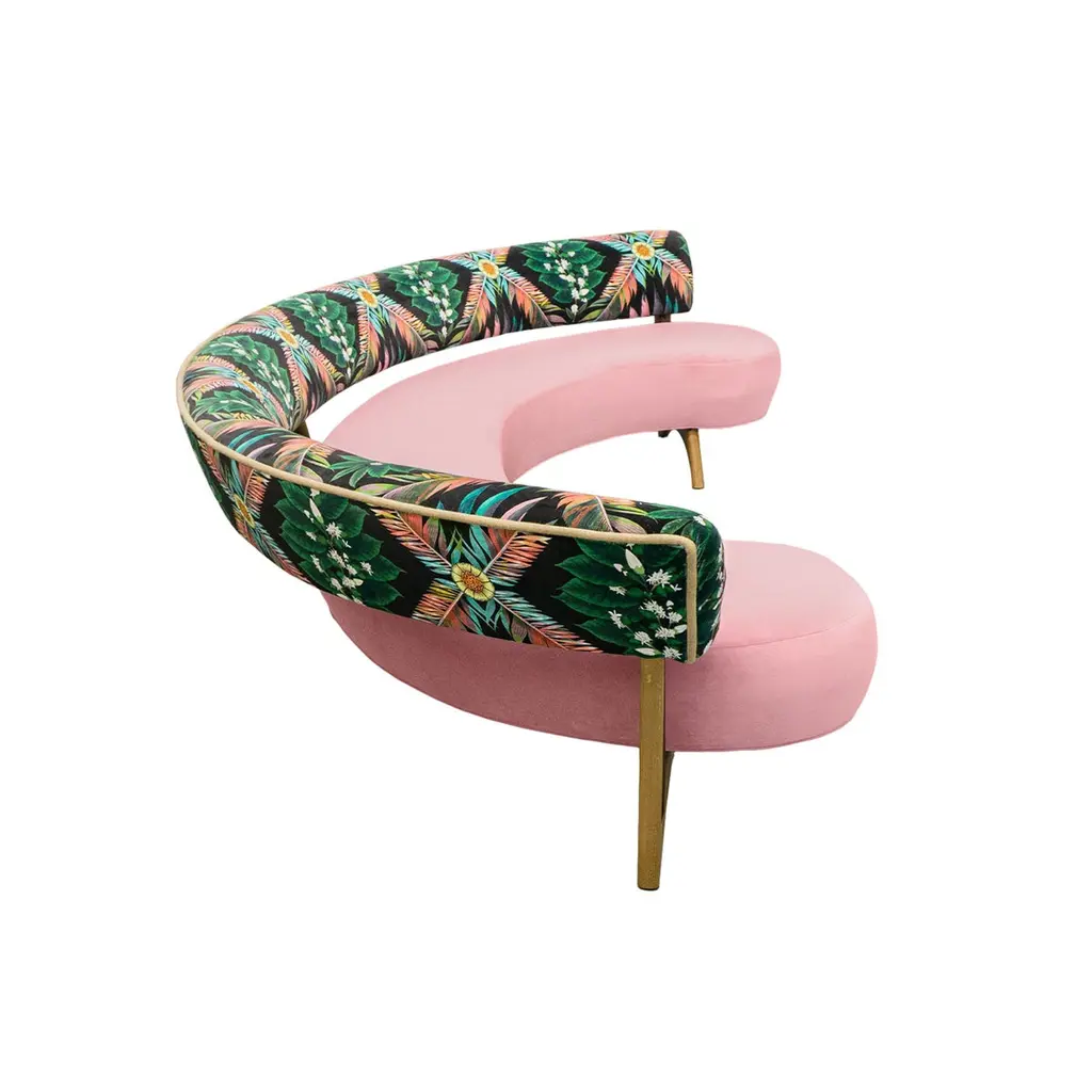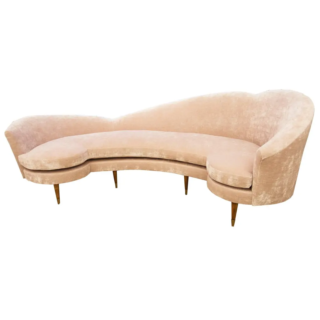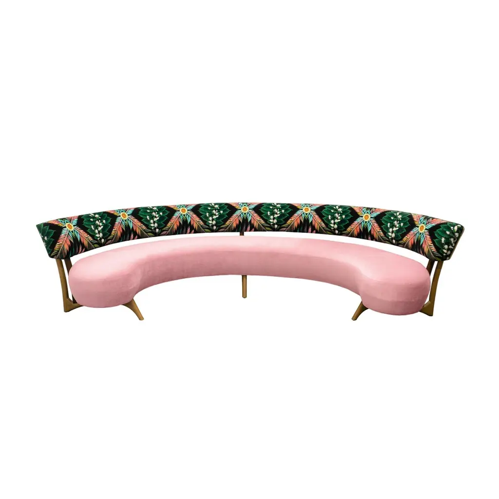 This midcentury floating curved sofa features a soft decorative printed velvet from Christian Lacroix on the back, a rich pile velvet weave in blossom pink on the seat, burlap welting on the back edges and morado accented stained white oak curved legs.Interior/upholstered frame is solid hard maple. It has a tight seat and back cushion design. Seat cushion is made with a feather wrapped cushion supported by 8-way hand tied springs.Measures: Overall: 137”W x 29”D x 31”HDepth with curve: 70”Inside: 137”W x 21”D x 14”HSeat Height: 18"Price As Shown: $13,650 eachCOM Price: $11,270 eachCustomization may change the price.How We Work:Made to order by Connecticut-based furniture design and manufacturing company The Tailored Home. Submit your customization desires by 1stdibs messenger for a quote. After orders are placed our workshop manager creates a visual work order for your approval for quality assurance.We accept inspiration photos of pieces you like.2021 - Made to Order.9-10 weeks.