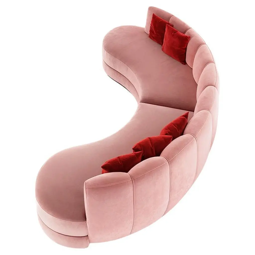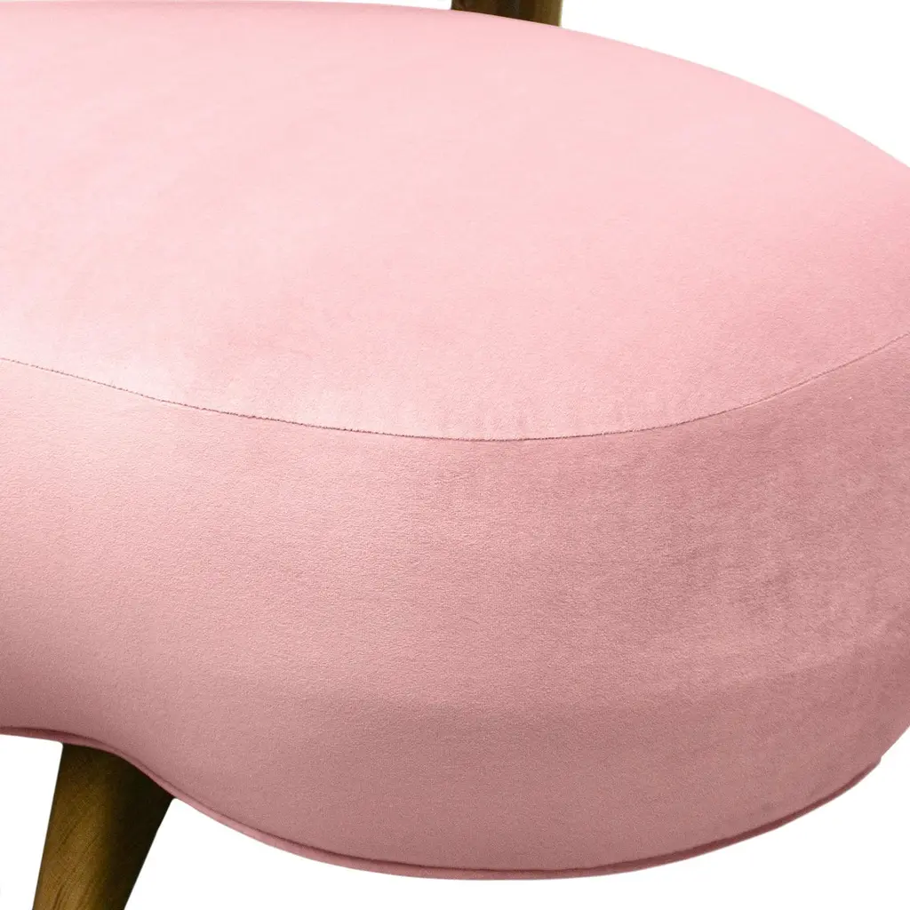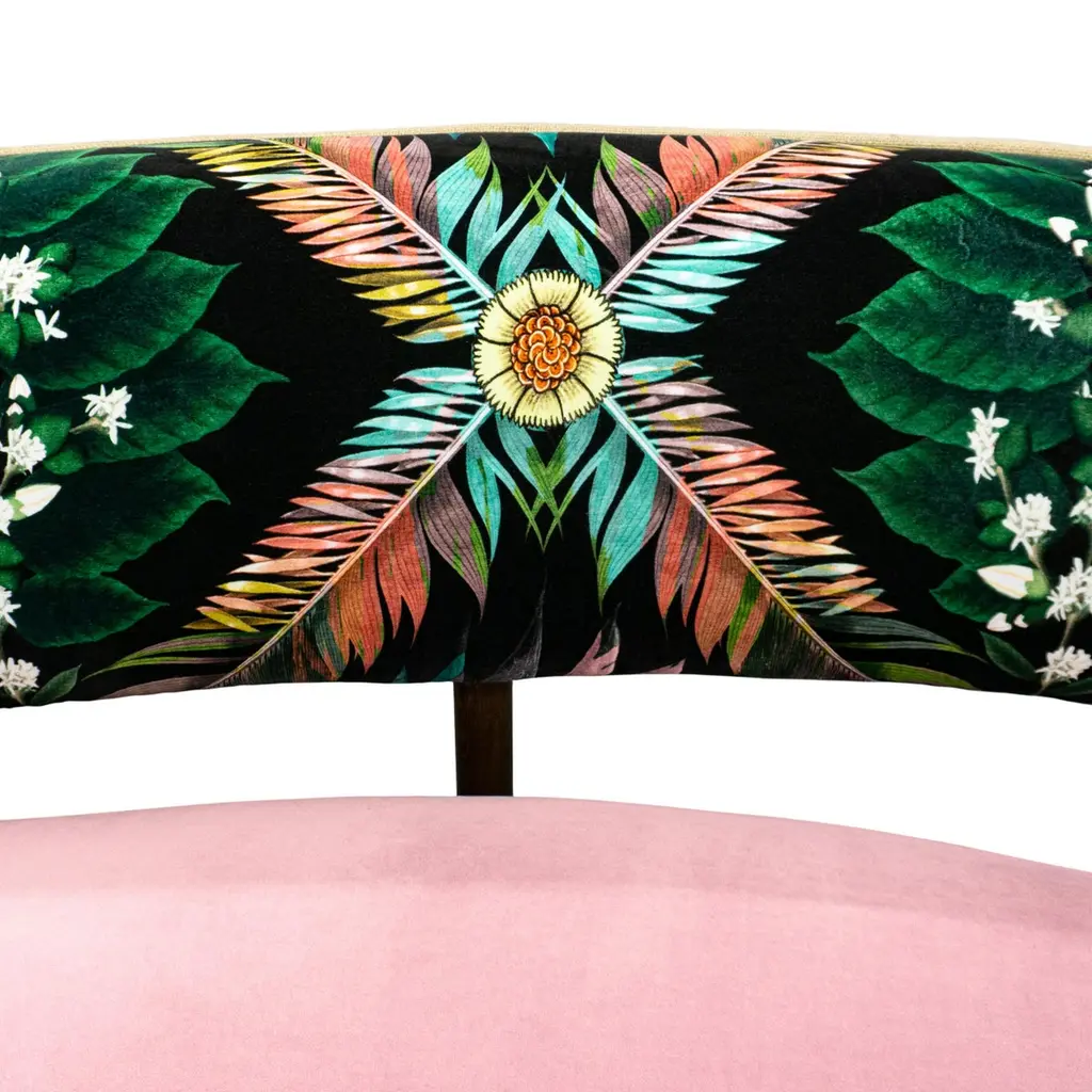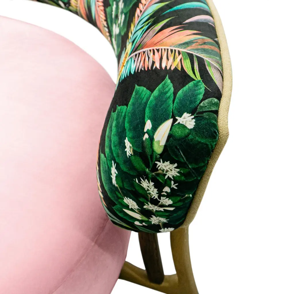 This midcentury floating curved sofa features a soft decorative printed velvet from Christian Lacroix on the back, a rich pile velvet weave in blossom pink on the seat, burlap welting on the back edges and morado accented stained white oak curved legs.Interior/upholstered frame is solid hard maple. It has a tight seat and back cushion design. Seat cushion is made with a feather wrapped cushion supported by 8-way hand tied springs.Measures: Overall: 137”W x 29”D x 31”HDepth with curve: 70”Inside: 137”W x 21”D x 14”HSeat Height: 18"Price As Shown: $13,650 eachCOM Price: $11,270 eachCustomization may change the price.How We Work:Made to order by Connecticut-based furniture design and manufacturing company The Tailored Home. Submit your customization desires by 1stdibs messenger for a quote. After orders are placed our workshop manager creates a visual work order for your approval for quality assurance.We accept inspiration photos of pieces you like.2021 - Made to Order.9-10 weeks.