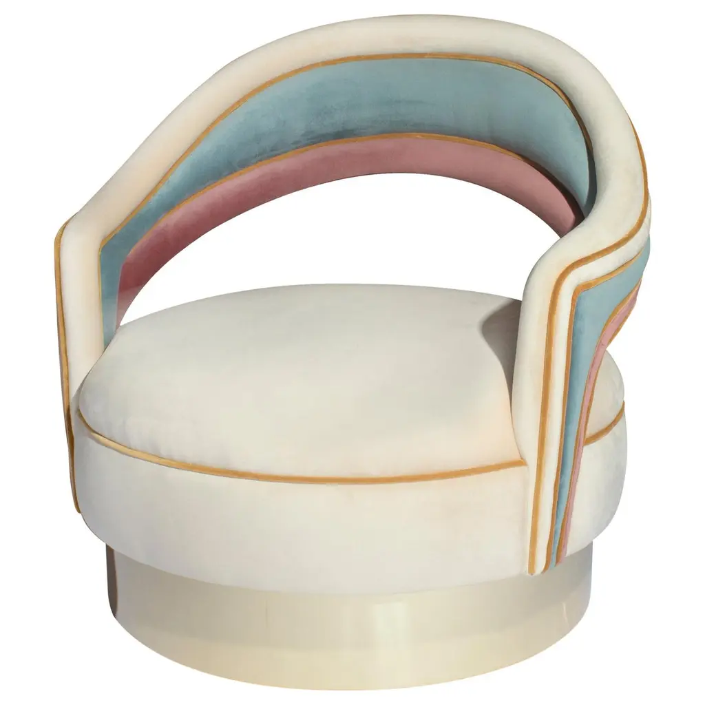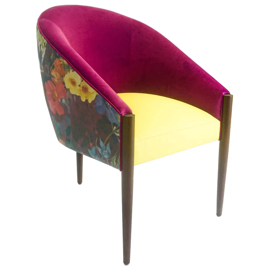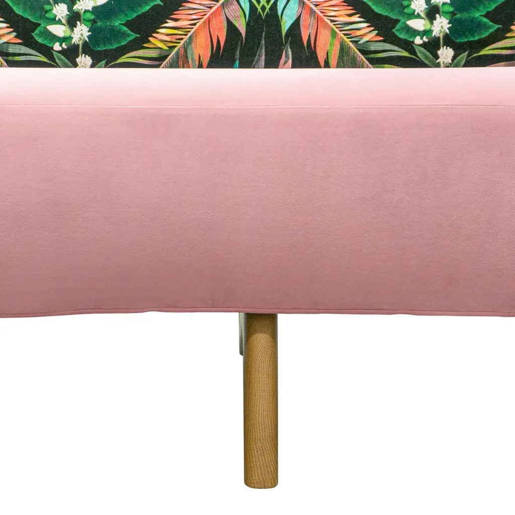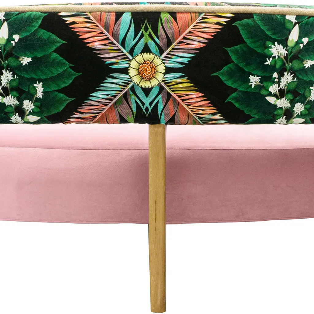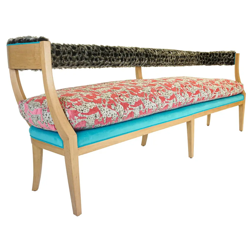This midcentury floating curved sofa features a soft decorative printed velvet from Christian Lacroix on the back, a rich pile velvet weave in blossom pink on the seat, burlap welting on the back edges and morado accented stained white oak curved legs.Interior/upholstered frame is solid hard maple. It has a tight seat and back cushion design. Seat cushion is made with a feather wrapped cushion supported by 8-way hand tied springs.Measures: Overall: 137”W x 29”D x 31”HDepth with curve: 70”Inside: 137”W x 21”D x 14”HSeat Height: 18"Price As Shown: $13,650 eachCOM Price: $11,270 eachCustomization may change the price.How We Work:Made to order by Connecticut-based furniture design and manufacturing company The Tailored Home. Submit your customization desires by 1stdibs messenger for a quote. After orders are placed our workshop manager creates a visual work order for your approval for quality assurance.We accept inspiration photos of pieces you like.2021 - Made to Order.9-10 weeks.