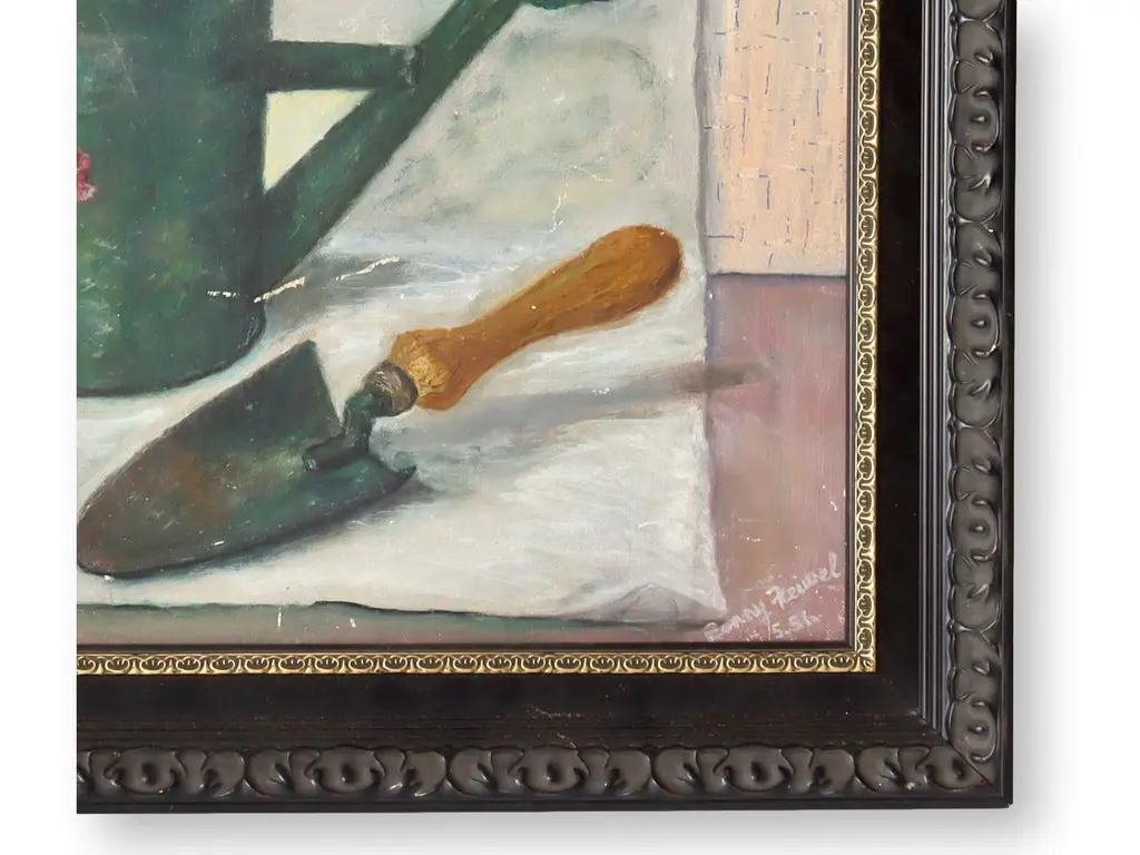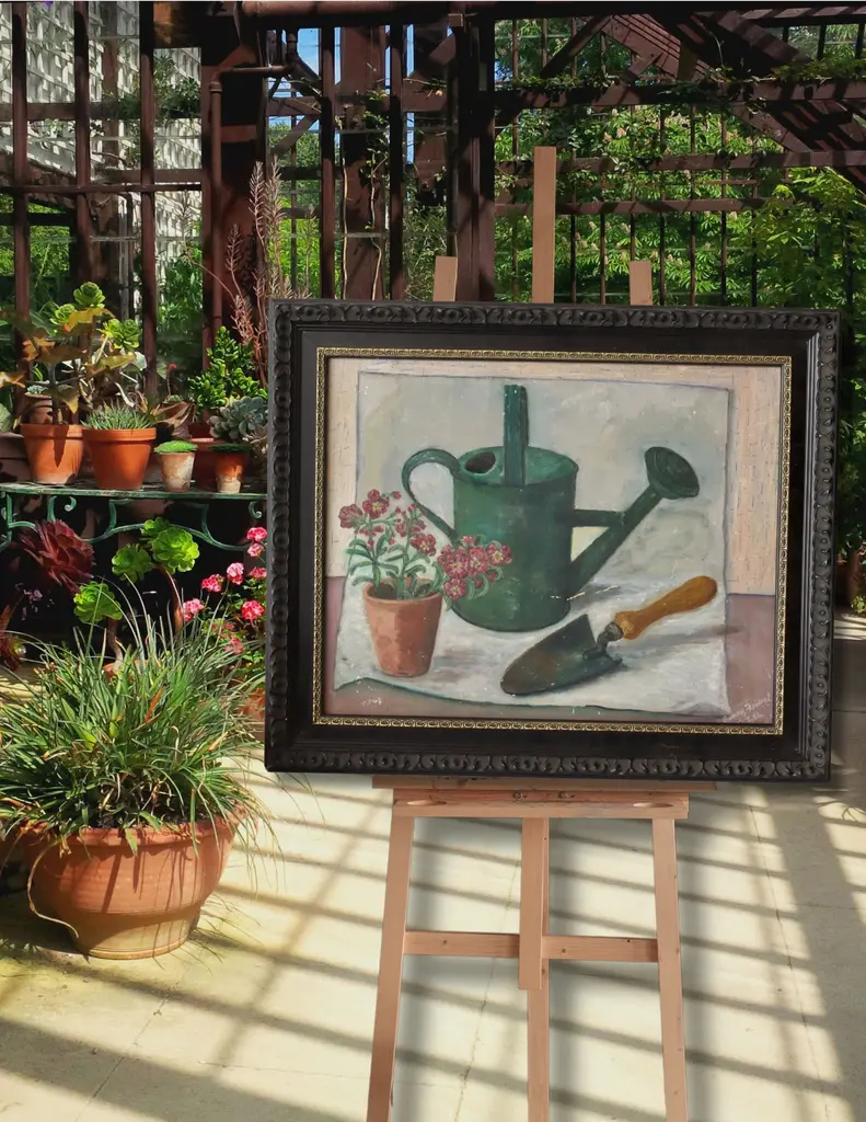 Midcentury English painting showcasing a still life of gardening essentials. A vibrant green watering can takes center stage, accompanied by blooming red flowers in a terracotta pot and a hand trowel with a wooden handle. The scene exudes rustic charm and captures a moment of pastoral English life. Painted on canvas mounted board and set in an ornate dark frame, this piece is a testament to the everyday beauty of rural England during the mid-20th century.