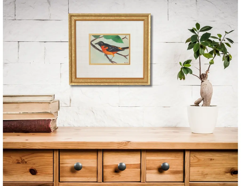 Midcentury oil on canvas showcases a vibrant depiction of a colorful bird, captured with a blend of precise brush strokes and artistic flair. The small-sized canvas encapsulates the essence of the era, with its rich hues and meticulous detailing, making the bird seem alive and ready to take flight. An exquisite piece, it stands as a testament to the midcentury fascination with nature and art's ability to bring it to life in the most enchanting way. I