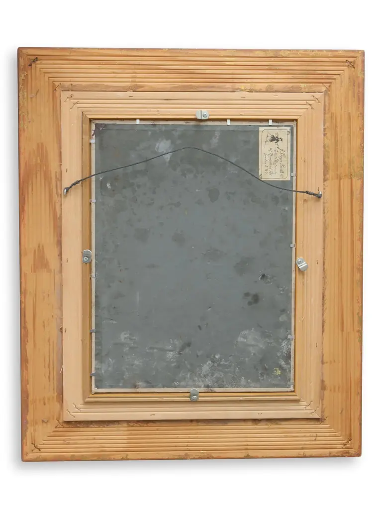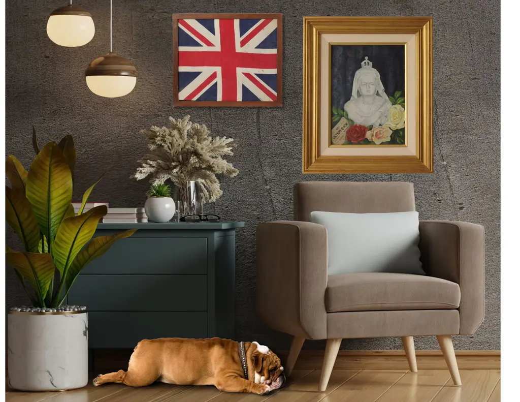 This midcentury oil on board piece showcases a meticulous portrait of Queen Victoria's bust, framed exquisitely in gold. The artwork is accentuated with a ration book, labeled with the surname "Robbins" and dated 1950-1951, set amidst vibrant roses. The inclusion of the ration book, specific to a period post-WWII, offers an intriguing juxtaposition to the iconic British monarch. Unsigned.