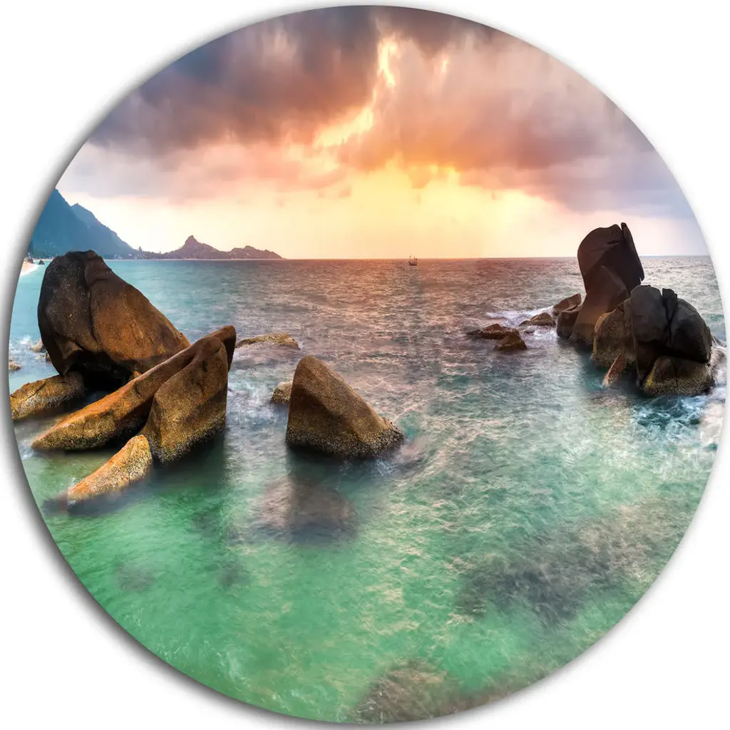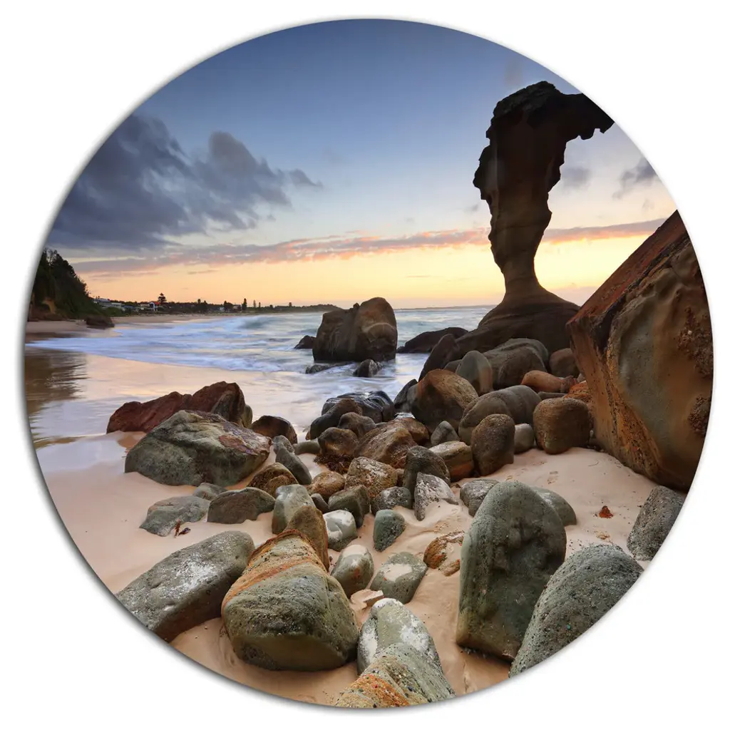 Bring Contemporary Abstraction to your home with this large Circle Metal wall art. This Midday Moeraki Boulders Metal Artwork makes it the focal point of any room or office. - White Gloss Coating ensures colors are extra vibrant with light reflection.- Aluminum grade Sheet Metal with 1 inch mounting frame on the back giving the illusion that the artwork is floating on the wall..- Mounting Brackets are included along with instructions.- High Quality Digital images are created directly into a glossy aluminum panel producing a stunning and captivating print into the glossy finish of the metal.- Water, Fire and Scratch resistant HD Aluminum panels.- Looks better than any photo paper and guaranteed to last at least 20 years- Easy to clean with a microfiber cloth. Colors are far superior to regular Canvas Art. - Easy to Hang