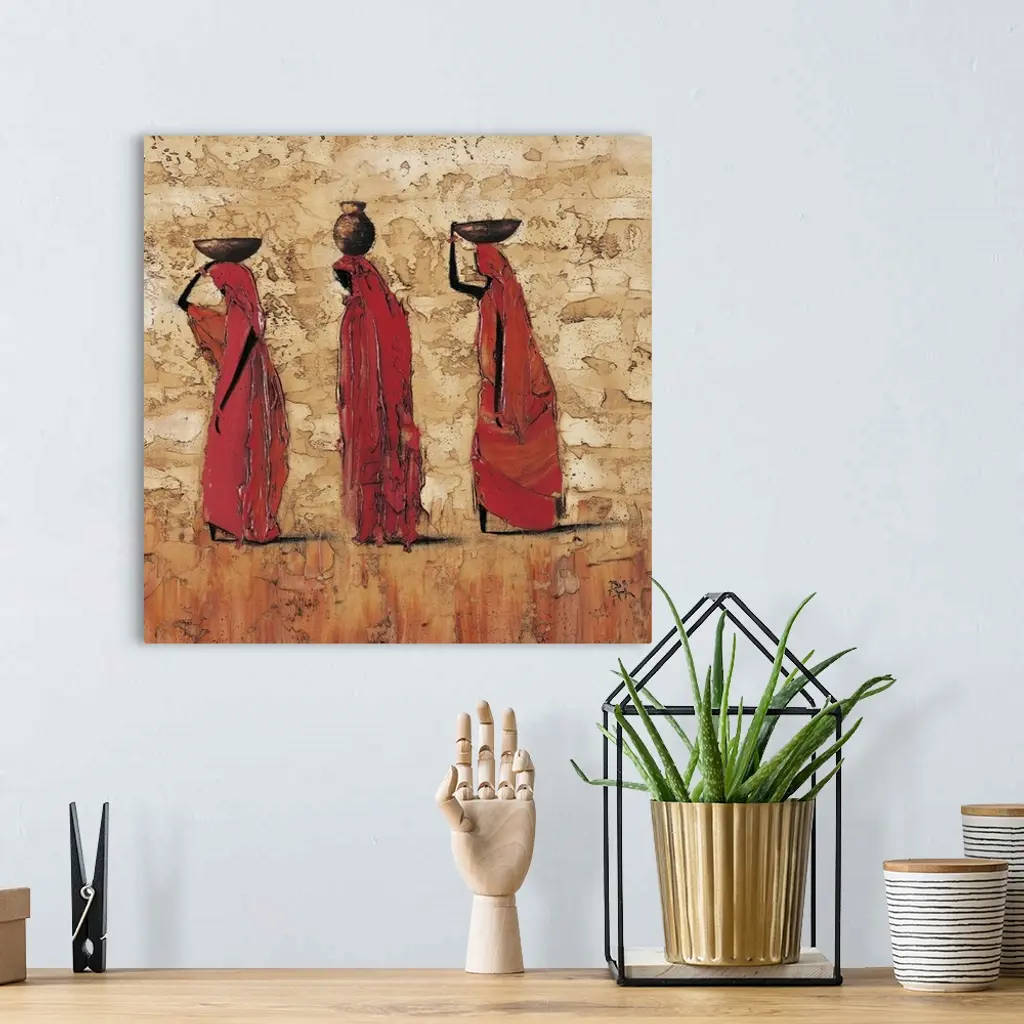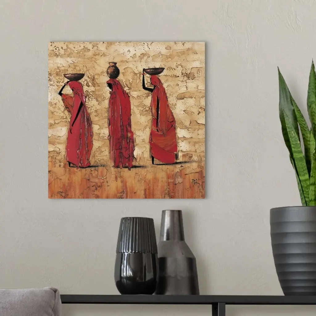Contemporary painting of tribal figures carrying food and water on their heads.