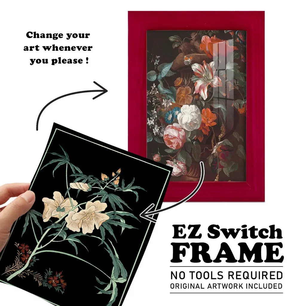 Midnight Floral II -EZ SWITCH Framed Print w/glass-Cherry Red A delightful, framed print. Featuring a solid wood frame with real wood glass. This premium print is giclee quality. In addition, every frame features a removable back and table top stand. This allows you to change your art in the future or to just stand the art on a table for a new look. We are sure you'll enjoy our new series of EZ SWITCH Framed Art. Solid Wood Frame Real Glass Removable / Replaceable Art Built in Tabletop Stand Sizes range from 4x6 up to 12x15 - buy just one or pair them up as sets as you see fit.