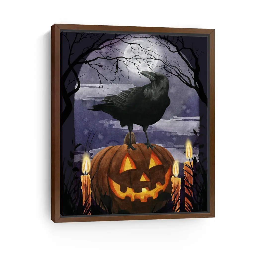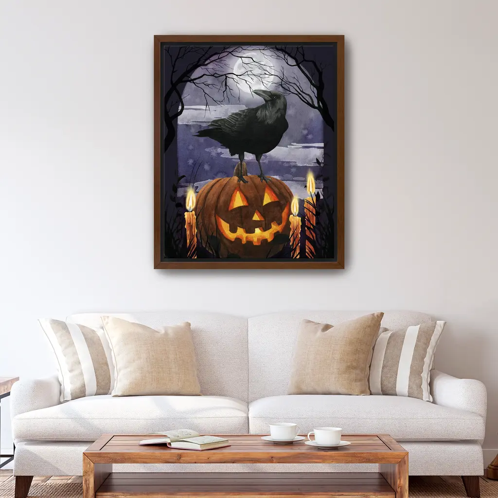 A brooding raven atop a glowing jack-o-lantern sets the tone for eerie elegance. It's the kind of spooky pairing that whispers mystery into every corner. Our Gallery Wrap Canvas Prints are proudly assembled with high quality materials in California, USA. Each piece is printed on a thick, archival grade canvas using Giclee technology. It is then hand-stretched by our experienced artisans over solid wood bars, which will not warp over time. The final product is a piece personally crafted for you to confidently display on your wall. Care and Assembly: Ensure that the location of your piece has little to no exposure to heat, sunlight, and moisture. Wipe clean, only if needed. Each piece includes a sawtooth hanger to hang on your wall vertically.
