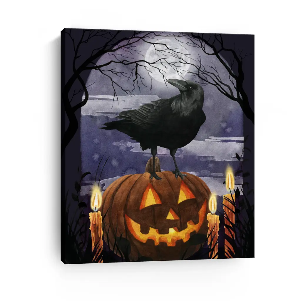 A brooding raven atop a glowing jack-o-lantern sets the tone for eerie elegance. It's the kind of spooky pairing that whispers mystery into every corner. Our Gallery Wrap Canvas Prints are proudly assembled with high quality materials in California, USA. Each piece is printed on a thick, archival grade canvas using Giclee technology. It is then hand-stretched by our experienced artisans over solid wood bars, which will not warp over time. The final product is a piece personally crafted for you to confidently display on your wall. Care and Assembly: Ensure that the location of your piece has little to no exposure to heat, sunlight, and moisture. Wipe clean, only if needed. Each piece includes a sawtooth hanger to hang on your wall vertically.