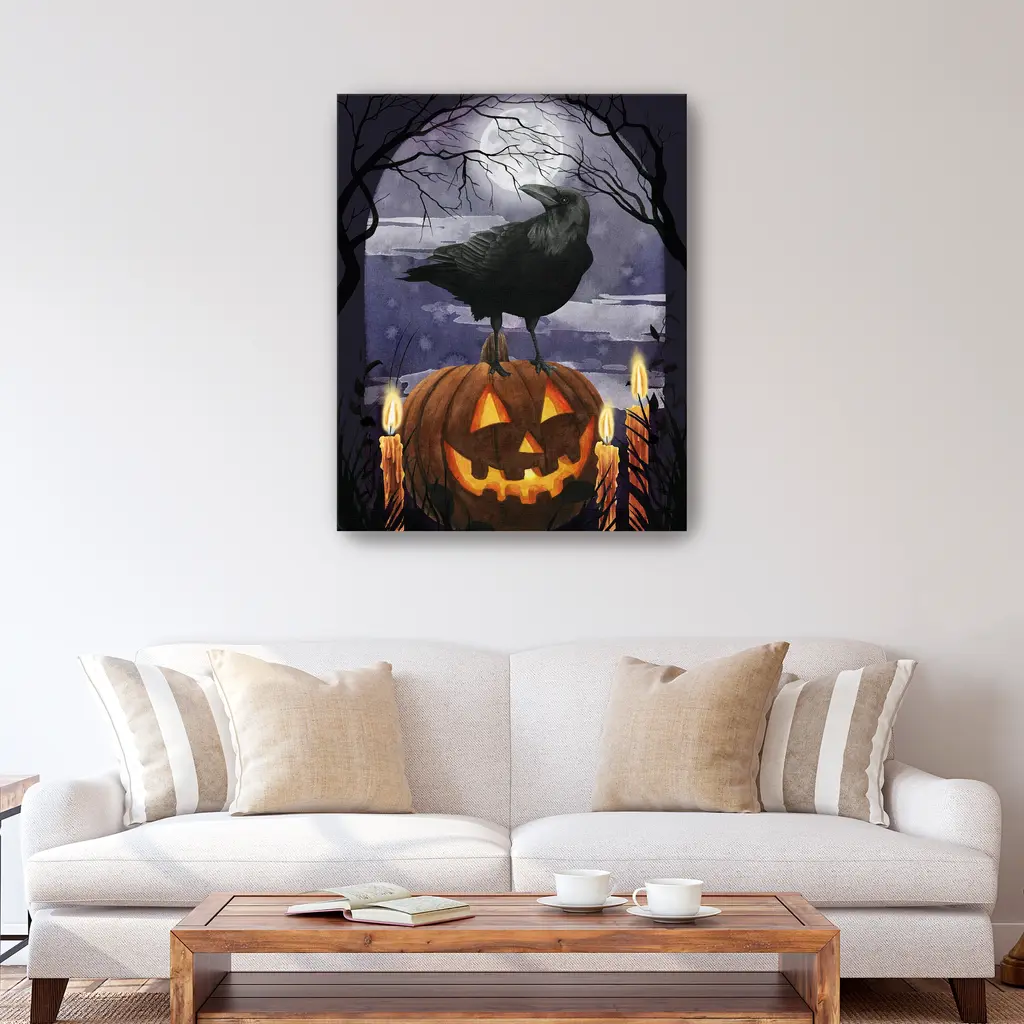 A brooding raven atop a glowing jack-o-lantern sets the tone for eerie elegance. It's the kind of spooky pairing that whispers mystery into every corner. Our Gallery Wrap Canvas Prints are proudly assembled with high quality materials in California, USA. Each piece is printed on a thick, archival grade canvas using Giclee technology. It is then hand-stretched by our experienced artisans over solid wood bars, which will not warp over time. The final product is a piece personally crafted for you to confidently display on your wall. Care and Assembly: Ensure that the location of your piece has little to no exposure to heat, sunlight, and moisture. Wipe clean, only if needed. Each piece includes a sawtooth hanger to hang on your wall vertically.