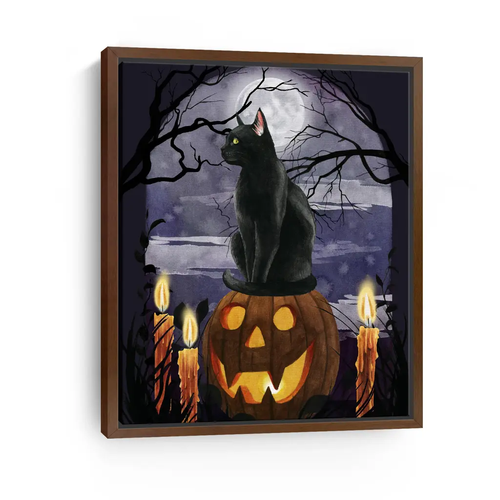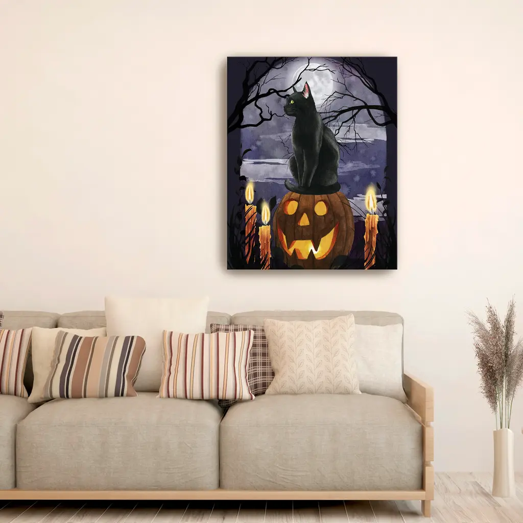 Perched on a jack-o-lantern’s fiery grin, the black cat watches the shadows shift. A festive fusion of feline elegance and spooky delight. Our Gallery Wrap Canvas Prints are proudly assembled with high quality materials in California, USA. Each piece is printed on a thick, archival grade canvas using Giclee technology. It is then hand-stretched by our experienced artisans over solid wood bars, which will not warp over time. The final product is a piece personally crafted for you to confidently display on your wall. Care and Assembly: Ensure that the location of your piece has little to no exposure to heat, sunlight, and moisture. Wipe clean, only if needed. Each piece includes a sawtooth hanger to hang on your wall vertically.