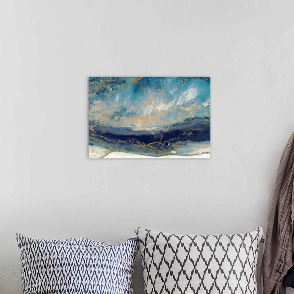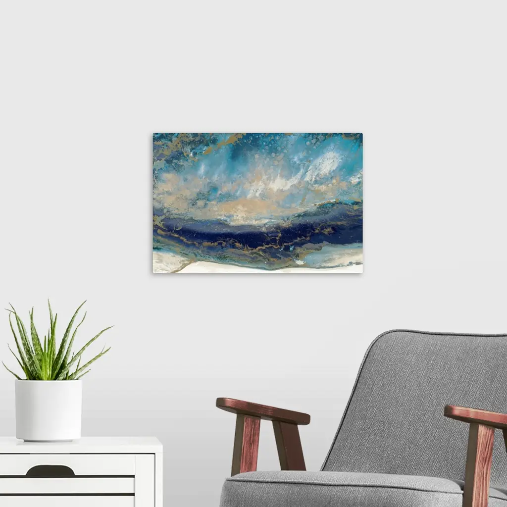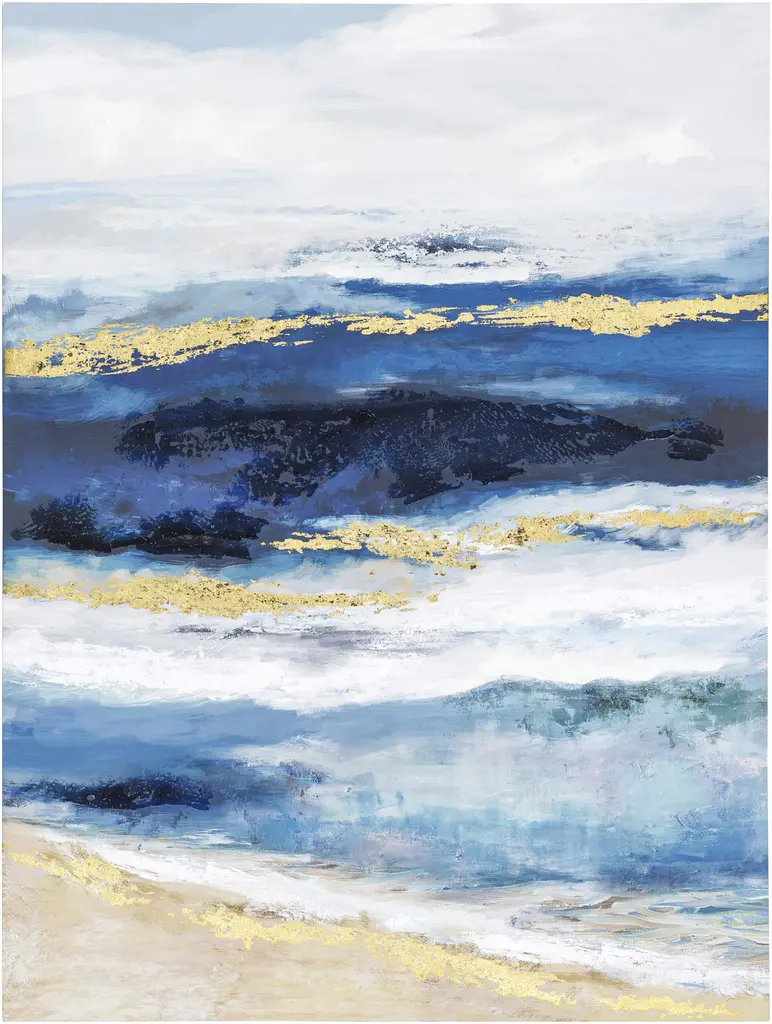 Contemporary abstract artwork in blue and gold, resembling a seascape.