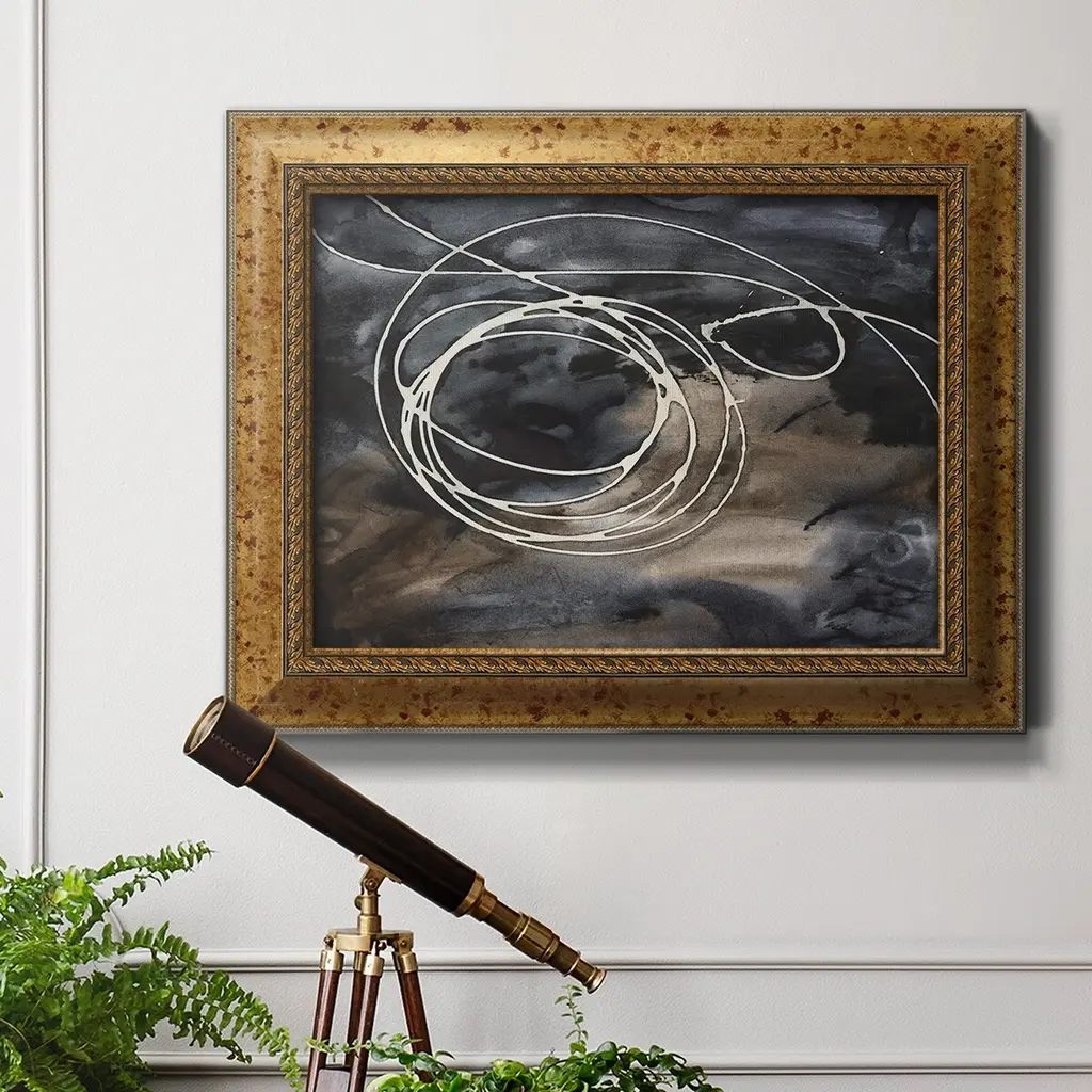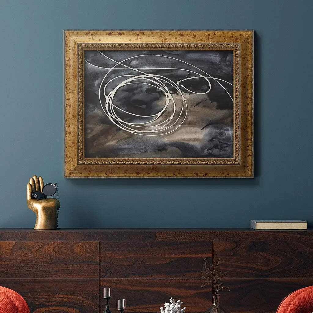 Midnight Swirl II Premium Framed Canvas- Ready to Hang A Premium Framed Canvas created to last. Framed in distressed wood and available in an array of sizes and colors Featuring a beveled a solid wood stretcher bar, each piece comes ready to hand 3 SIZES AVAILABLE 16''X20'' - Overall Size 18'X27'' - Overall Size 24''x36'' - Overall Size Each piece is made to order. Each piece comes with hanging hardware. Made in the USA Ready to Hang Giclee Paper Print Acrylic Glass Beveled Matt Board