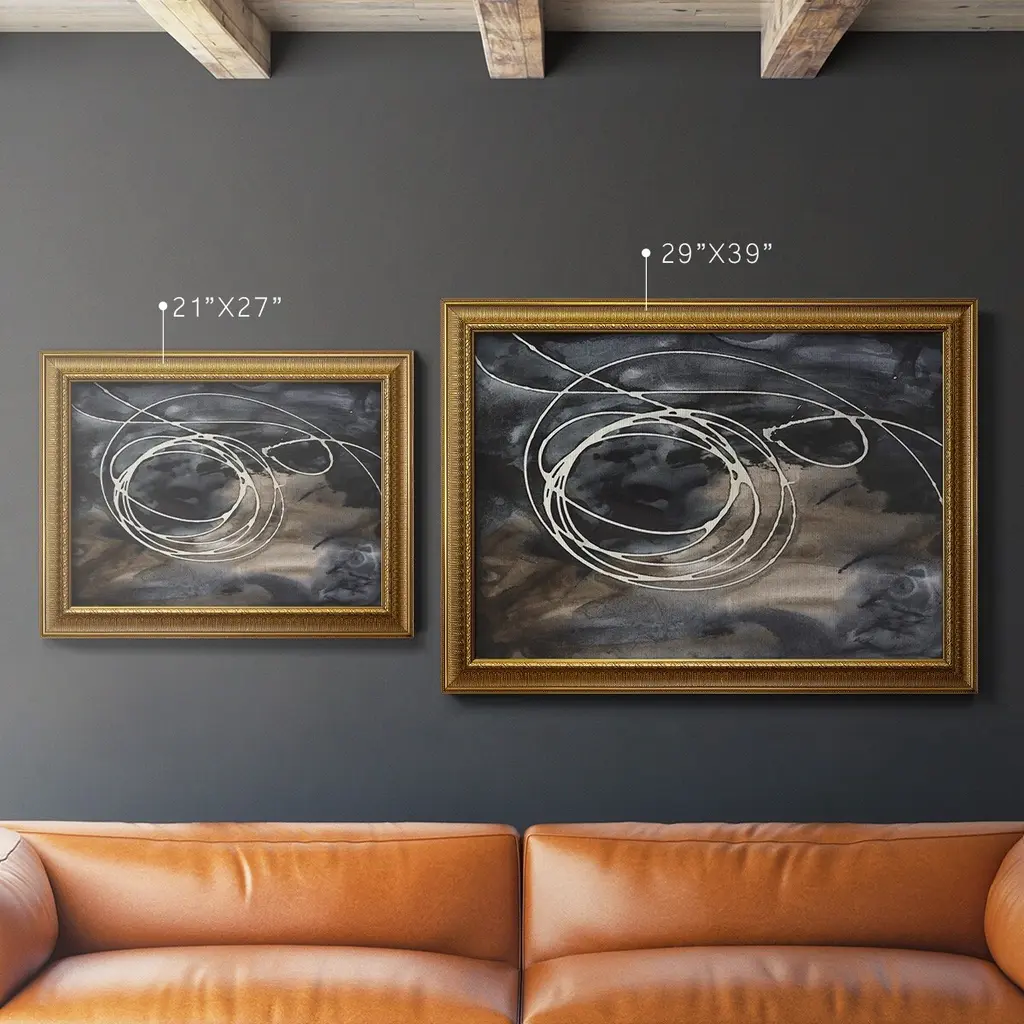 Midnight Swirl II Premium Framed Canvas- Ready to Hang A Premium Framed Canvas created to last. Framed in distressed wood and available in an array of sizes and colors Featuring a beveled a solid wood stretcher bar, each piece comes ready to hand 3 SIZES AVAILABLE 16''X20'' - Overall Size 18'X27'' - Overall Size 24''x36'' - Overall Size Each piece is made to order. Each piece comes with hanging hardware. Made in the USA Ready to Hang Giclee Paper Print Acrylic Glass Beveled Matt Board