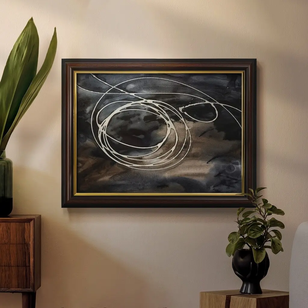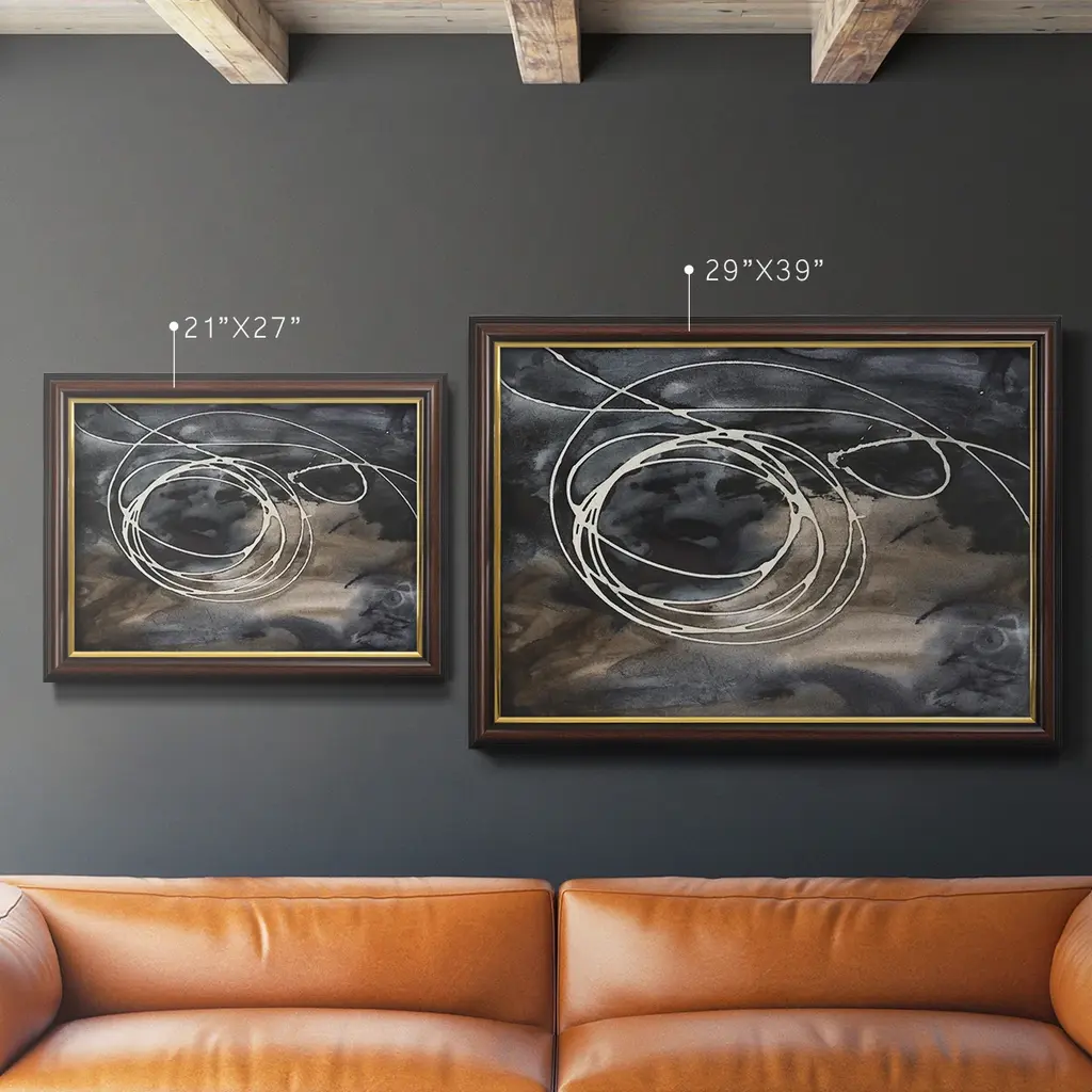 Midnight Swirl II Premium Framed Canvas- Ready to Hang A Premium Framed Canvas created to last. Framed in distressed wood and available in an array of sizes and colors Featuring a beveled a solid wood stretcher bar, each piece comes ready to hand 3 SIZES AVAILABLE 16''X20'' - Overall Size 18'X27'' - Overall Size 24''x36'' - Overall Size Each piece is made to order. Each piece comes with hanging hardware. Made in the USA Ready to Hang Giclee Paper Print Acrylic Glass Beveled Matt Board