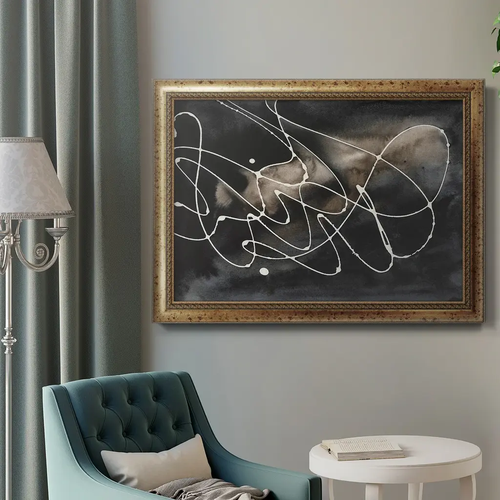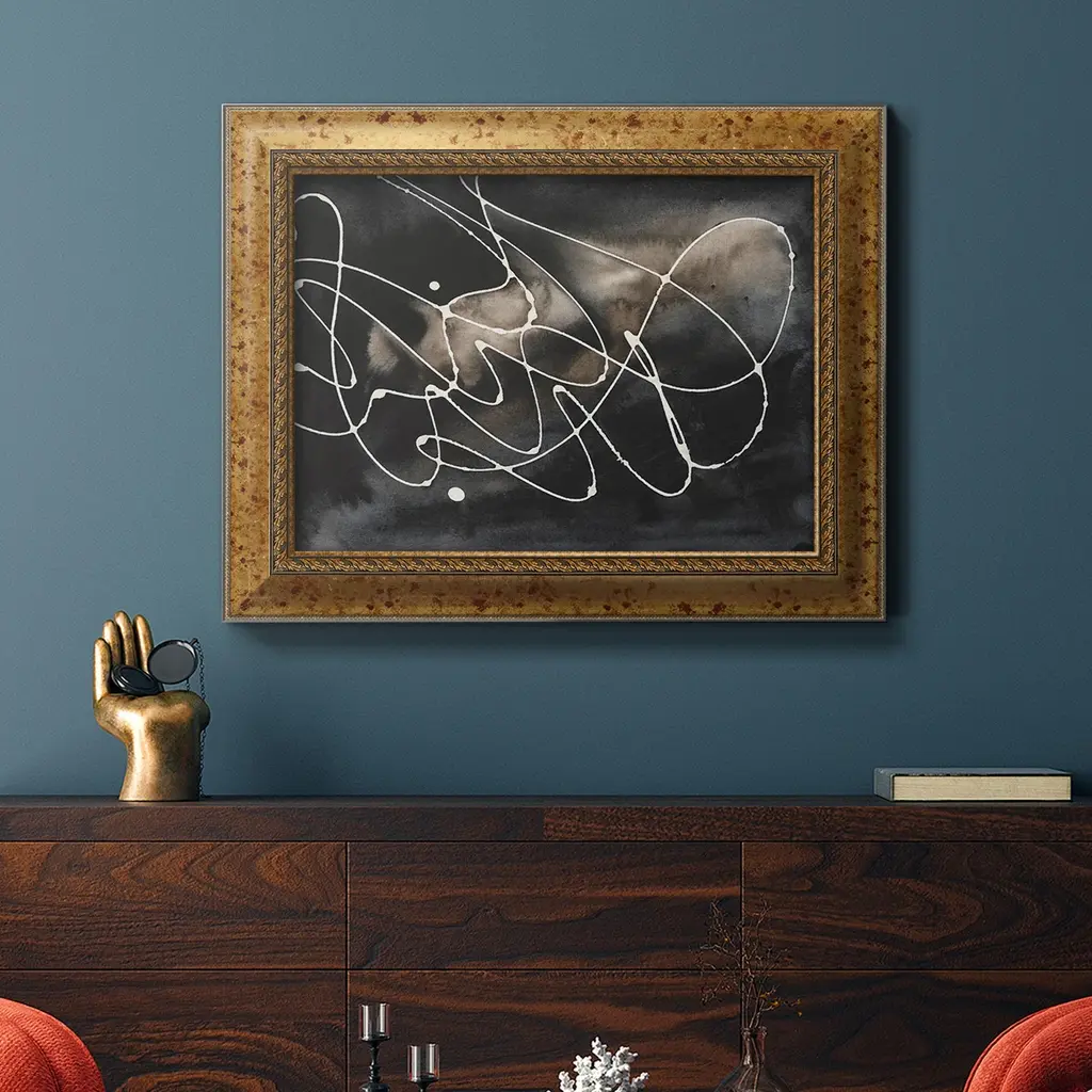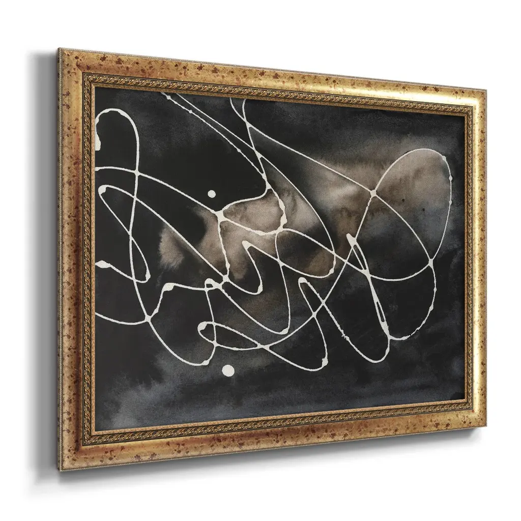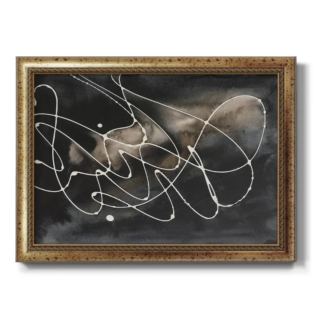 Midnight Swirl III Premium Framed Canvas- Ready to Hang A Premium Framed Canvas created to last. Framed in distressed wood and available in an array of sizes and colors Featuring a beveled a solid wood stretcher bar, each piece comes ready to hand 3 SIZES AVAILABLE 16''X20'' - Overall Size 18'X27'' - Overall Size 24''x36'' - Overall Size Each piece is made to order. Each piece comes with hanging hardware. Made in the USA Ready to Hang Giclee Paper Print Acrylic Glass Beveled Matt Board