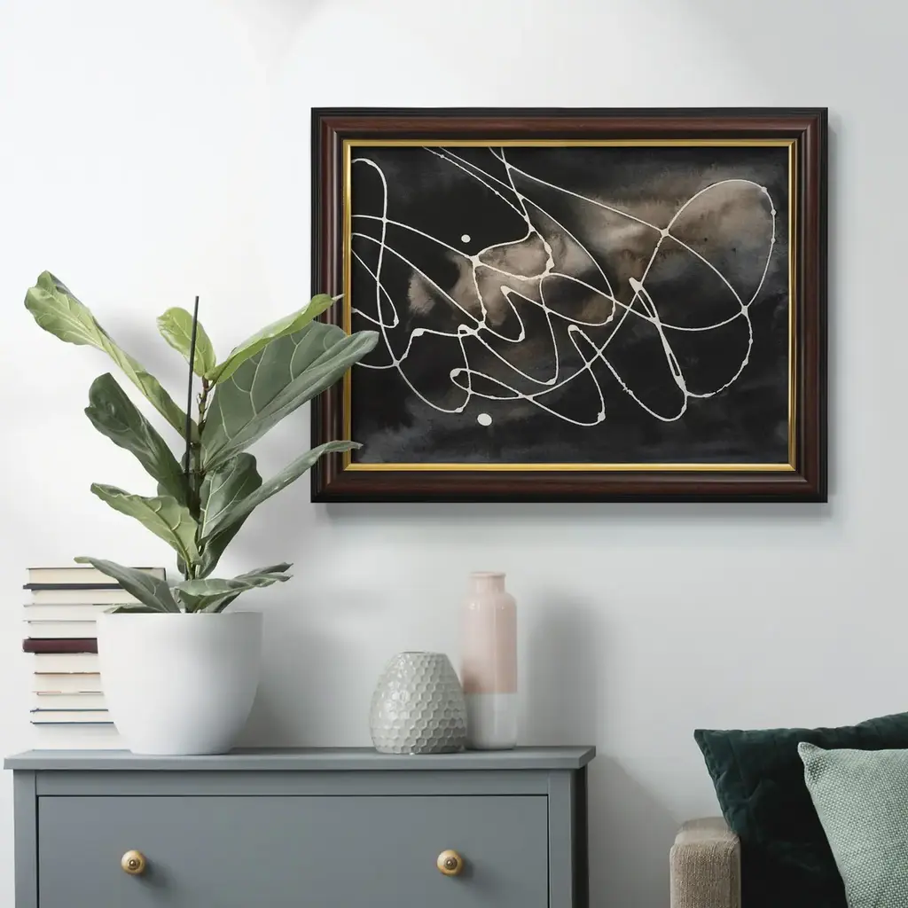 Midnight Swirl III Premium Framed Canvas- Ready to Hang A Premium Framed Canvas created to last. Framed in distressed wood and available in an array of sizes and colors Featuring a beveled a solid wood stretcher bar, each piece comes ready to hand 3 SIZES AVAILABLE 16''X20'' - Overall Size 18'X27'' - Overall Size 24''x36'' - Overall Size Each piece is made to order. Each piece comes with hanging hardware. Made in the USA Ready to Hang Giclee Paper Print Acrylic Glass Beveled Matt Board